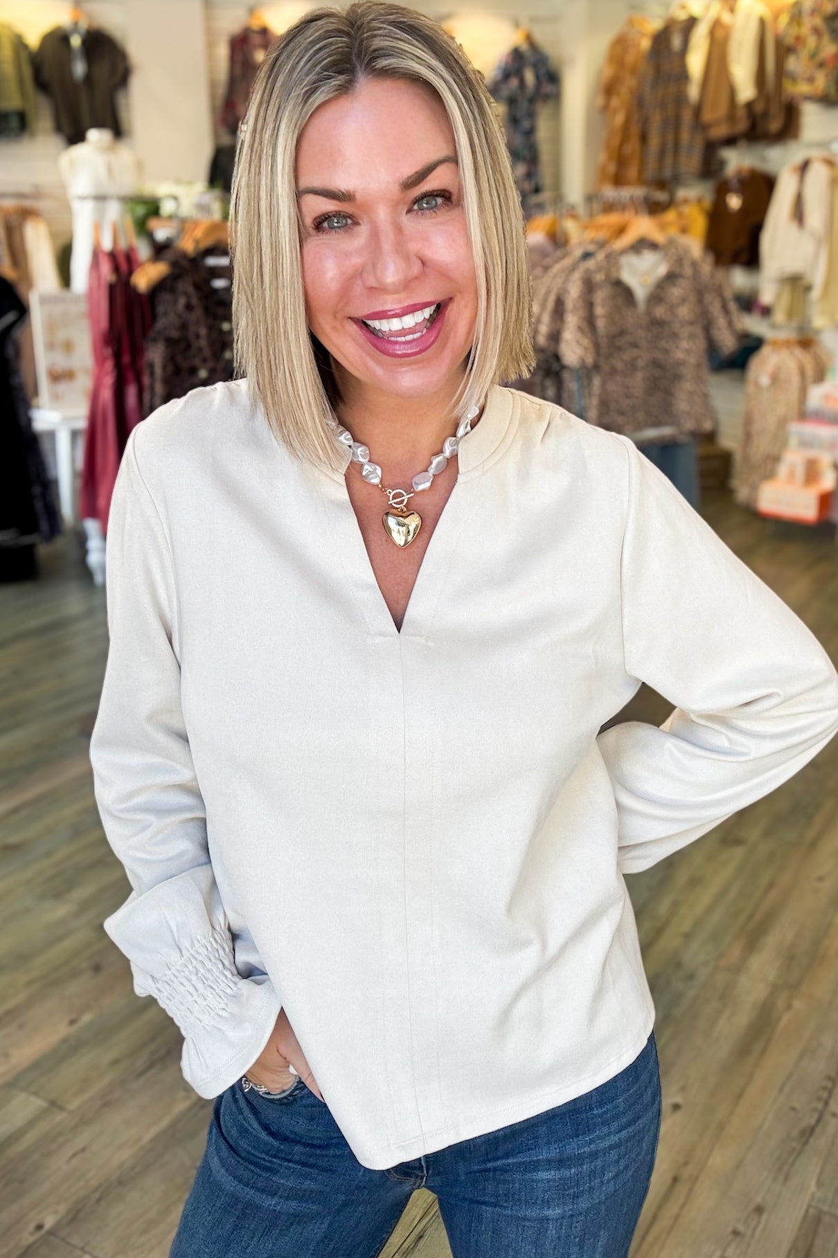 Cream Suede Long Sleeve Top
