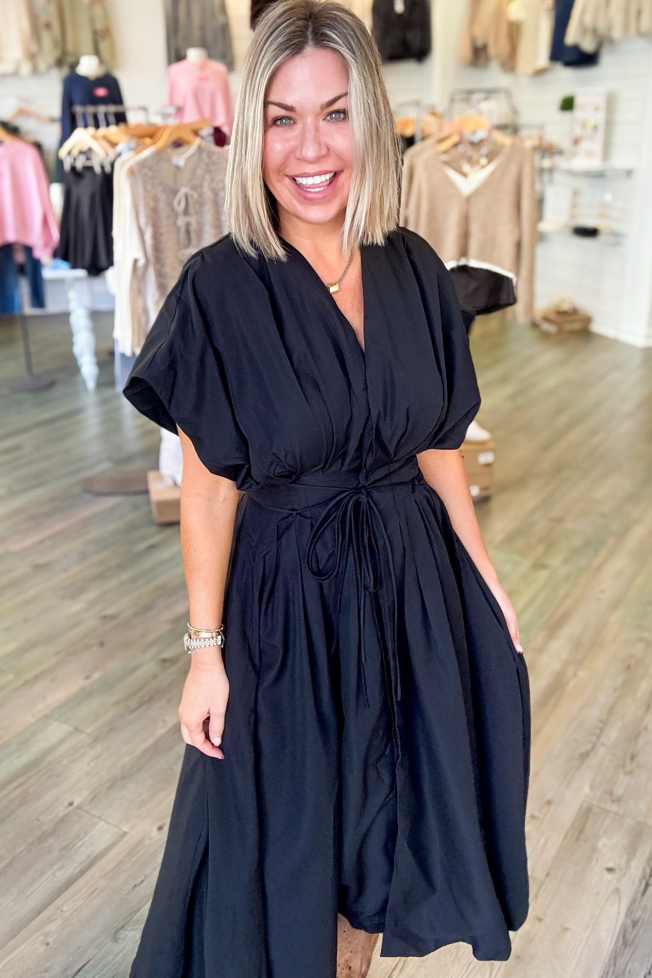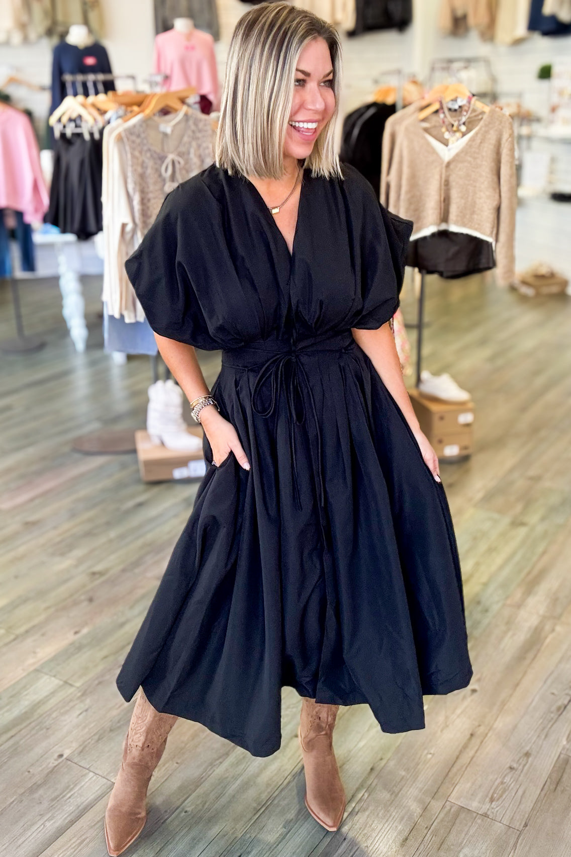 Lacey Black Pleated Midi Dress