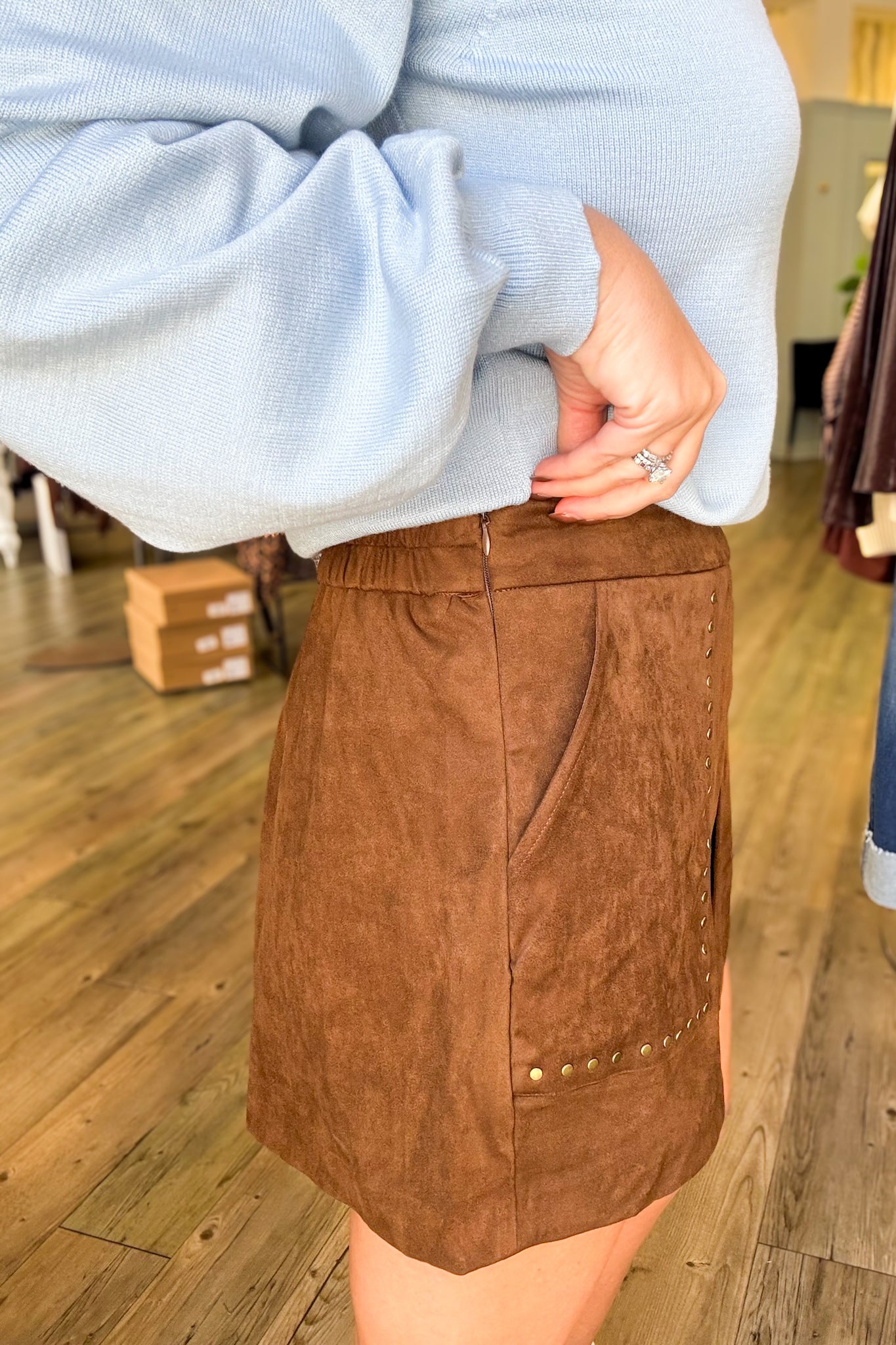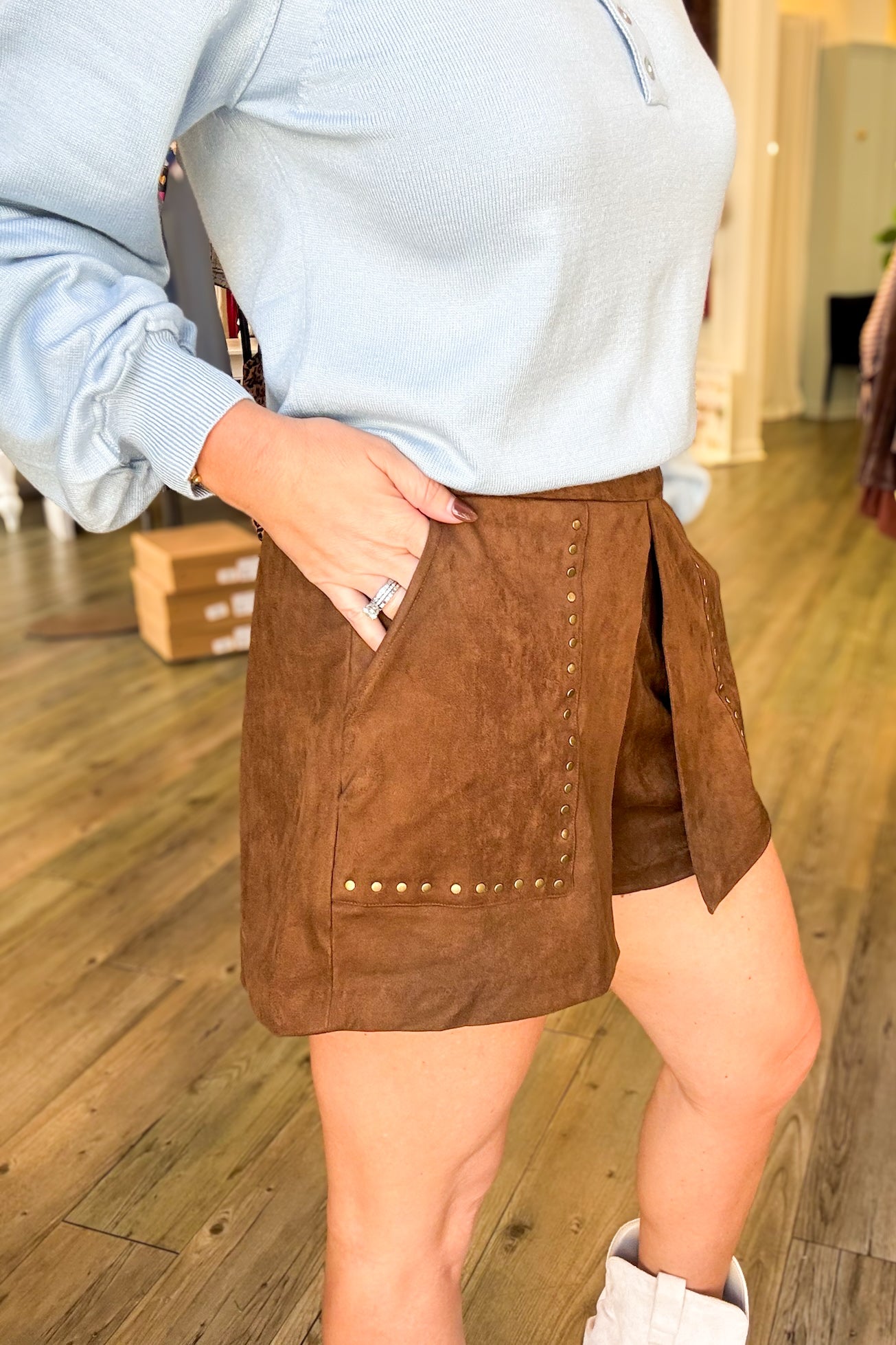 These Berry Studded Shorts combine style and comfort with a rich brunette brown suede finish. Designed with practical front pockets and a convenient side zipper, they offer easy wear while adding an edgy touch with studded detailing. Perfect for elevating casual looks, these shorts provide both functionality and fashion in one confident piece.