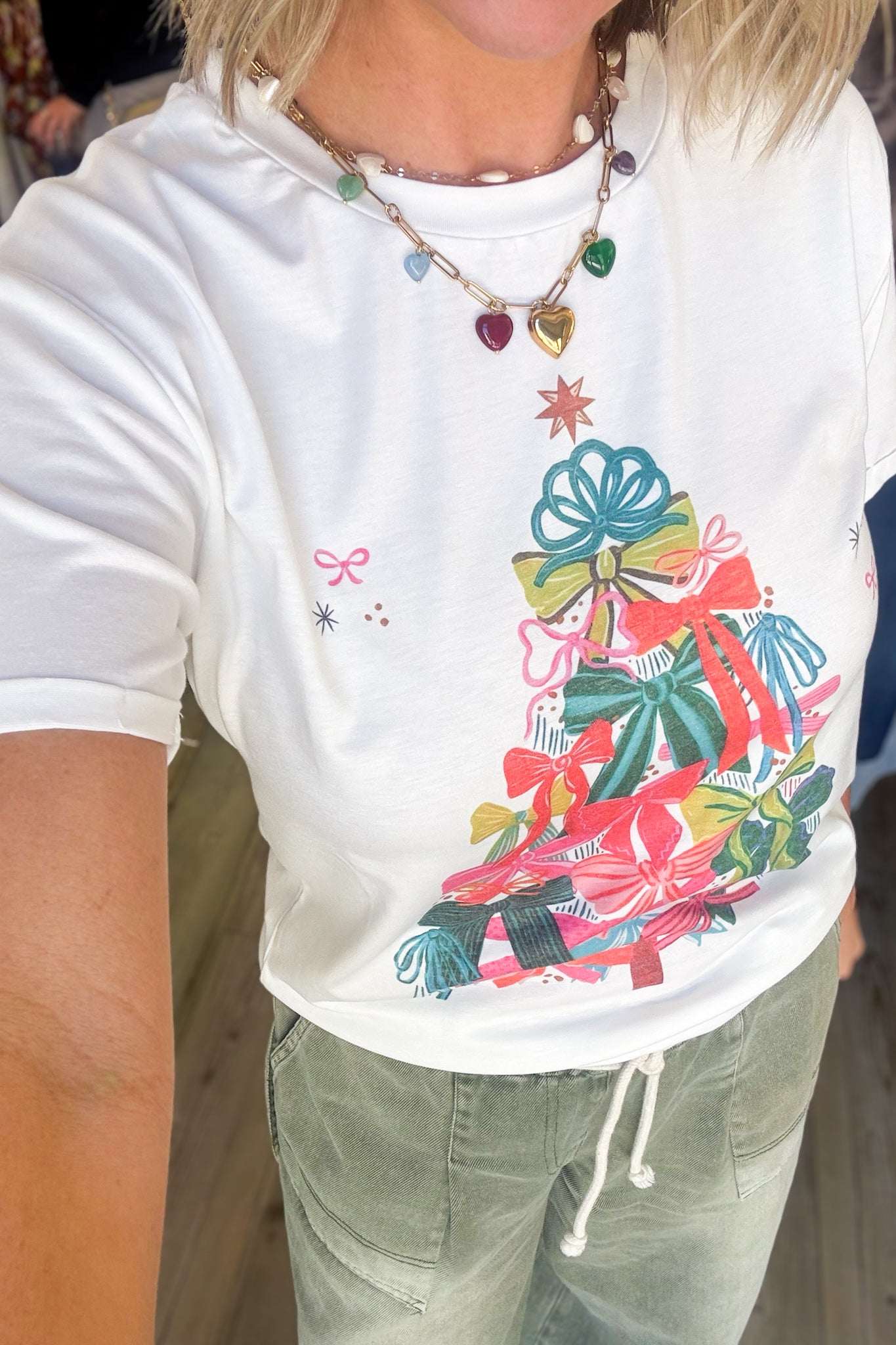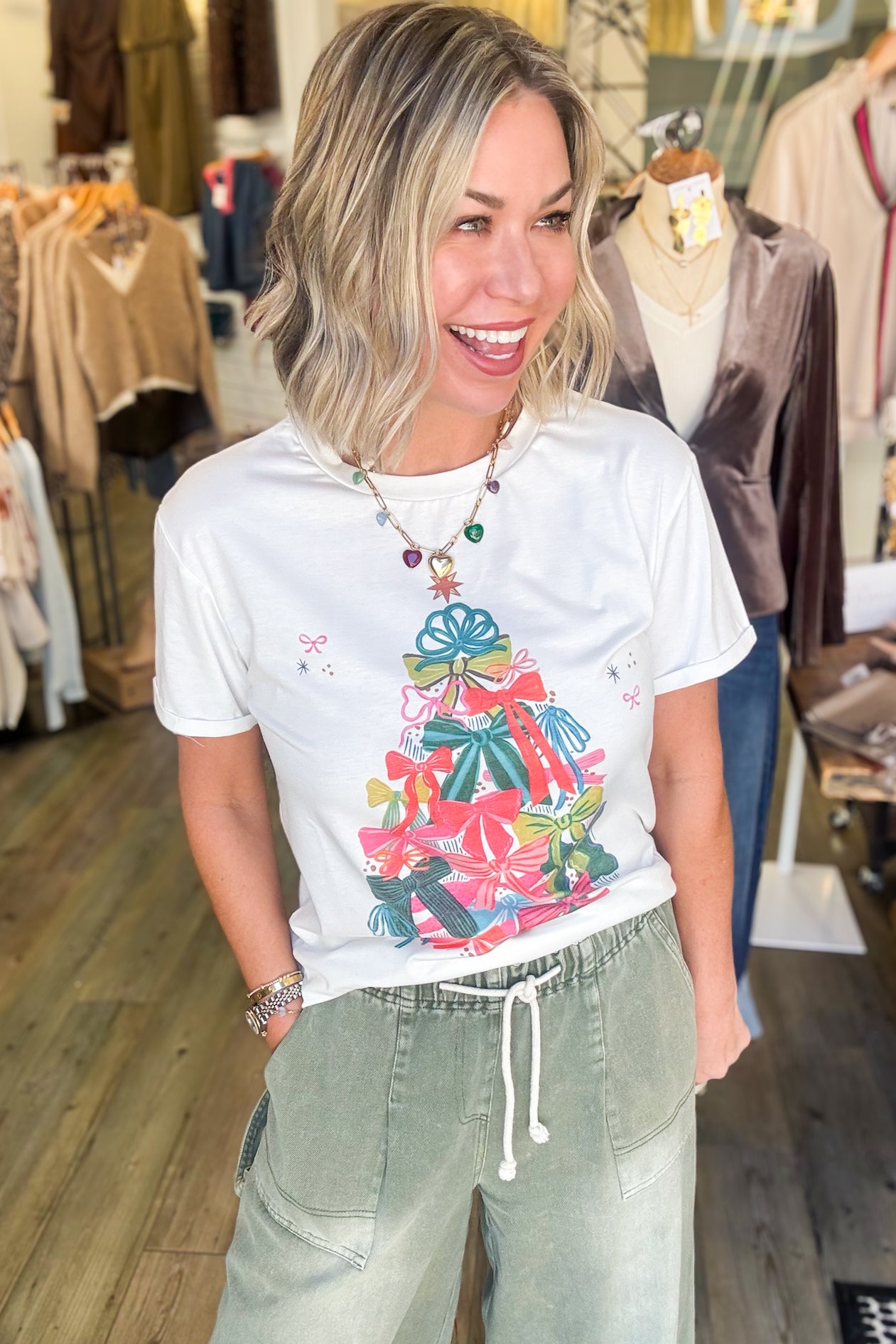 The Bow Christmas Tree White Tee features a charming holiday design with a Christmas tree crafted from colorful bows, set against a clean white background. Its comfortable round neck and classic fit make it easy to wear, while the option to size down ensures you get the perfect silhouette. Celebrate the season with festive style and a cozy feel in this unique holiday tee.