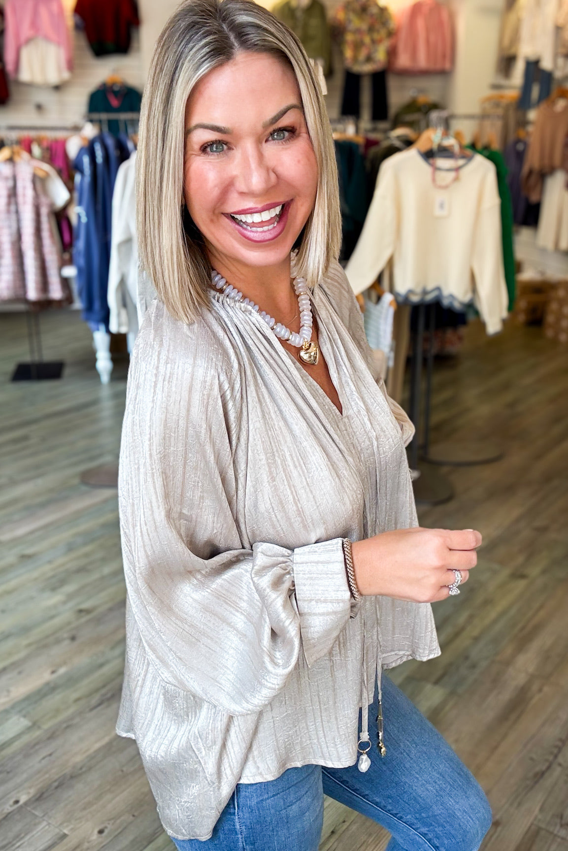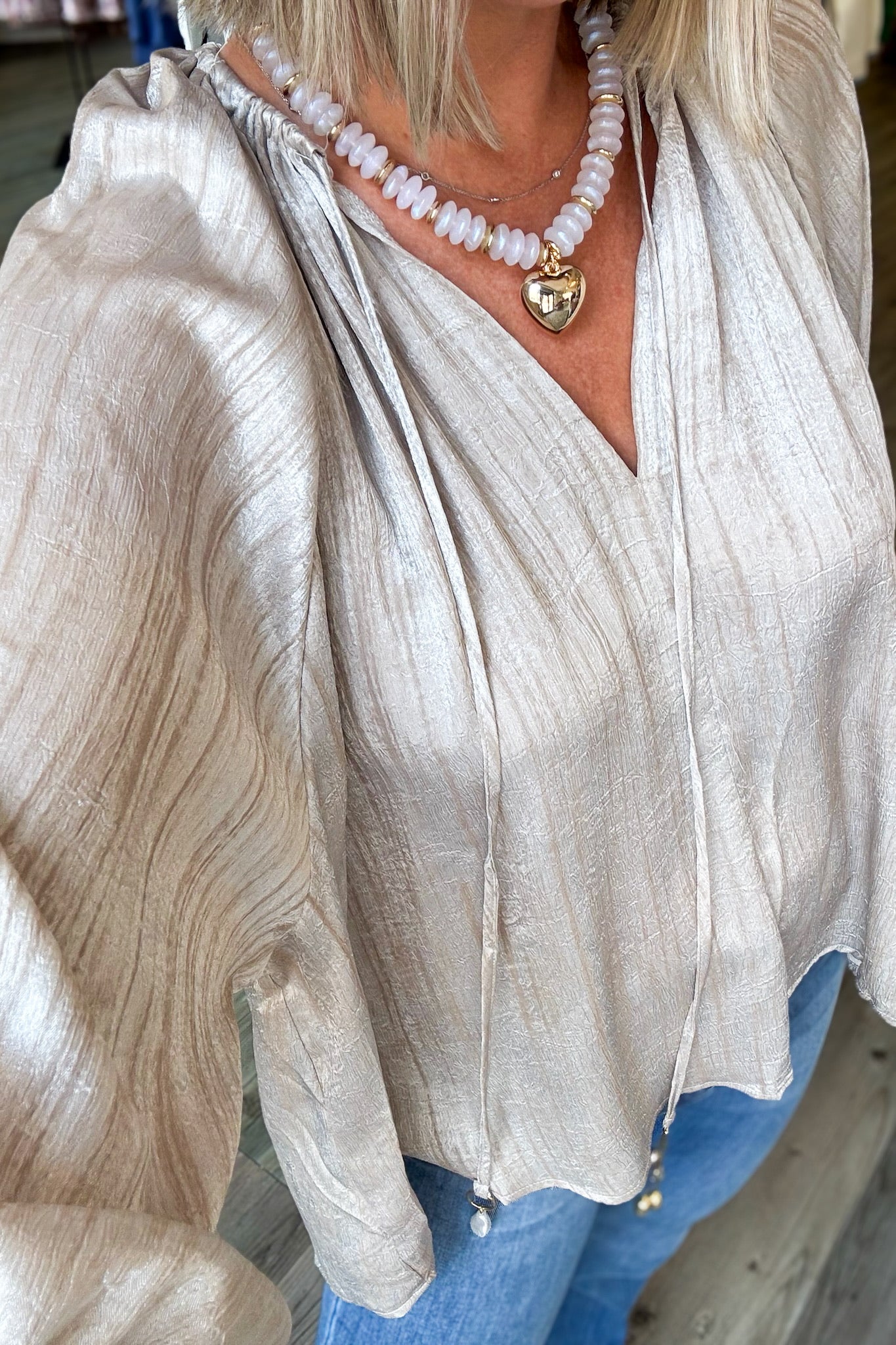 The Brooke Silver Blouse features a flattering V-neck and long sleeves with cuffs for a polished look. Its silver fabric is enhanced by elegant pearl and gold charms adorning the tie, adding a subtle touch of sophistication. This blouse effortlessly combines style and comfort, making it a versatile choice for both professional and casual occasions.