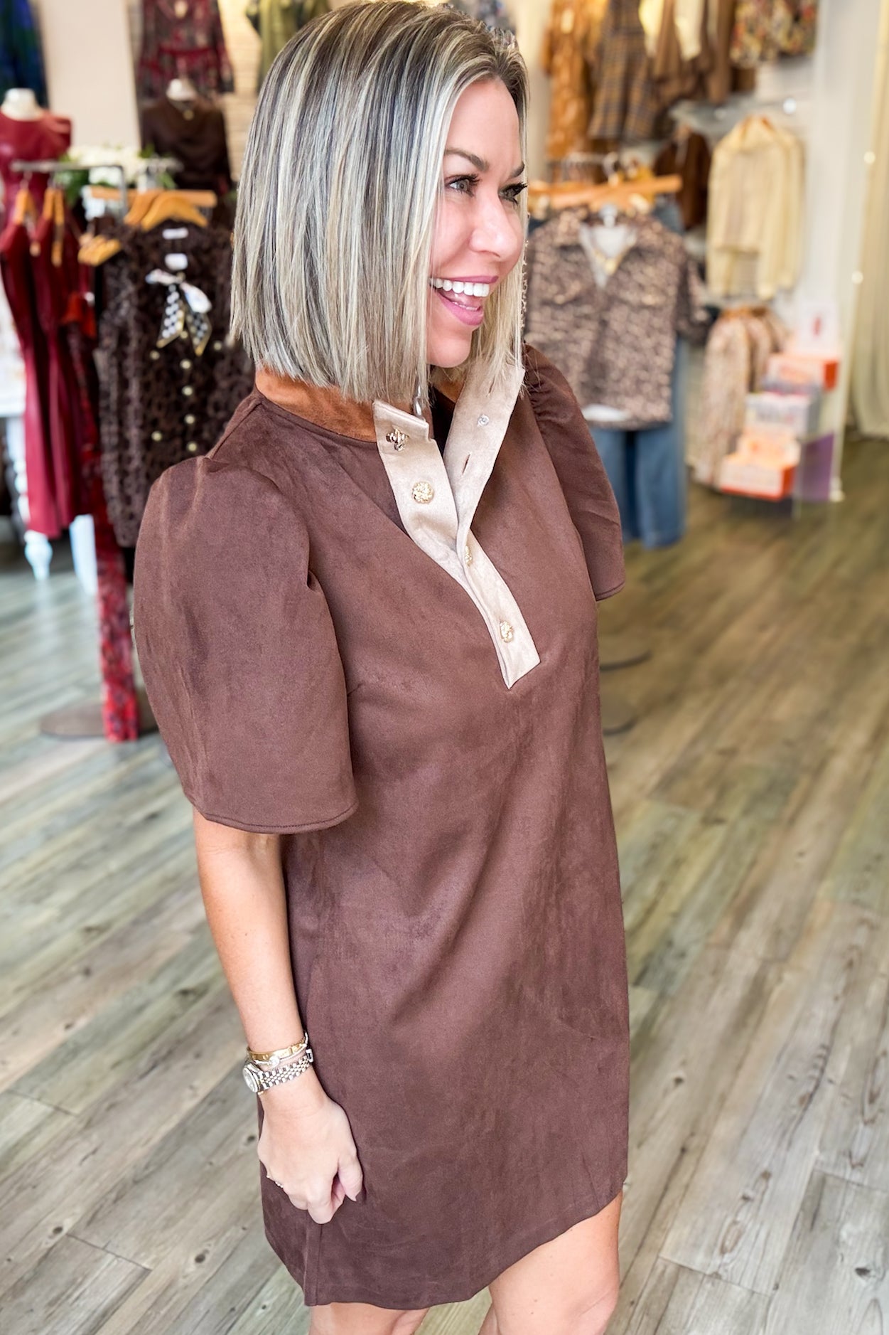 This Brownie Suede Mini Dress features rich chocolate brown suede contrasted with camel suede on the collar for a refined look. The short sleeves and gold knot button detail add subtle elegance, making it perfect for both day and evening wear. Designed to fit comfortably, you can size down for a more tailored silhouette. Embrace timeless style with this versatile, flattering dress.