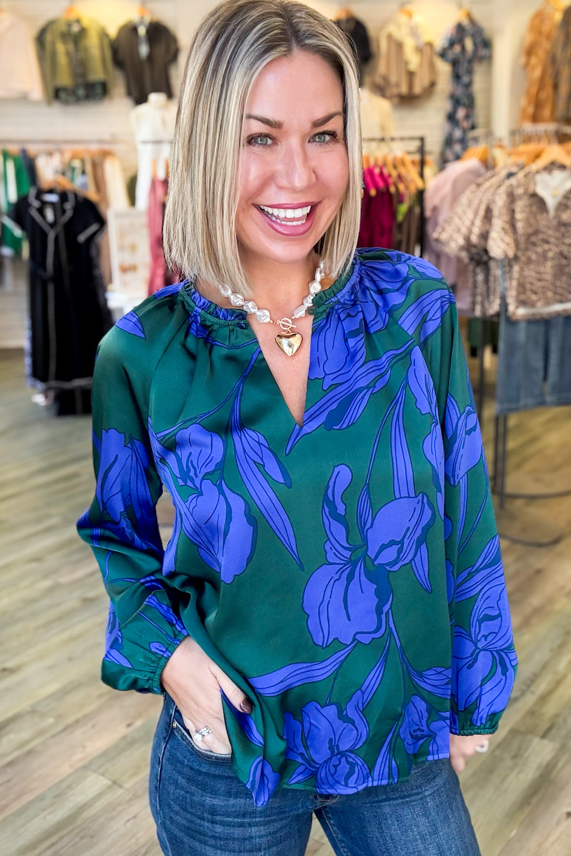 The Busbee Floral Blouse features a refreshing blue and green color palette and delicate floral patterns. Its long sleeves provide comfortable coverage, while the keyhole button front adds a subtle, stylish touch. This blouse combines classic design with feminine details, making it a versatile choice for both workdays and casual outings. Enjoy effortless elegance and a flattering fit every time you wear it.