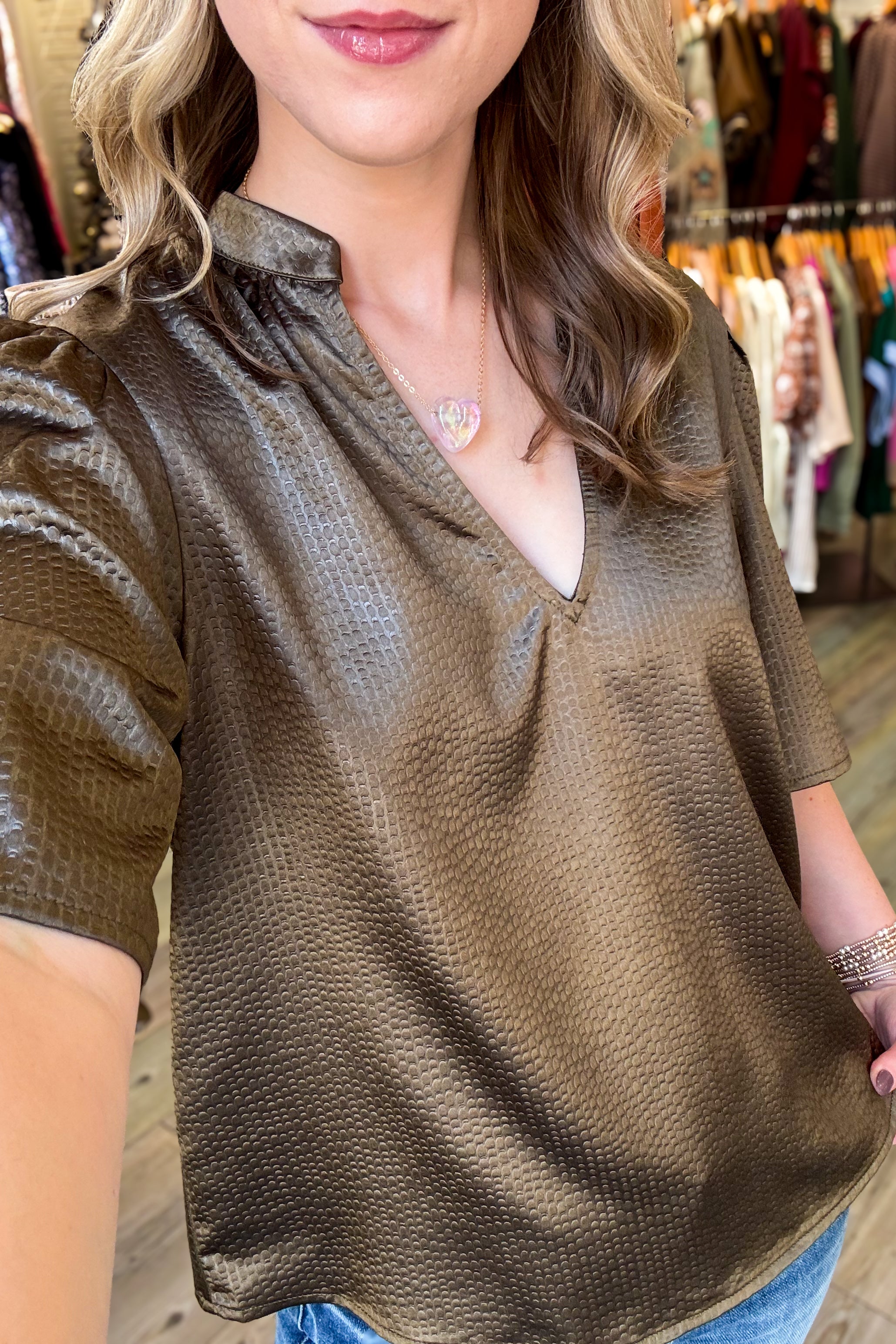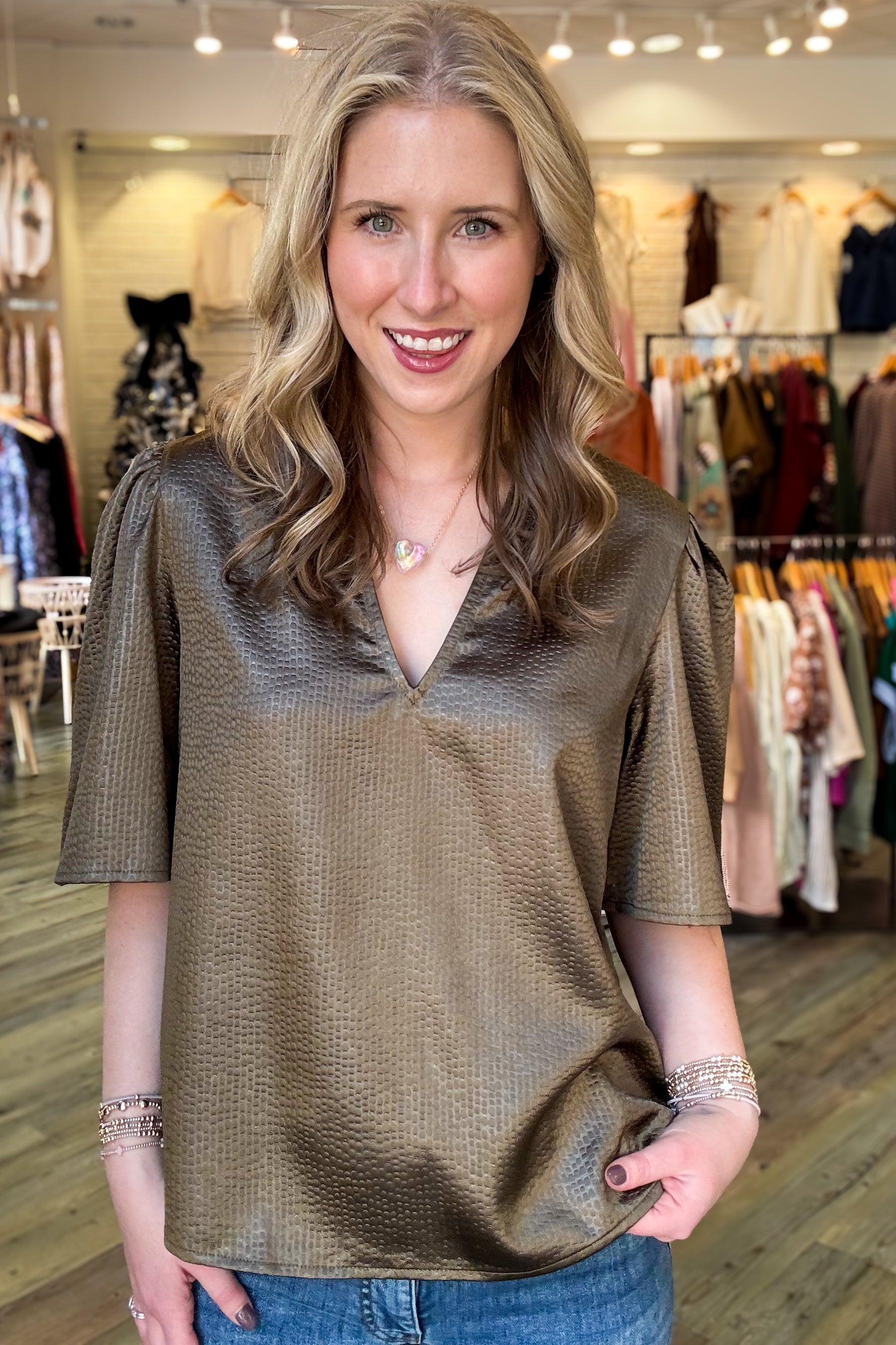 The Camden Textured Blouse features a flattering v-neck and short sleeves, crafted from a comfortable textured fabric in a versatile olive shade. Its lightweight design keeps you comfortable throughout the day, while the unique texture adds subtle style to any outfit. Perfect for layering or wearing on its own, this blouse offers a polished look with ease.
