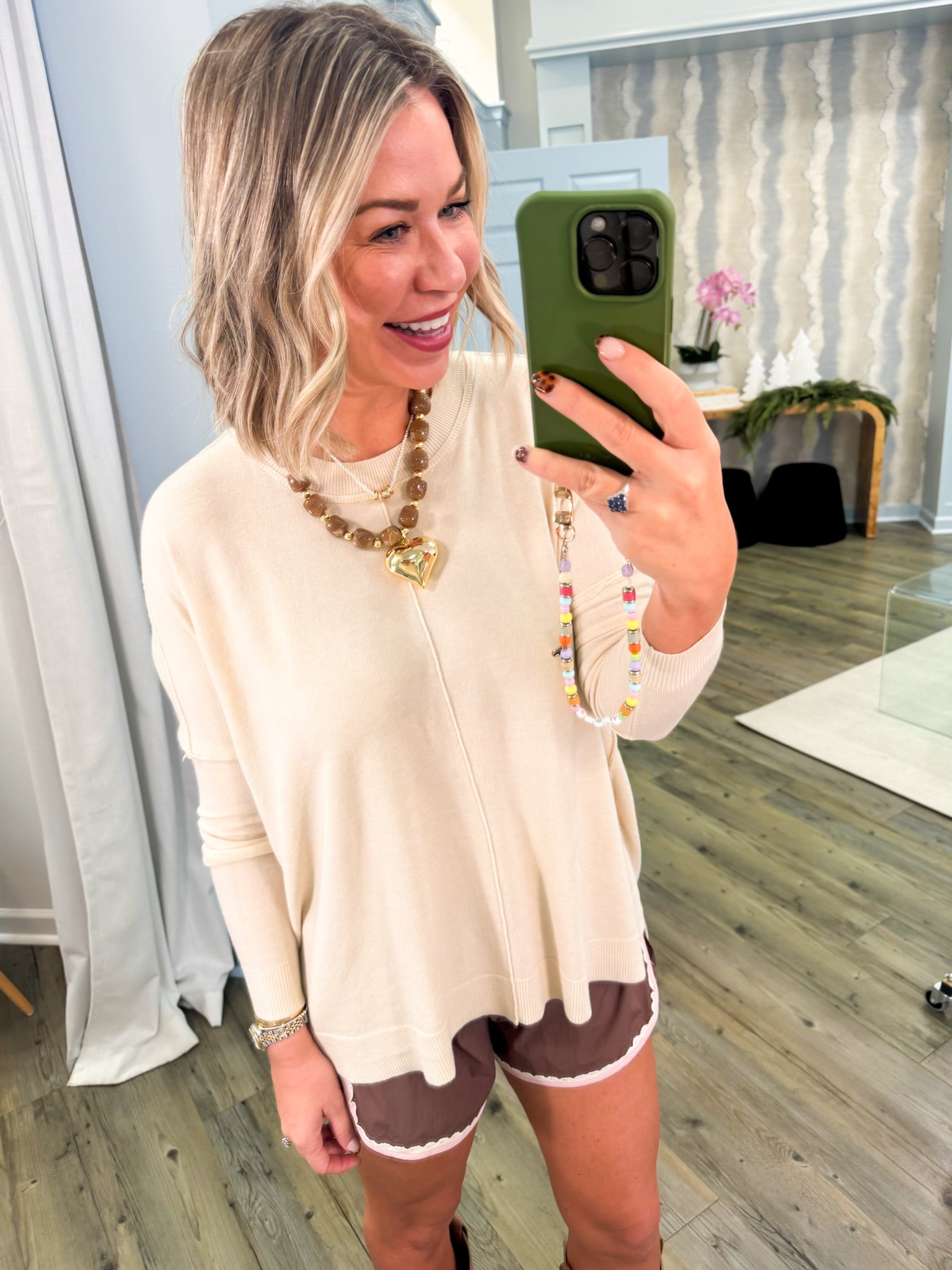 Wrap yourself in the cozy comfort of this oatmeal crew sweater, crafted from a luxurious cashmere blend that feels as good as it looks. The neutral tone pairs effortlessly with any outfit, making it a versatile staple for your everyday wardrobe. Perfect for layering on cooler days or wearing solo when you want understated elegance. This timeless piece delivers softness and warmth without the fuss, so you can feel confident and comfortable all day long.