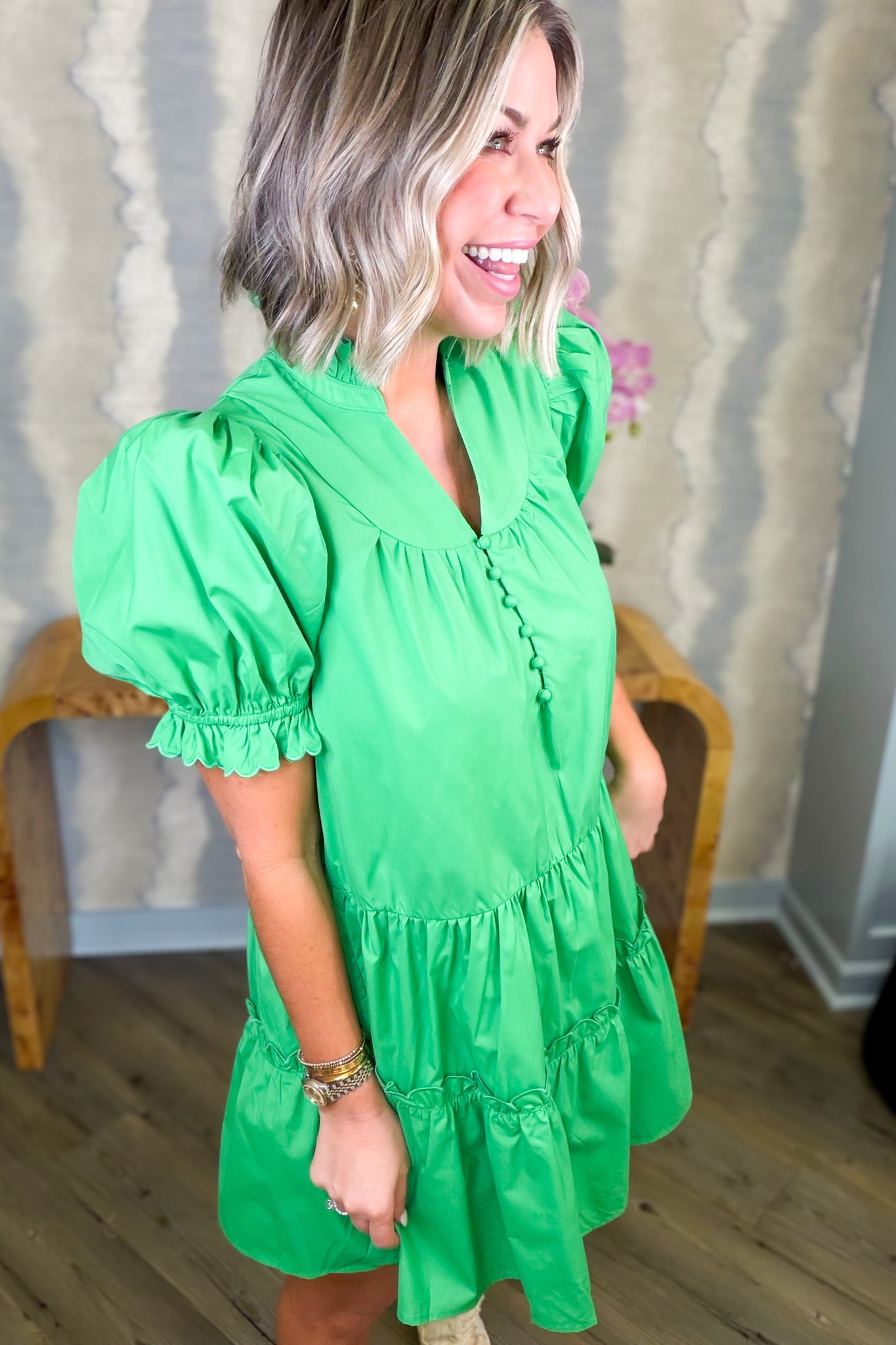 The Cassidy Flowy Mini Dress is your new go-to for effortless style. This charming green dress features a classic collar, delicate scallop detailing, and functional button accents that add personality to every wear. Best of all? It has real pockets—because who doesn't love that? The relaxed, flowy fit keeps things comfortable while the playful design works for casual outings or weekend adventures. Runs true to size.