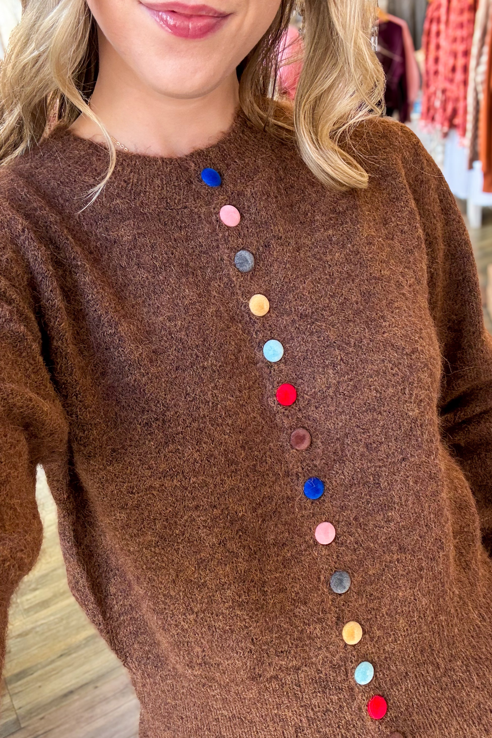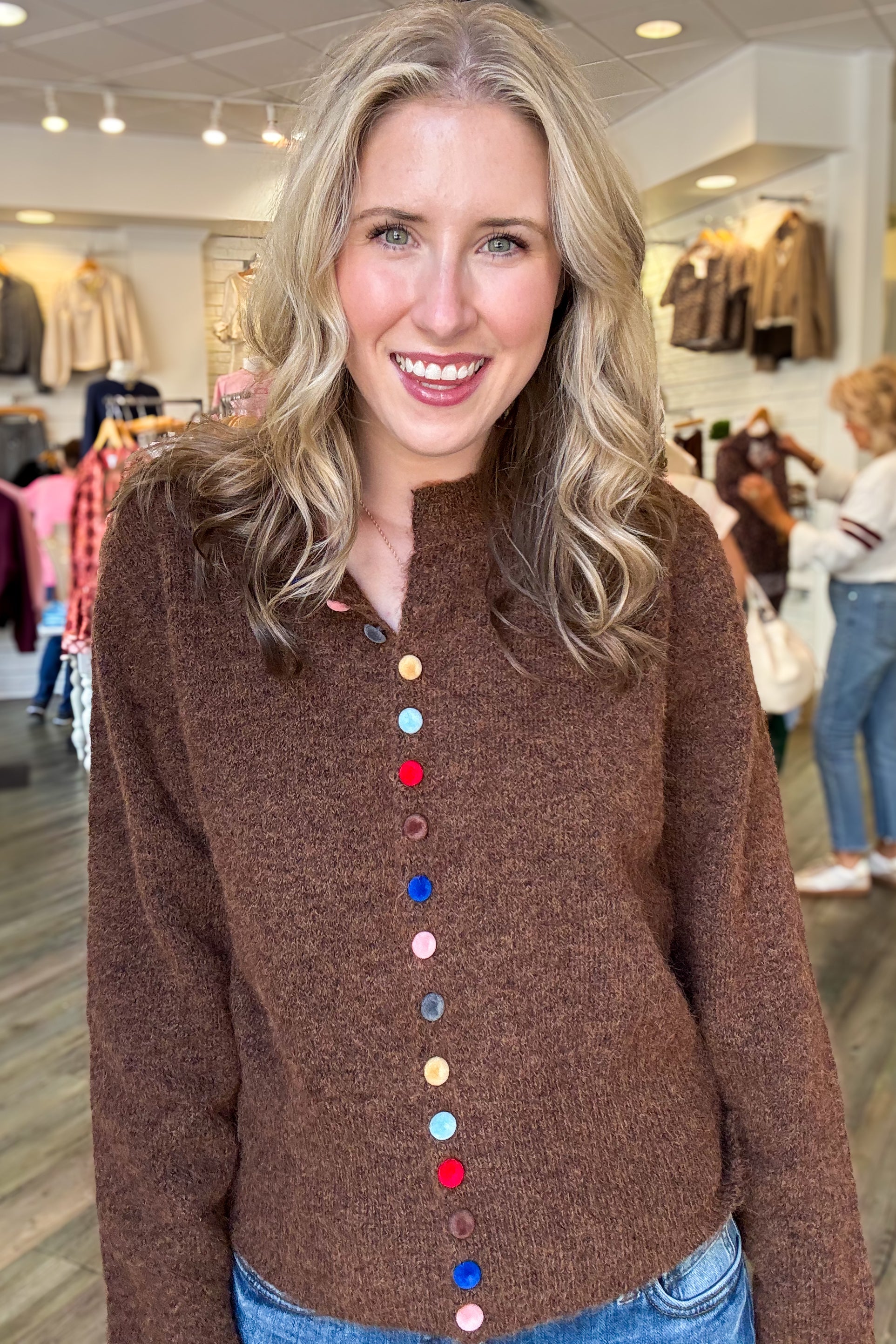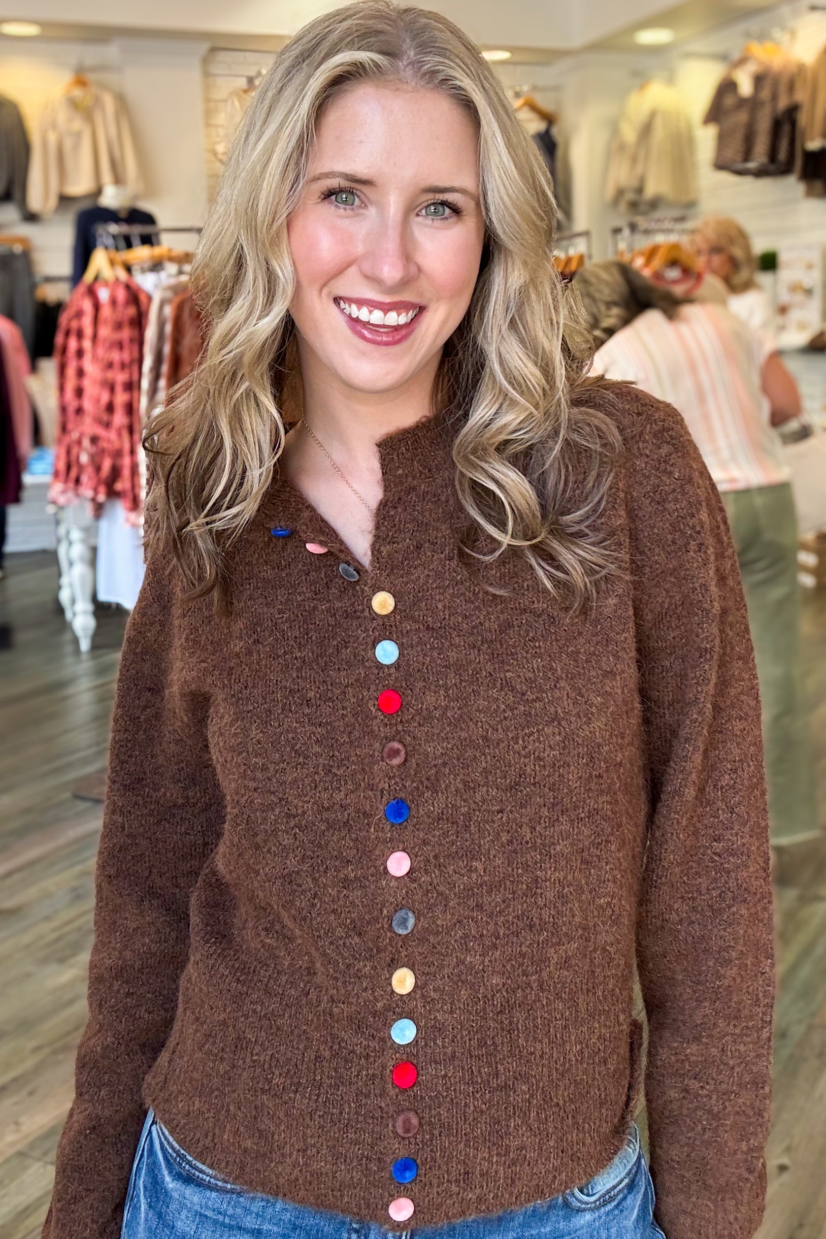 This Charlee Brown Cardigan features a cozy knitted texture in a warm brown shade, accented by colorful buttons for a playful touch. Its long sleeves and true-to-size fit make it an easy choice for layering comfortably throughout the day. Perfect for adding both warmth and style to your wardrobe.