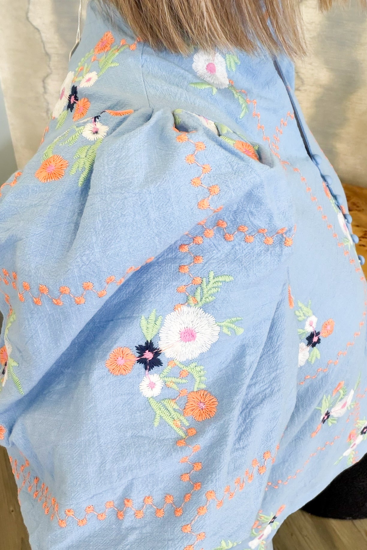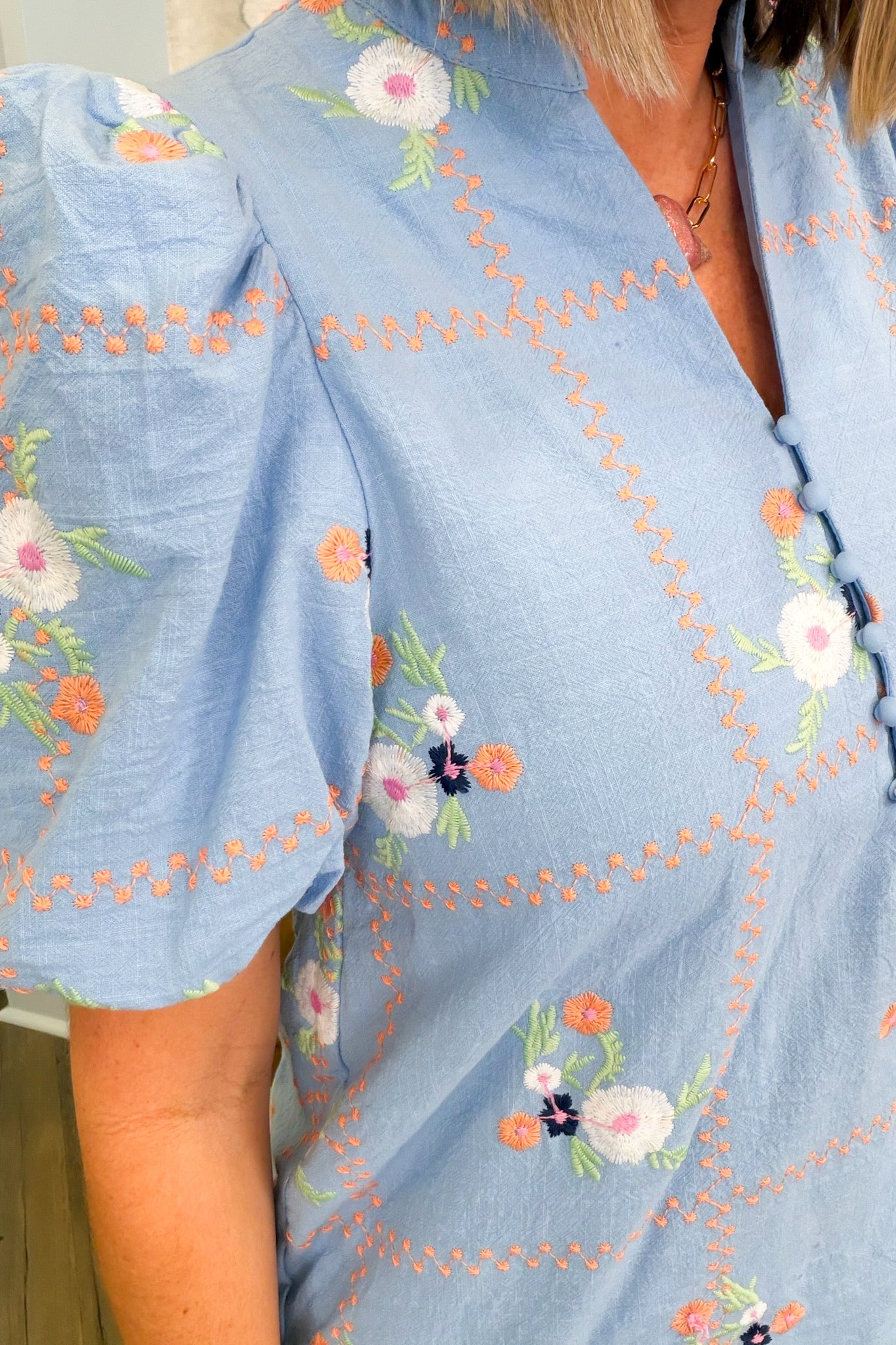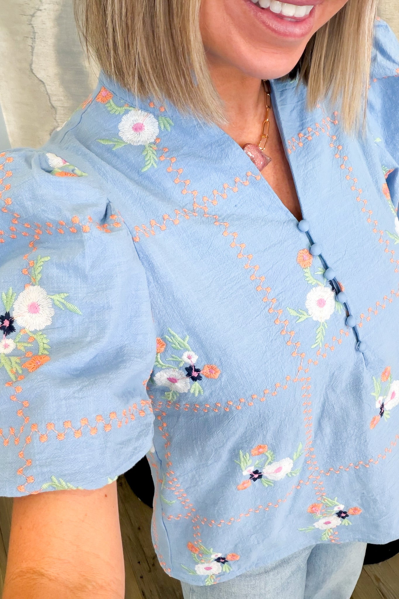 Brighten your wardrobe with the Charlee Spring Blouse, a cheerful blue base adorned with vibrant orange, pink, green, and white florals. This charming piece features a flattering V-neckline, classic collar, and playful puff sleeves that add just the right amount of personality. Perfect for spring days and casual outings, it pairs effortlessly with your favorite jeans or skirts. Runs true to size for an easy, comfortable fit.