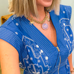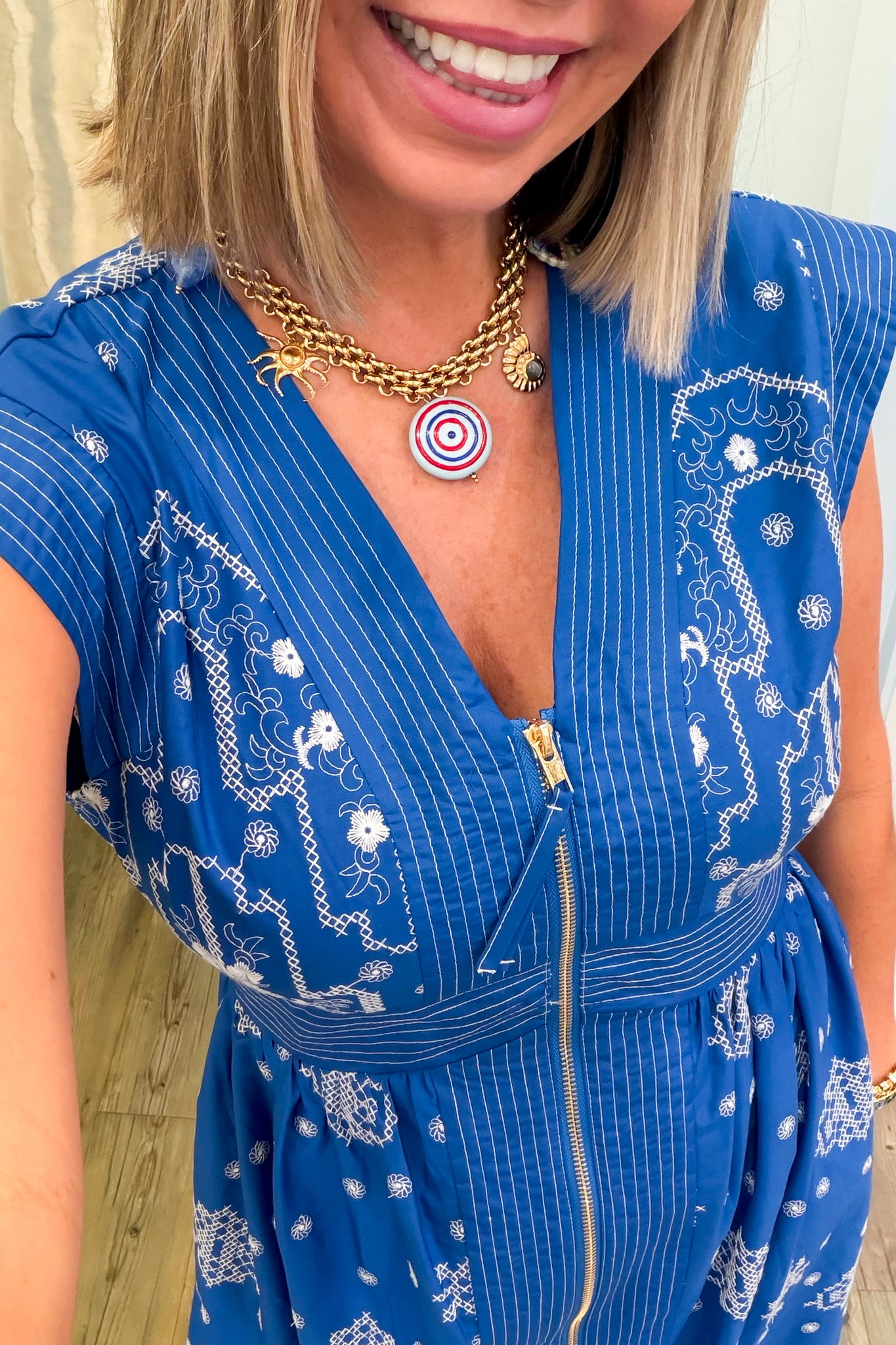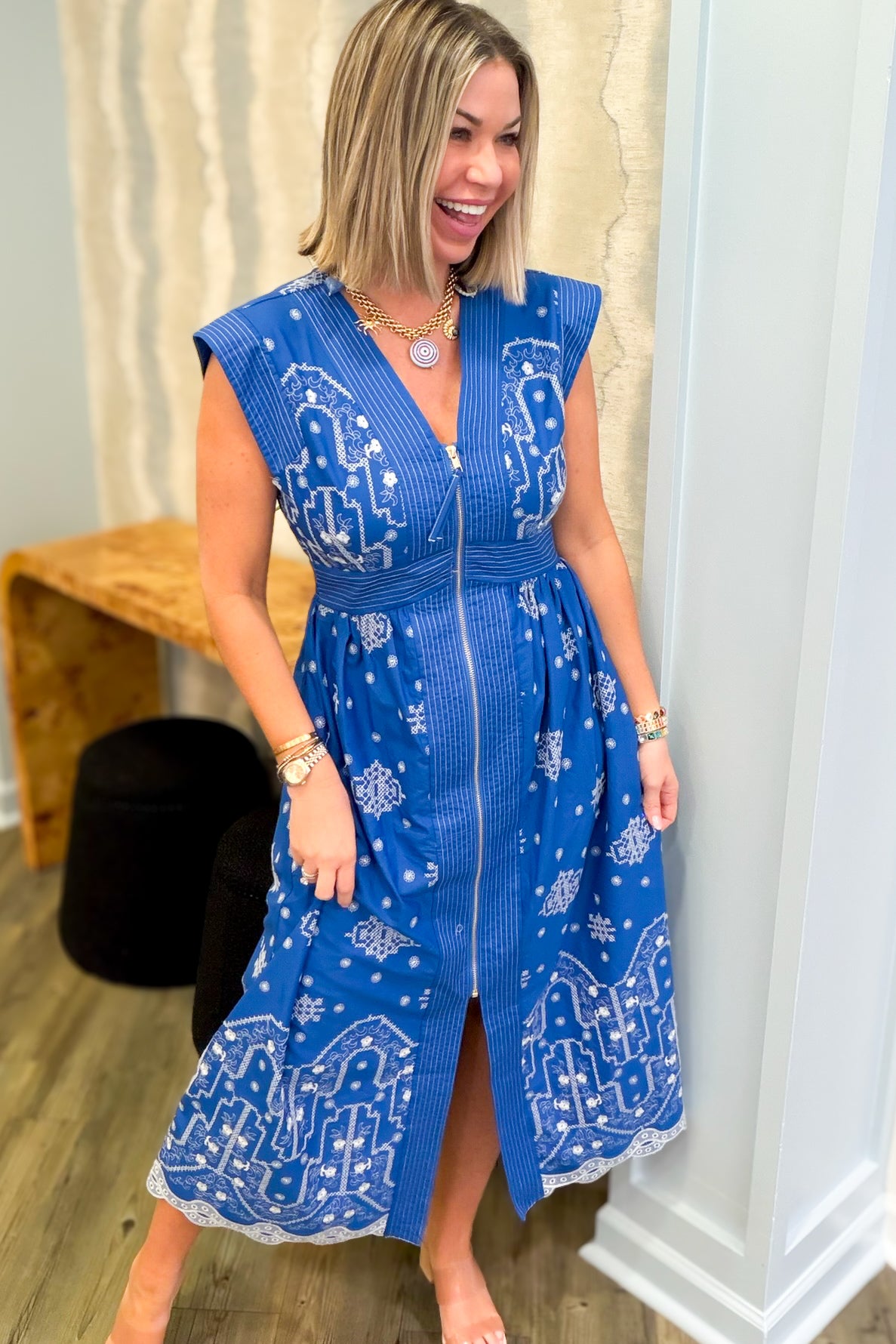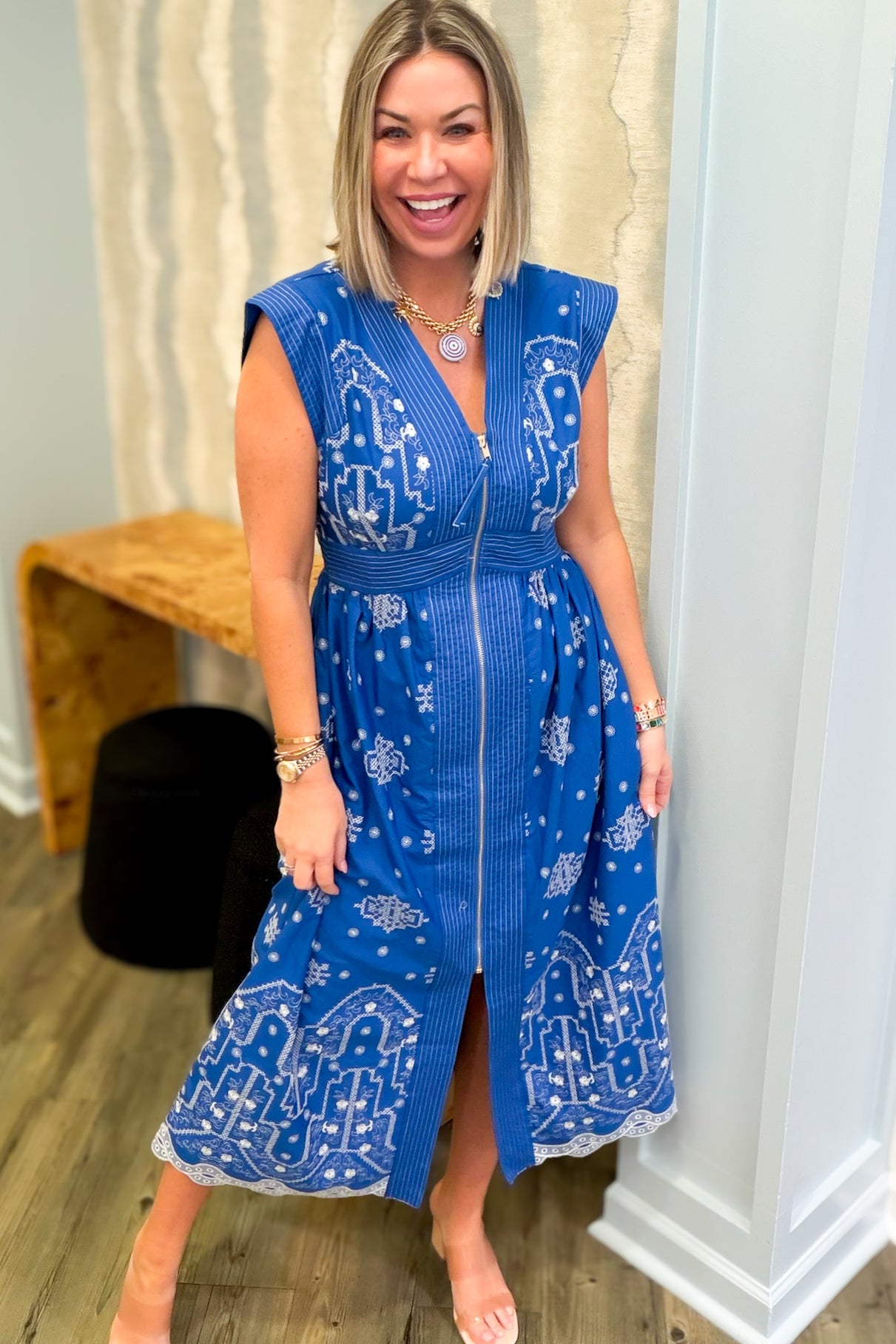 Slip into effortless elegance with the Charlene Zip Up Midi Dress. This stunning blue midi features a bold gold zipper running the full length, making it as fun to take off as it is to wear. The sleeveless V-neck design keeps things breezy and chic, while the cinched waistband flatters your silhouette beautifully. Perfect for everything from brunch to evening plans, this dress runs true to size for a flawless fit every time.