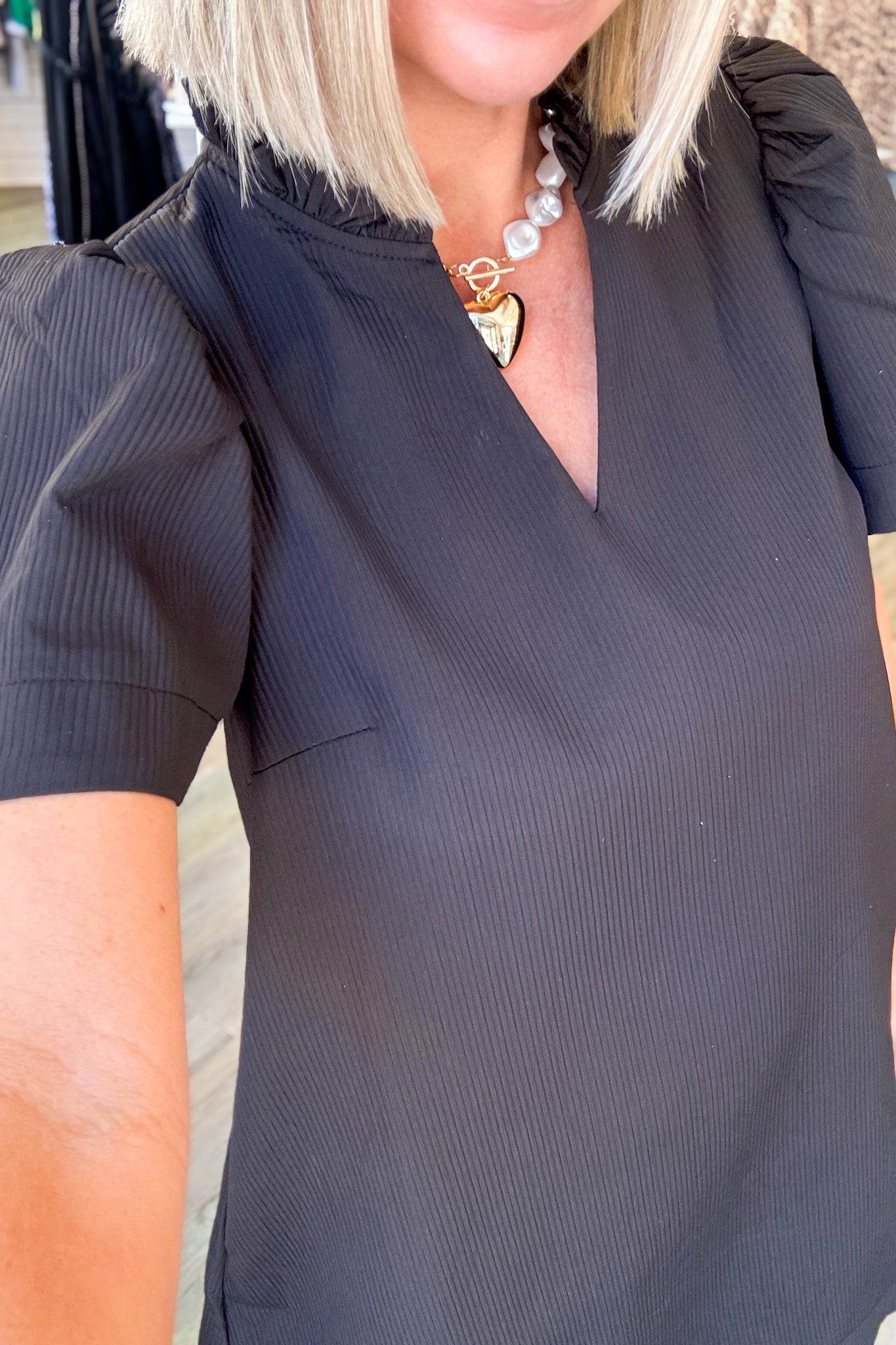Elevate your wardrobe with this Chic Black Textured Mini Dress. Featuring flutter sleeves, a flattering V-neck, and a delicate ruffle collar, it offers effortless style for any occasion. Designed to run true to size, this dress combines comfort and flattering details, making it a versatile choice for day or night wear.