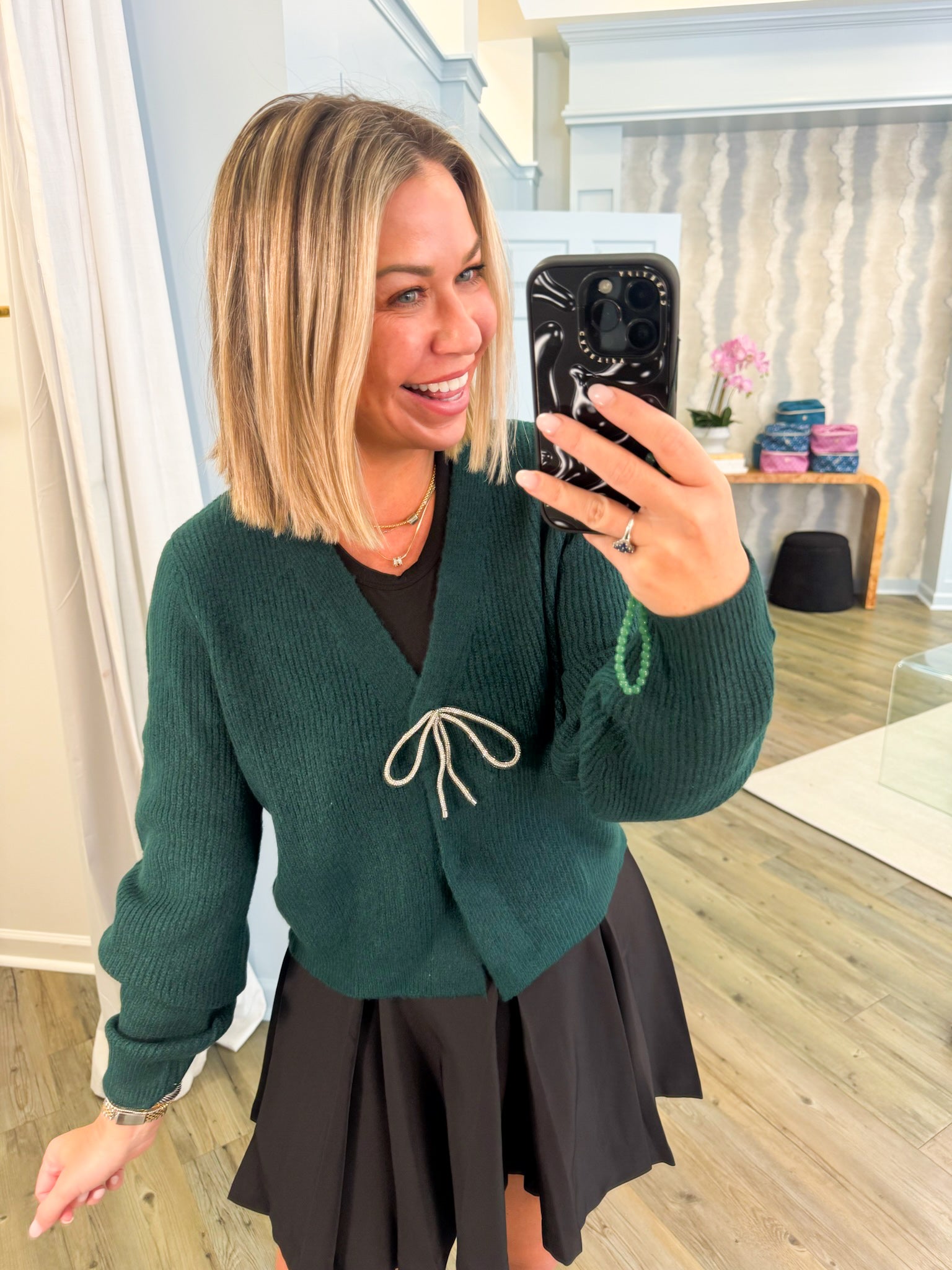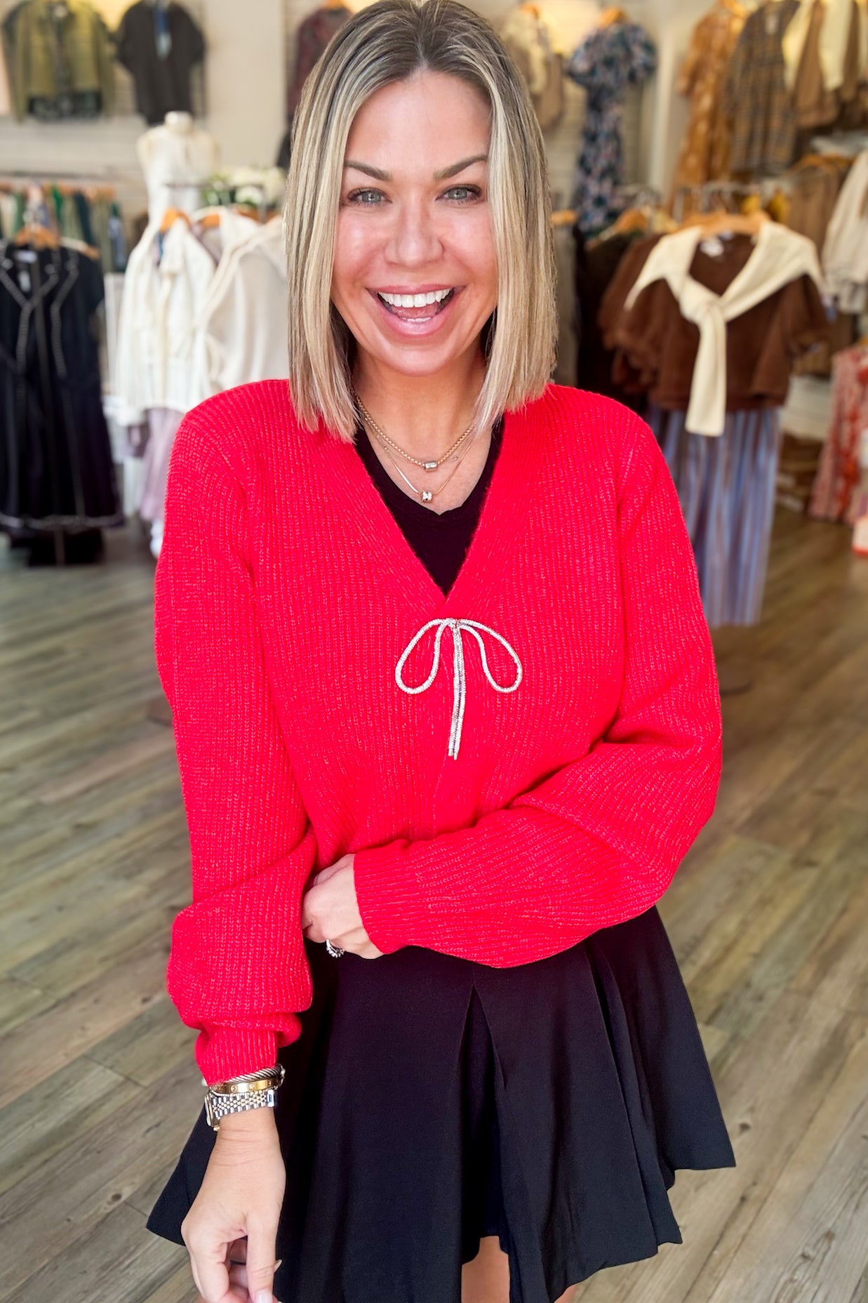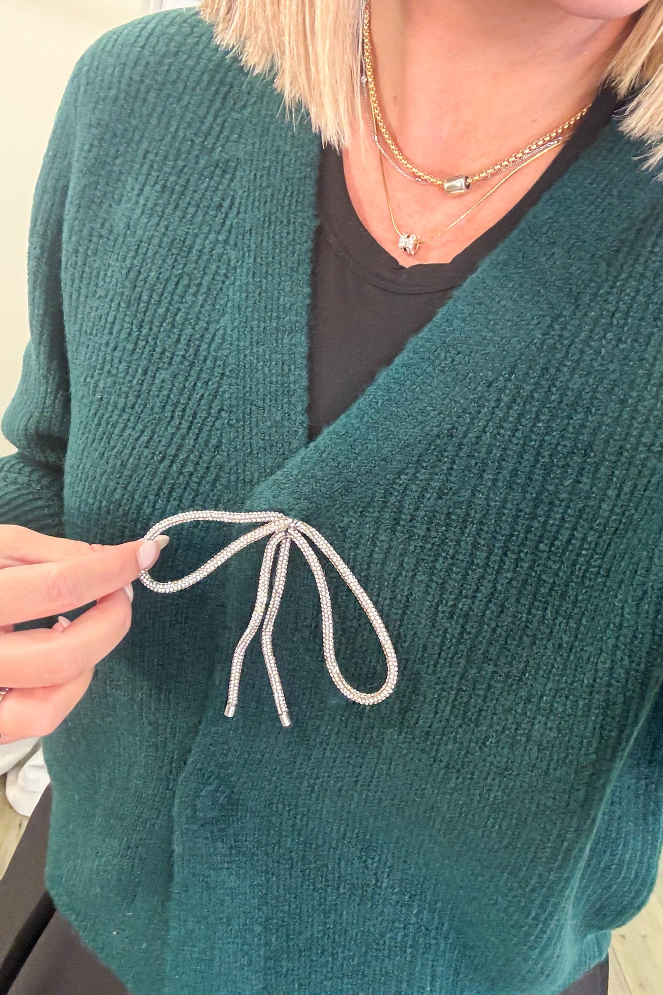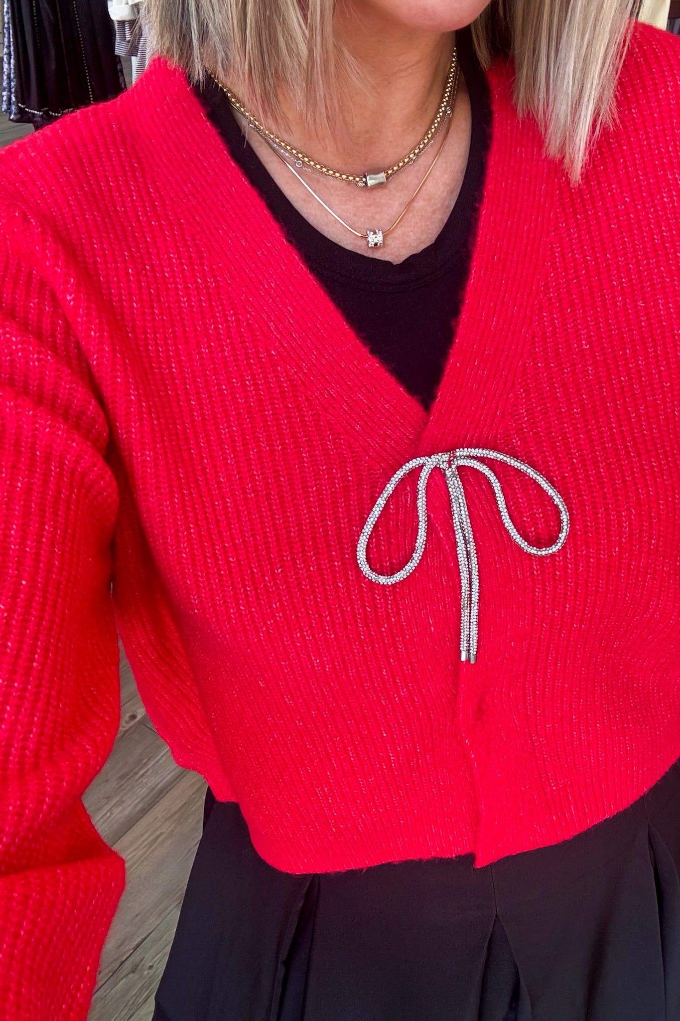 The Clara Cardigan offers a cozy, solid knit design with a sleek look thanks to hidden buttons. Its elegant rhinestone bow detail at the chest adds a subtle touch of sparkle, making it perfect for both casual and dressier occasions. This cardigan blends comfort with a refined style, ensuring you feel confident and polished wherever you go.