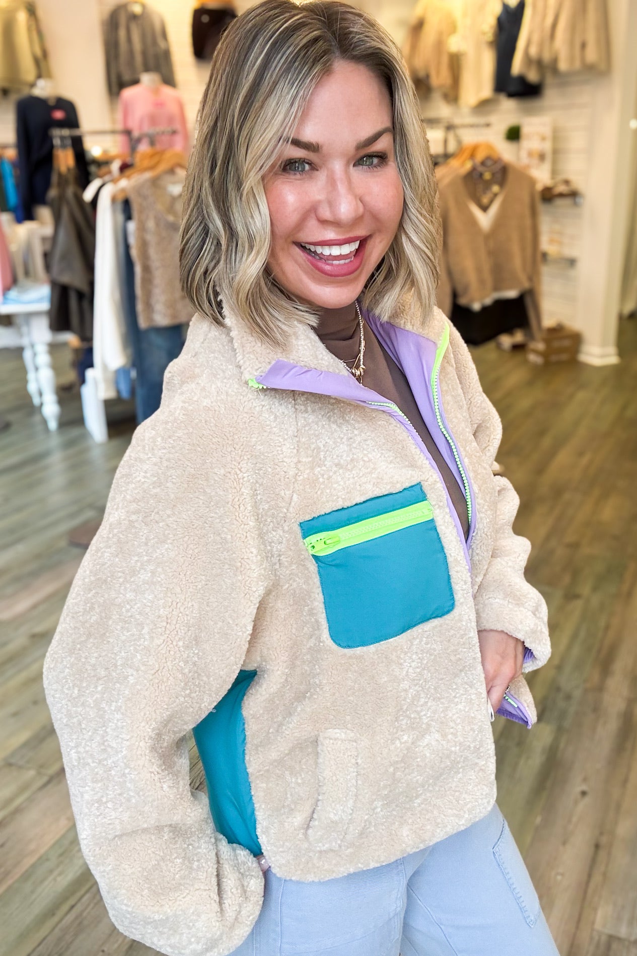 Step back in time with this vibrant color block retro fleece jacket that brings nostalgic style to your everyday wardrobe. Crafted from soft, cozy fleece, it's perfect for layering on cooler days while keeping you comfortable and warm. The standout feature? A functional front zip pocket that keeps your essentials secure and within easy reach. Whether you're channeling 90s vibes or just love that classic retro aesthetic, this jacket delivers both style and practicality. A versatile piece that works whether you're running errands or hanging out with friends.