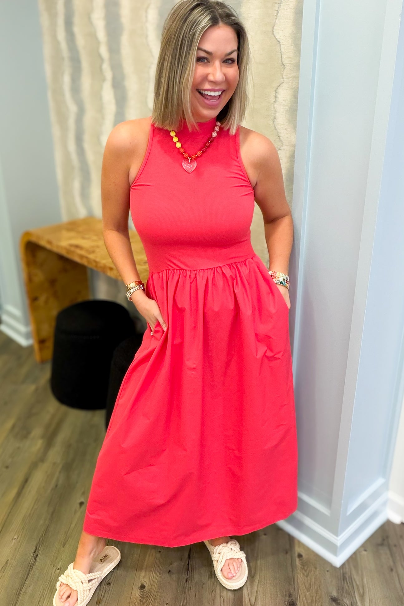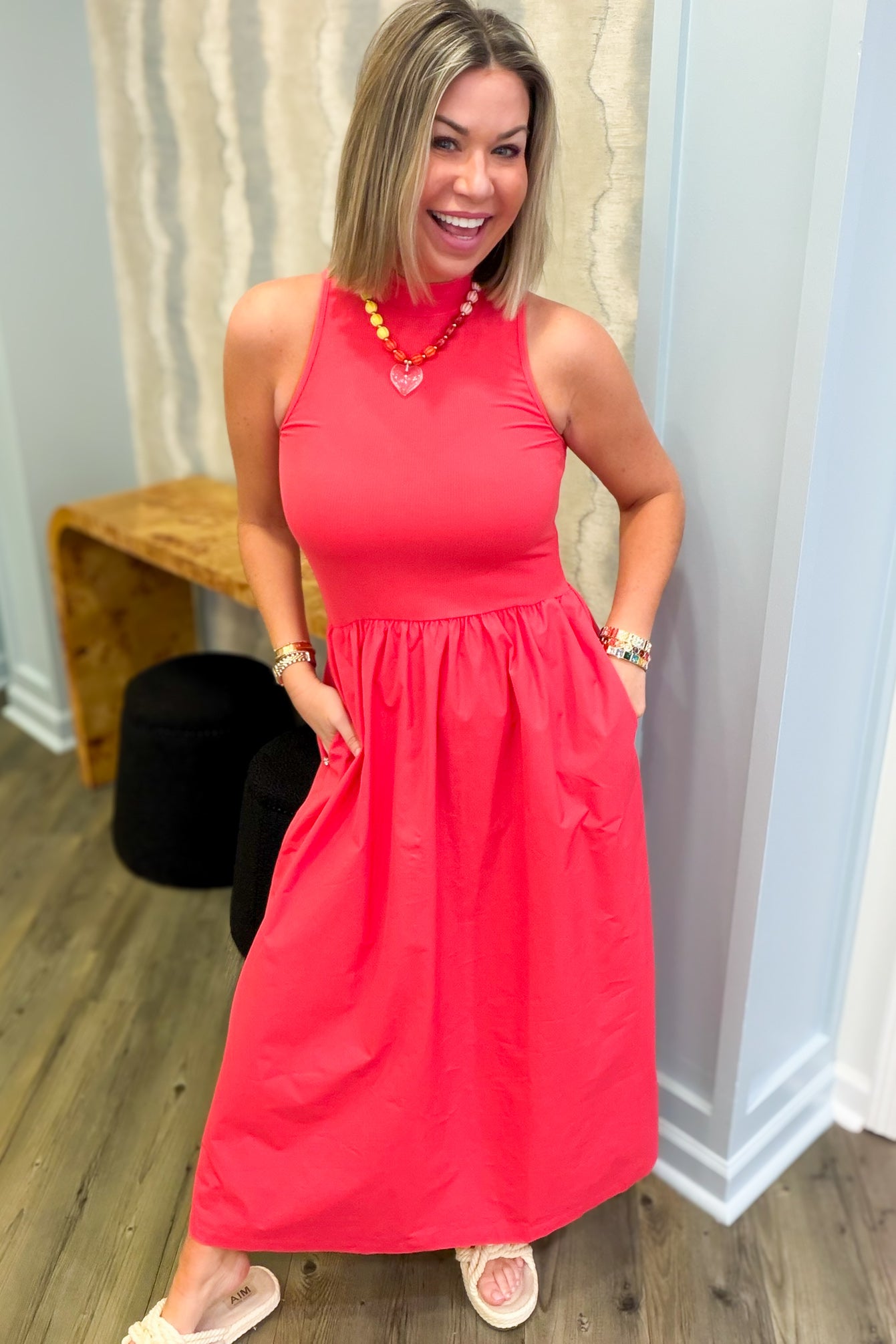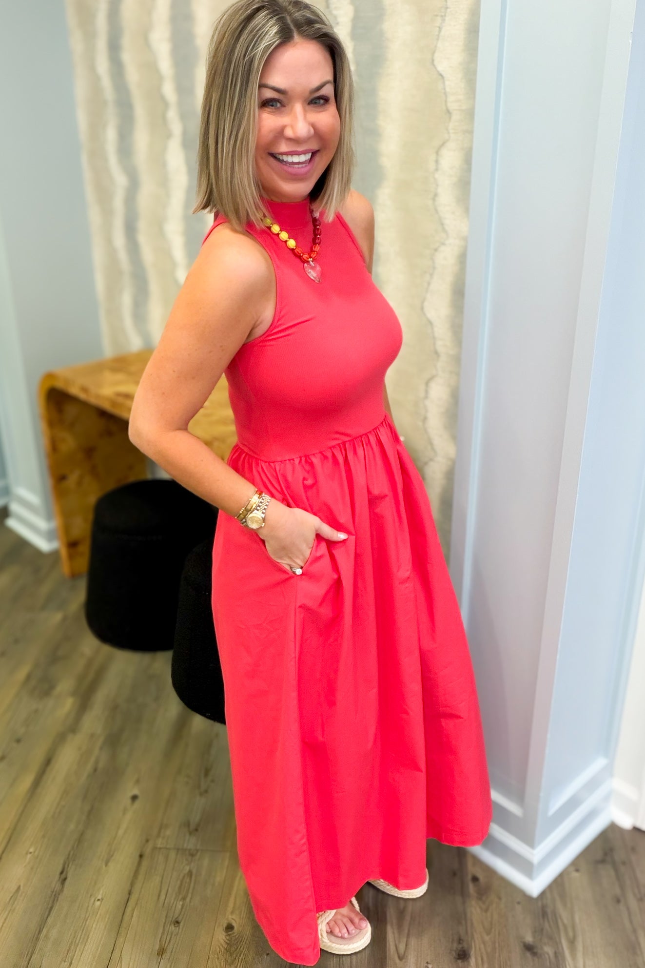 Slip into effortless elegance with this stunning coral maxi dress that's as practical as it is pretty. The textured mock neck adds a touch of sophistication, while the flowing silhouette skims gracefully to the floor. Best part? Real pockets mean you can actually carry your essentials without sacrificing style. Perfect for everything from casual outings to special occasions, this versatile piece is about to become your go-to favorite.