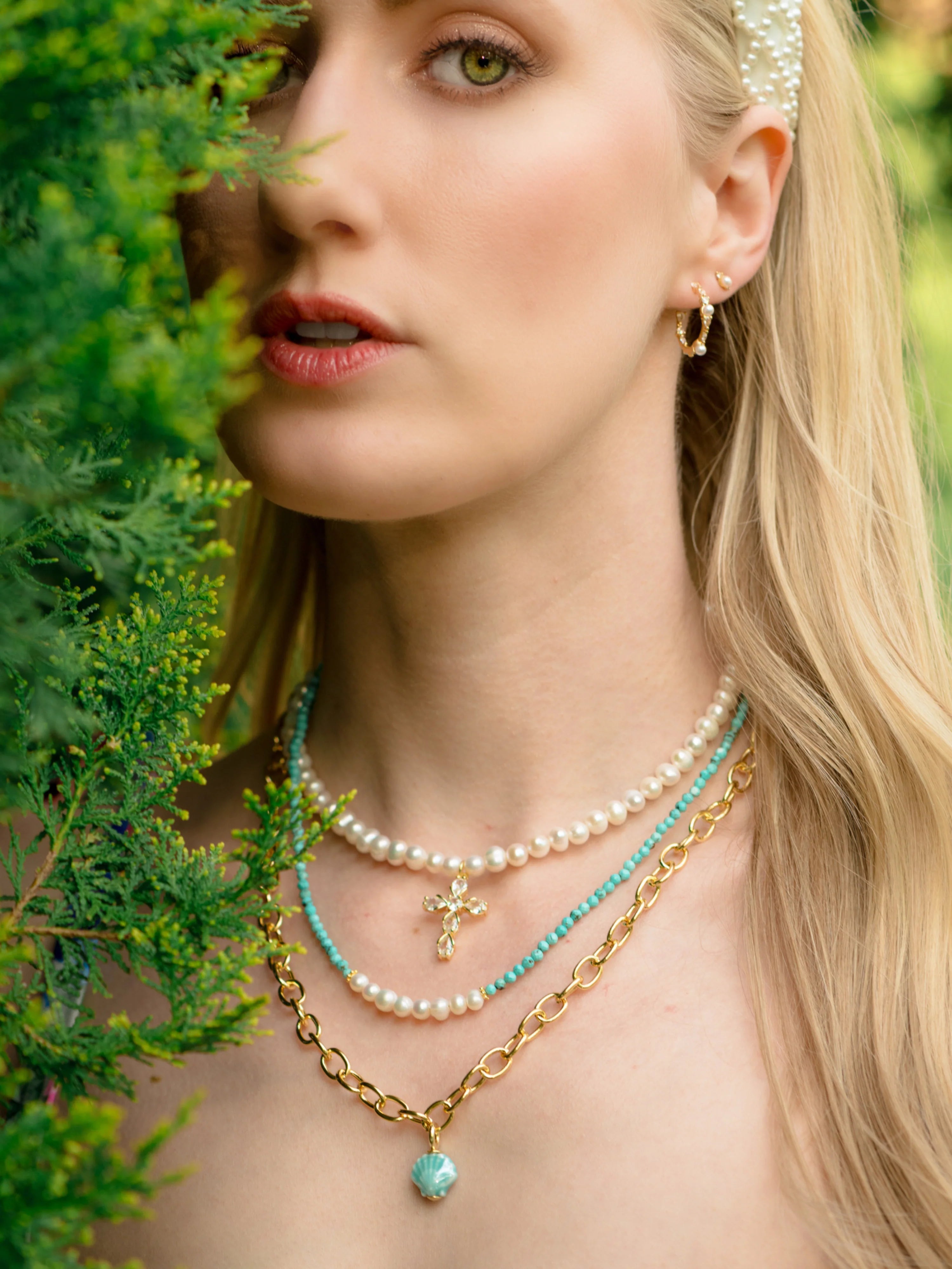 Gold filled is a great choice for those not willing to sacrifice their poolside accessories. Each gold filled piece is made by bonding the gold to the metal underneath (for us that is brass or sterling silver). Gold filled pieces can stand up to regular encounters with water, perfumes and oils. While the piece may darken over time, they will not turn to reveal another color underneath.