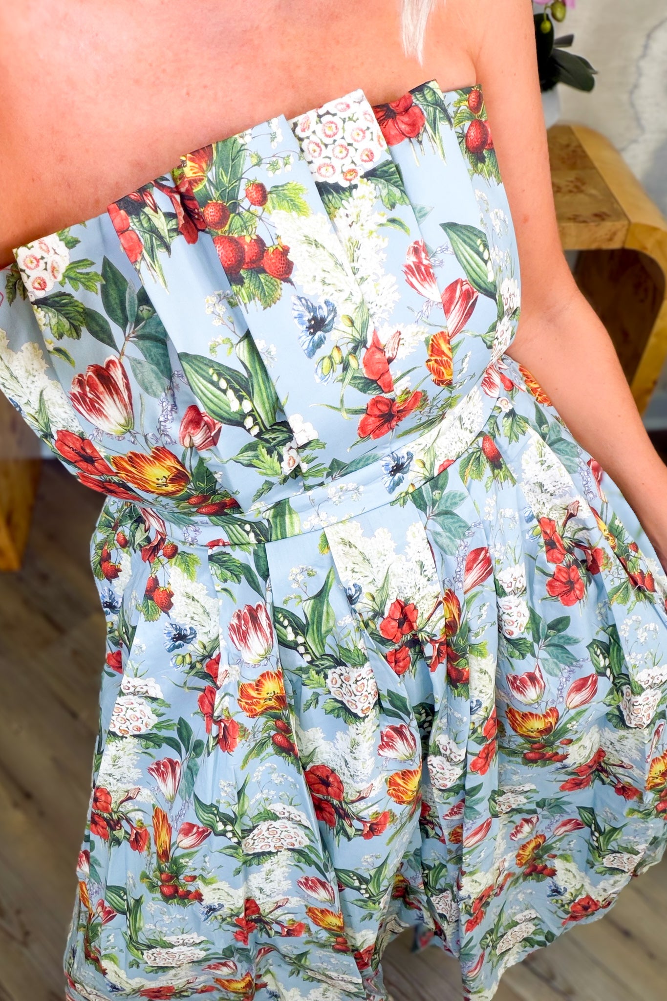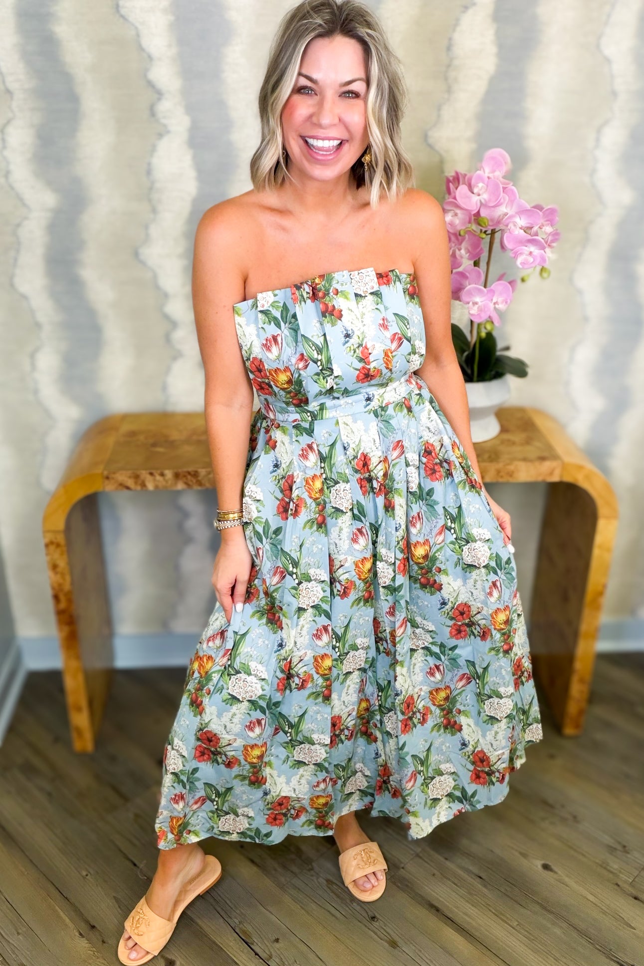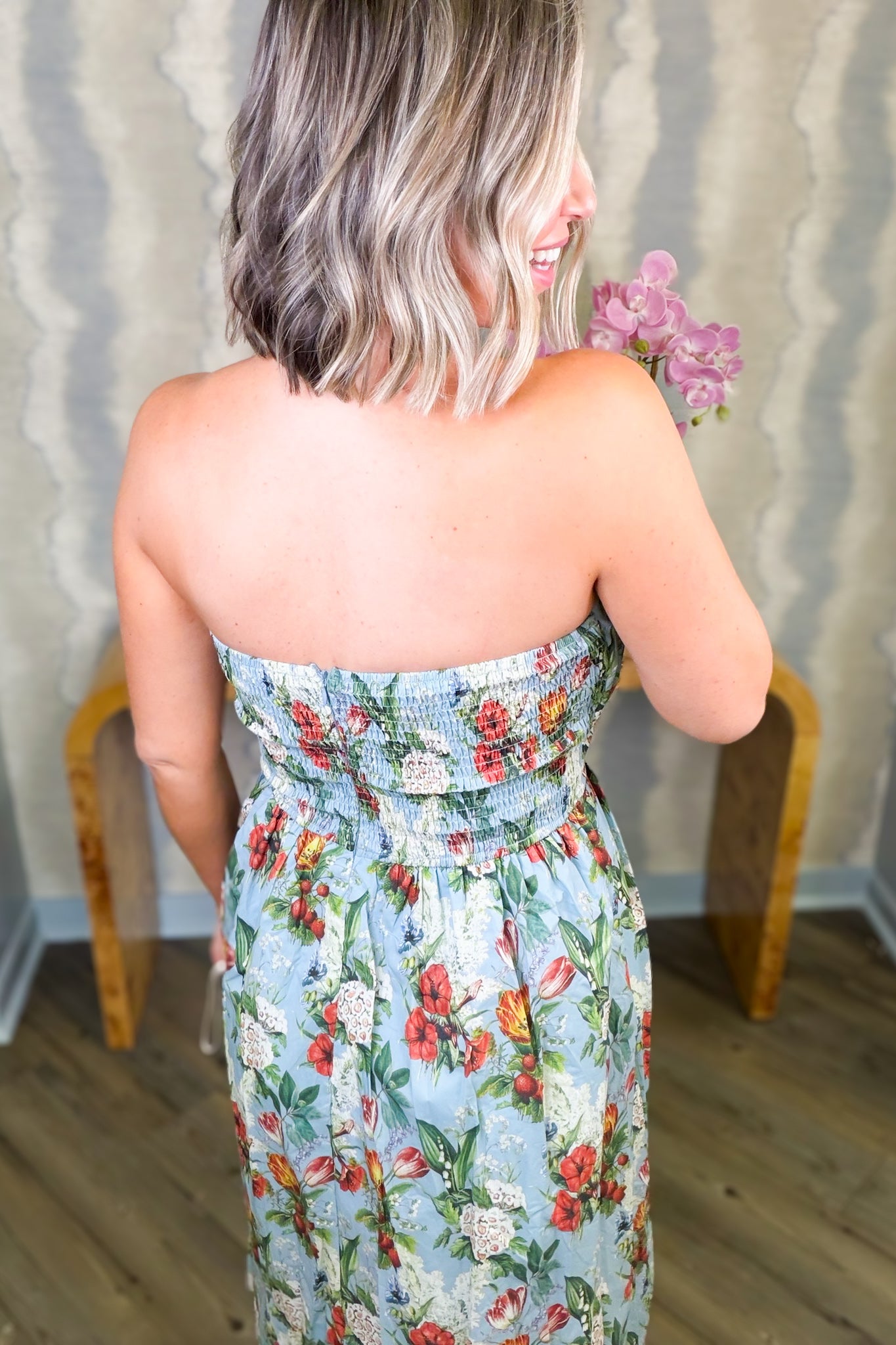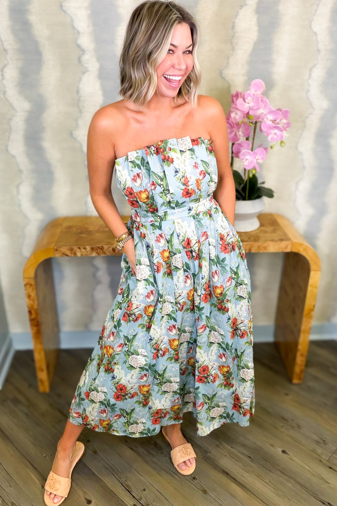 Twirl into spring with the Dixie Floral Strapless Dress—a charming blue number adorned with delicate florals that'll have you feeling garden-fresh all day long. The pleated top creates a flattering silhouette while the smocked back adds a touch of effortless elegance. Best part? Functional pockets to stash your essentials. Runs true to size for a perfect fit every time.