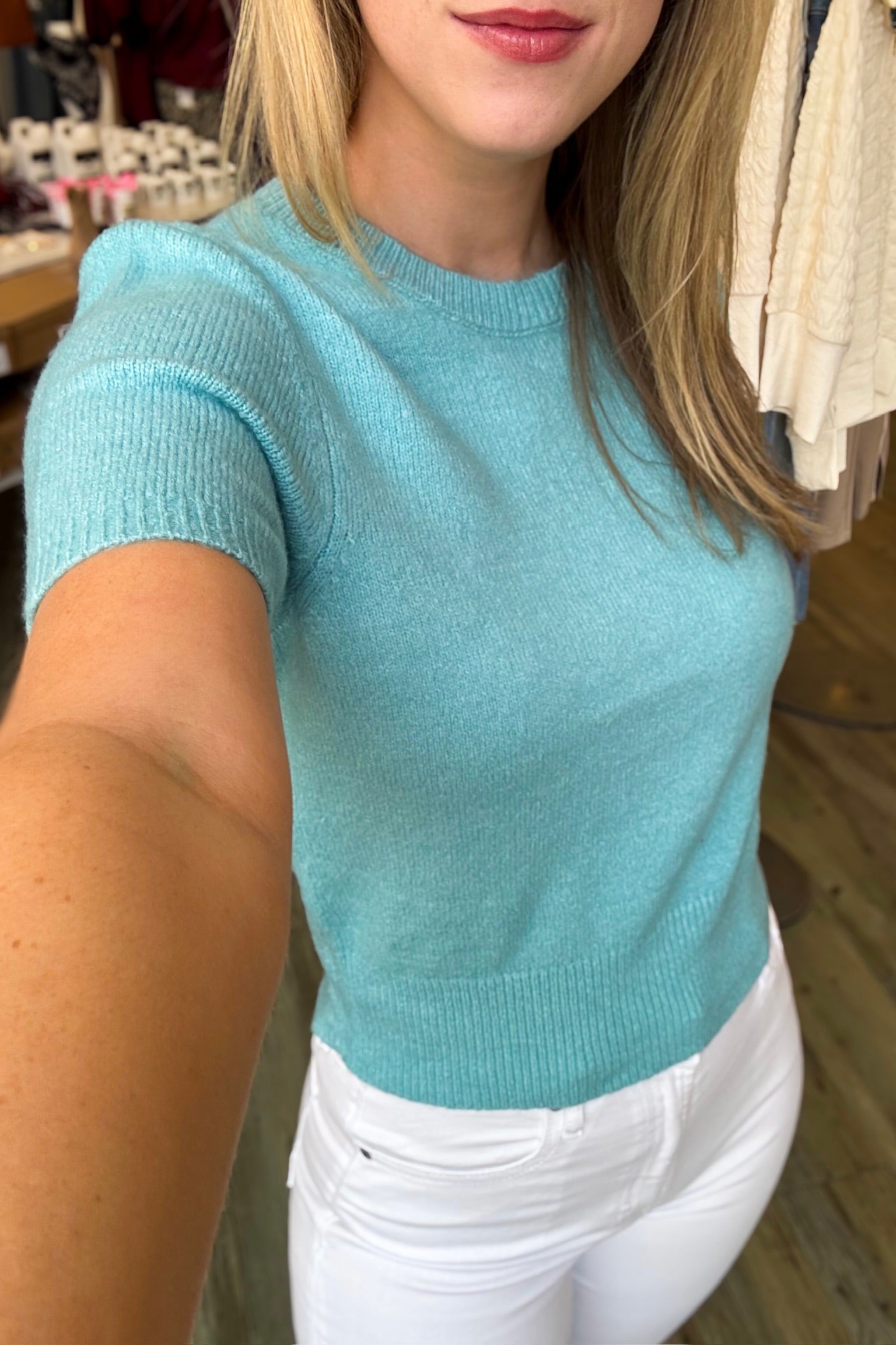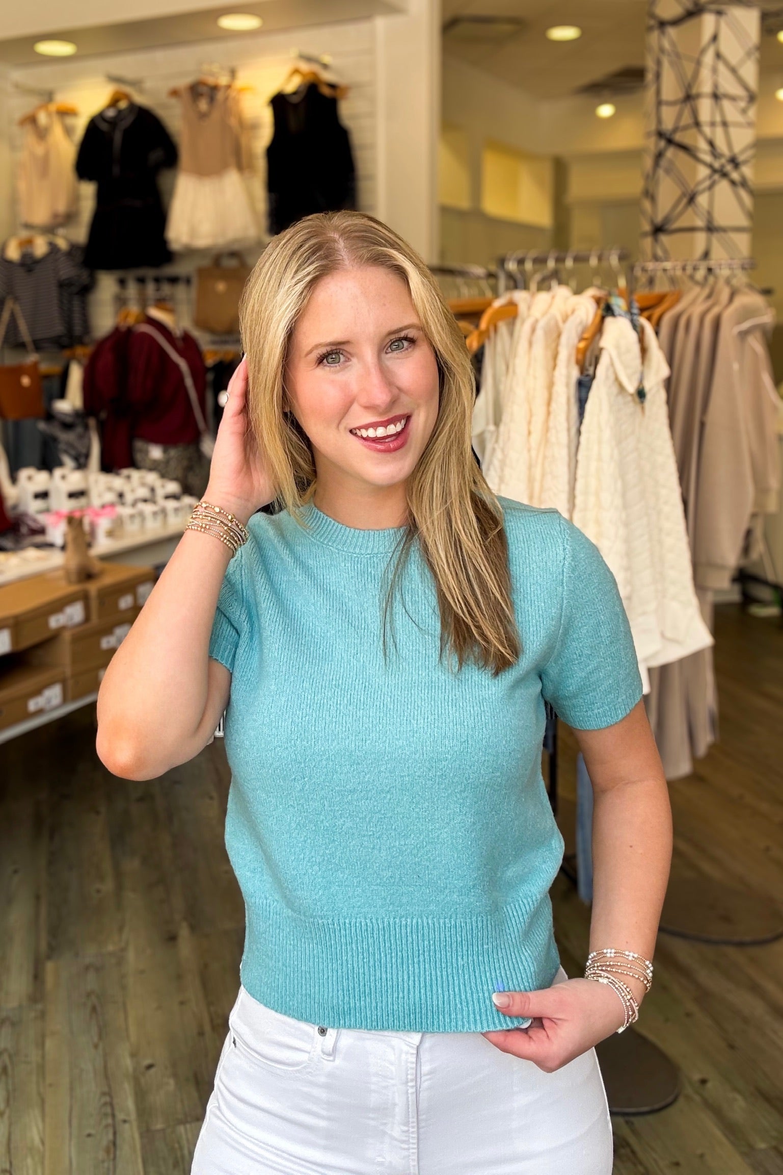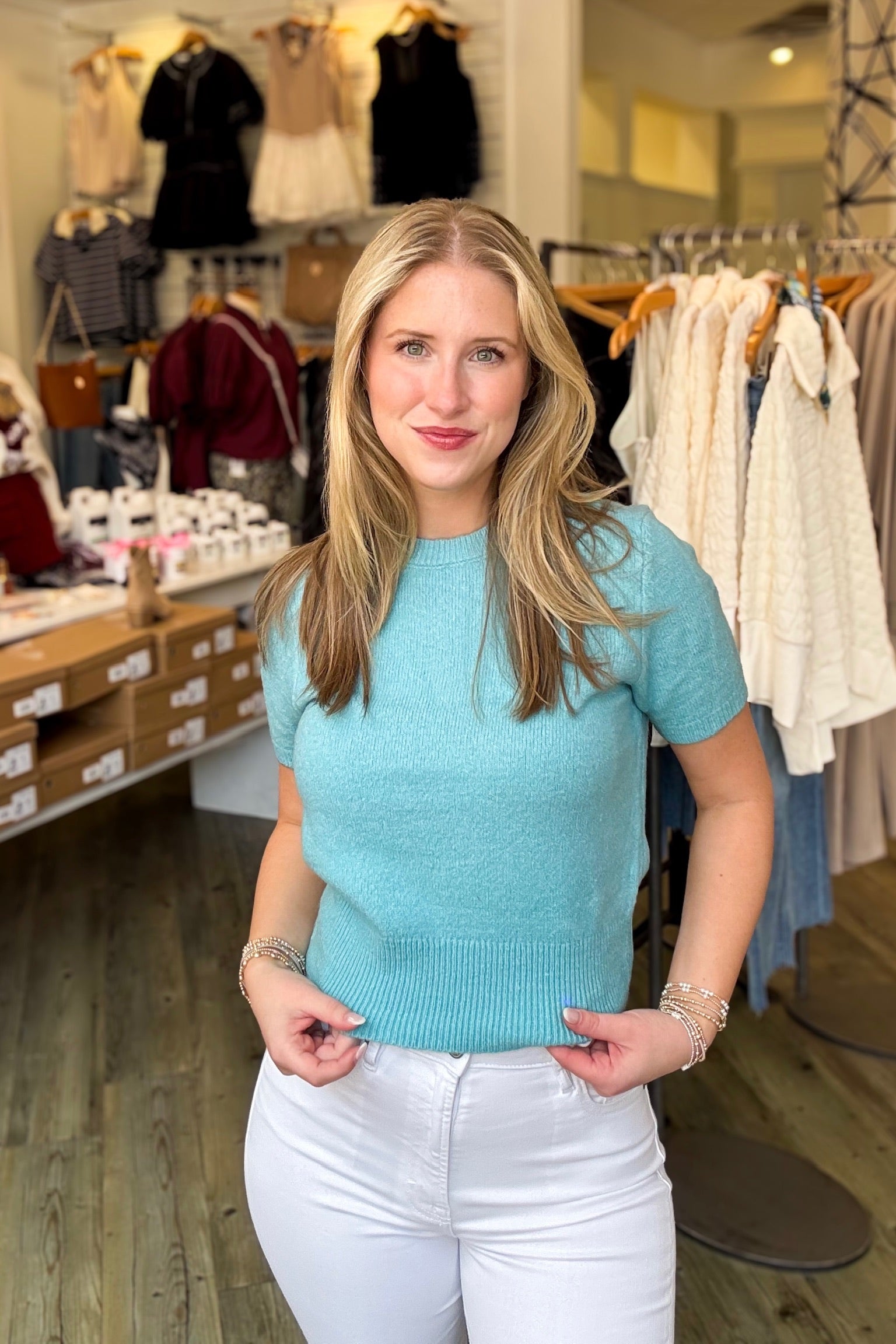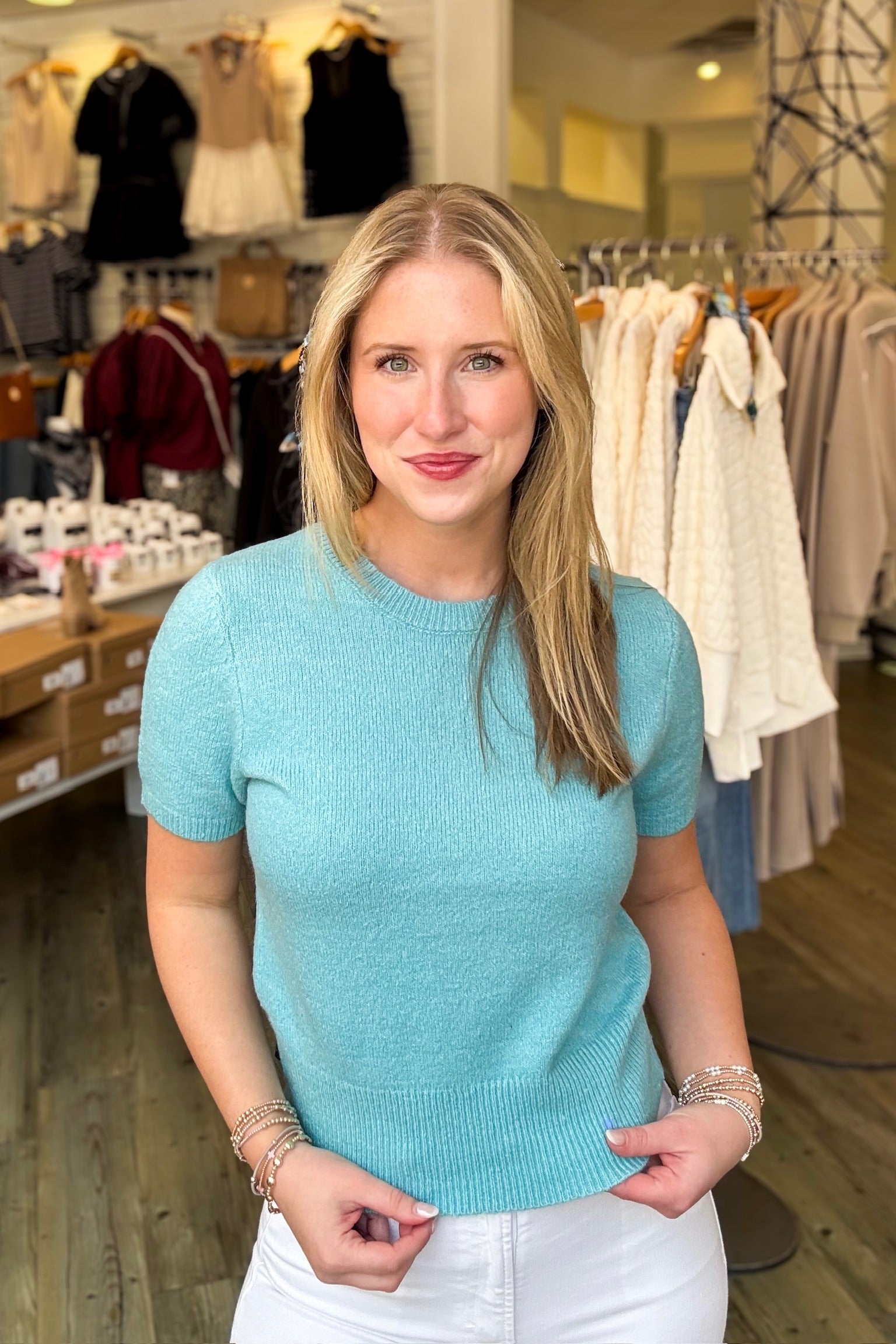 This Eden Ivory Sweater Top features a fitted silhouette with a classic crew neck and short sleeves, designed to fit true to size. Its soft ivory color makes it a versatile addition to your wardrobe, perfect for layering or wearing on its own for a polished, comfortable look.
