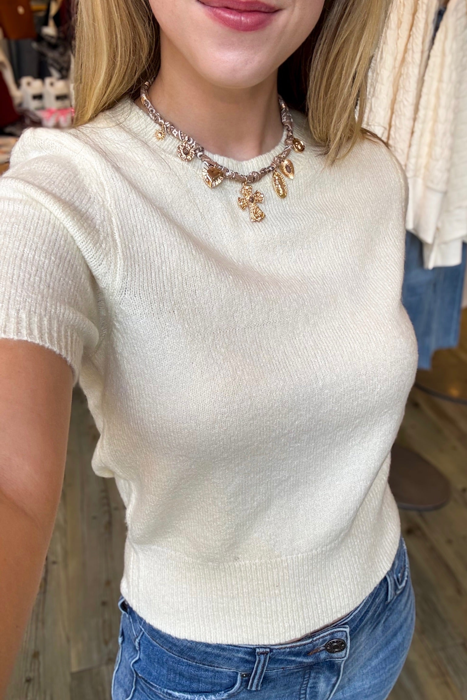 This Eden Ivory Sweater Top features a fitted silhouette with a classic crew neck and short sleeves, designed to fit true to size. Its soft ivory color makes it a versatile addition to your wardrobe, perfect for layering or wearing on its own for a polished, comfortable look.