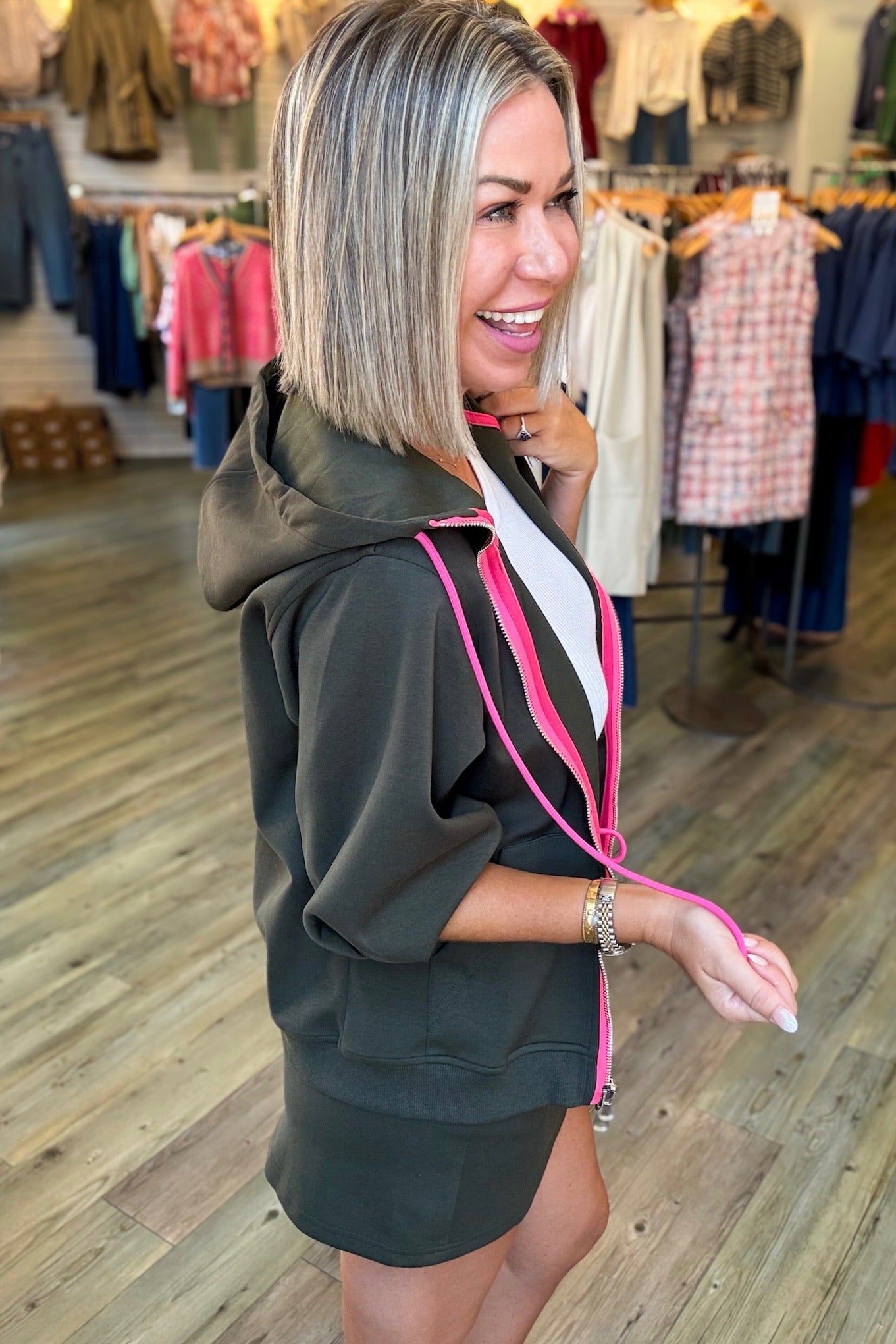 Stay stylish and comfortable in the FERGIE ARMY GREEN HOODIE SKORT SET. Its luxurious fabric and oversized fit provide ultimate comfort while the three-quarter sleeves and front zip with pockets add functionality. Perfect for any casual occasion, this army green colored hoodie has contrasting pink trim and is also paired with a matching skort.