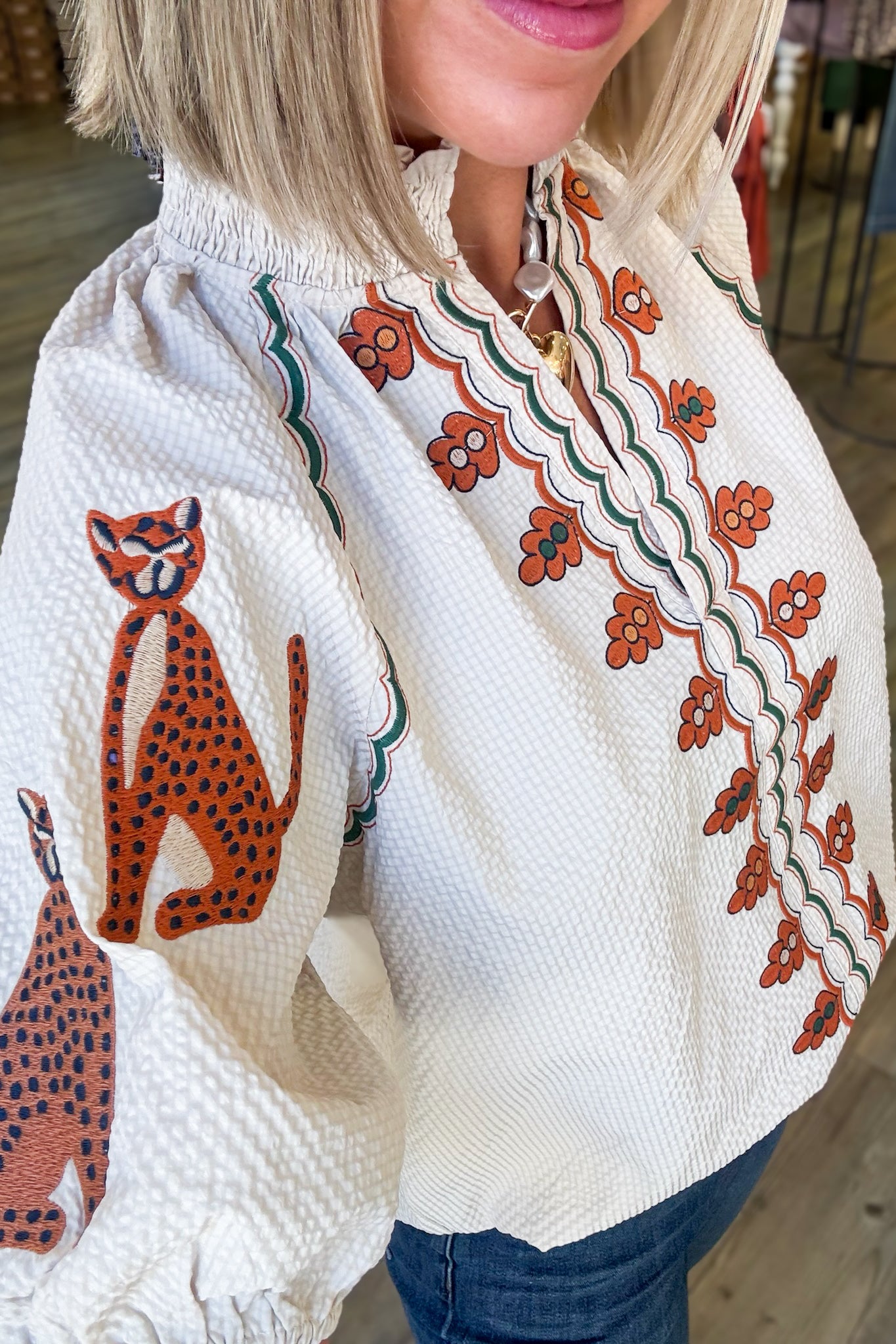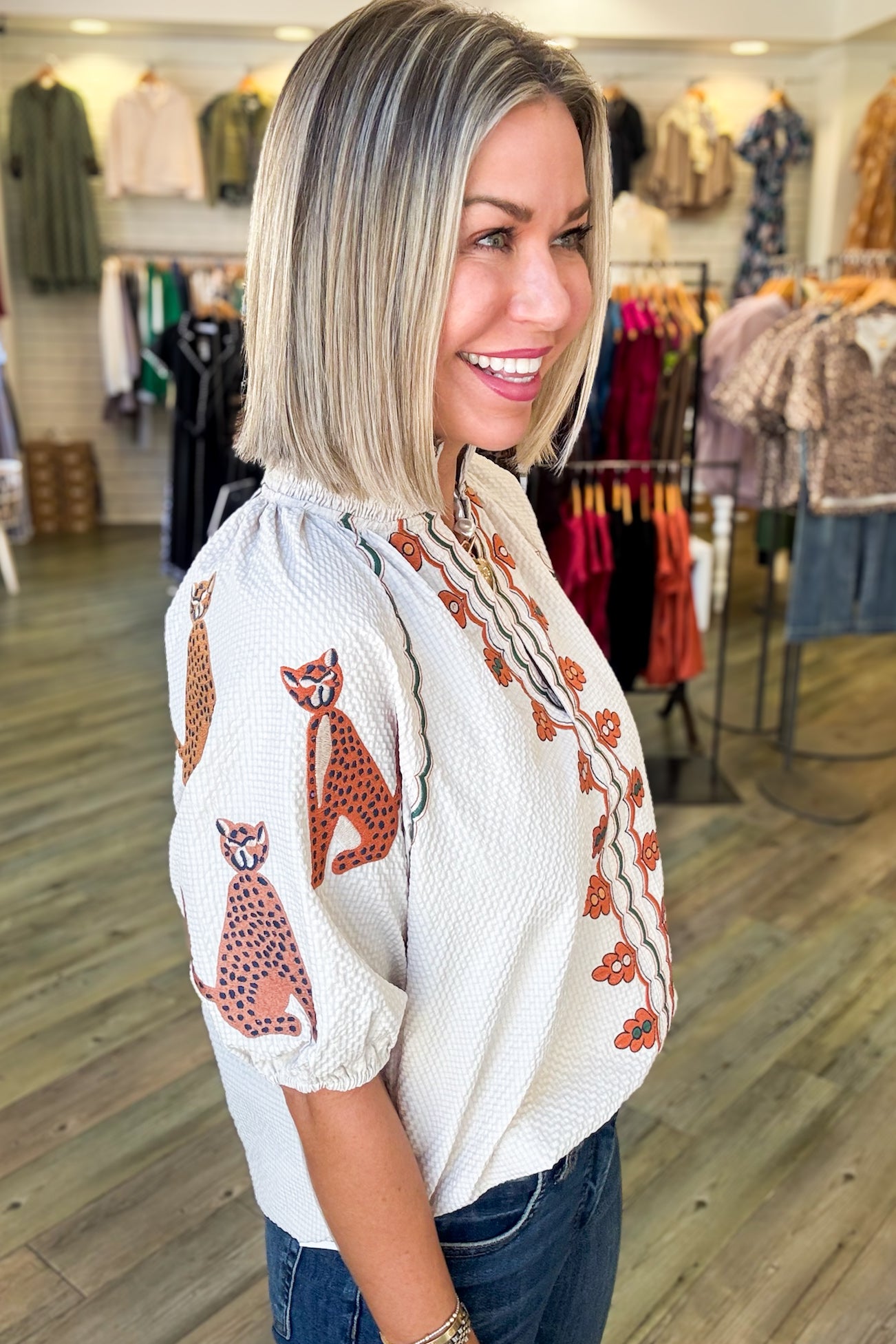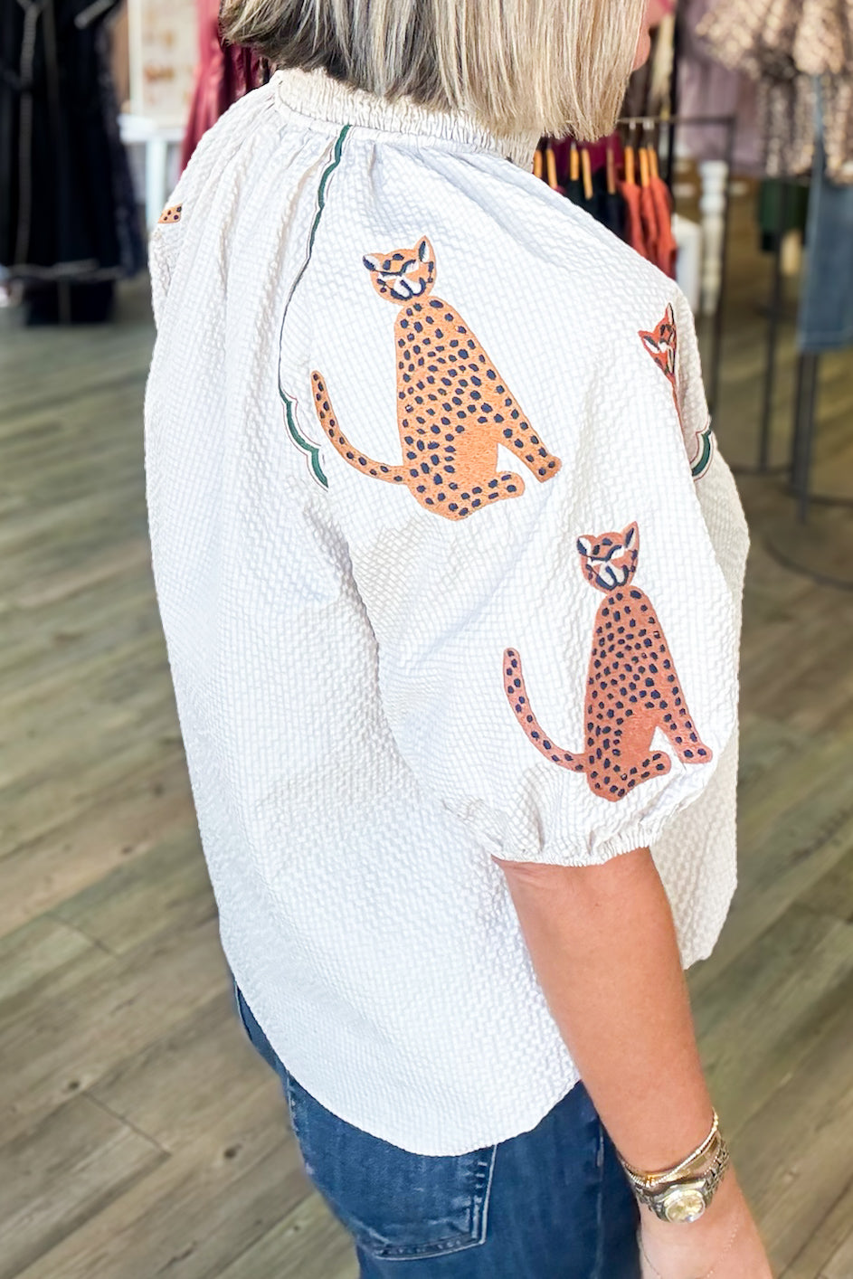 This cream-colored top features a stylish collared V-neck design and eye-catching animal print puff sleeves that add a playful touch. The floral print runs down the center, enhancing its feminine charm. Crafted for a comfortable fit, this textured top allows you to size down for a more tailored silhouette. Perfect for elevating your everyday look with unique patterns and flattering details.