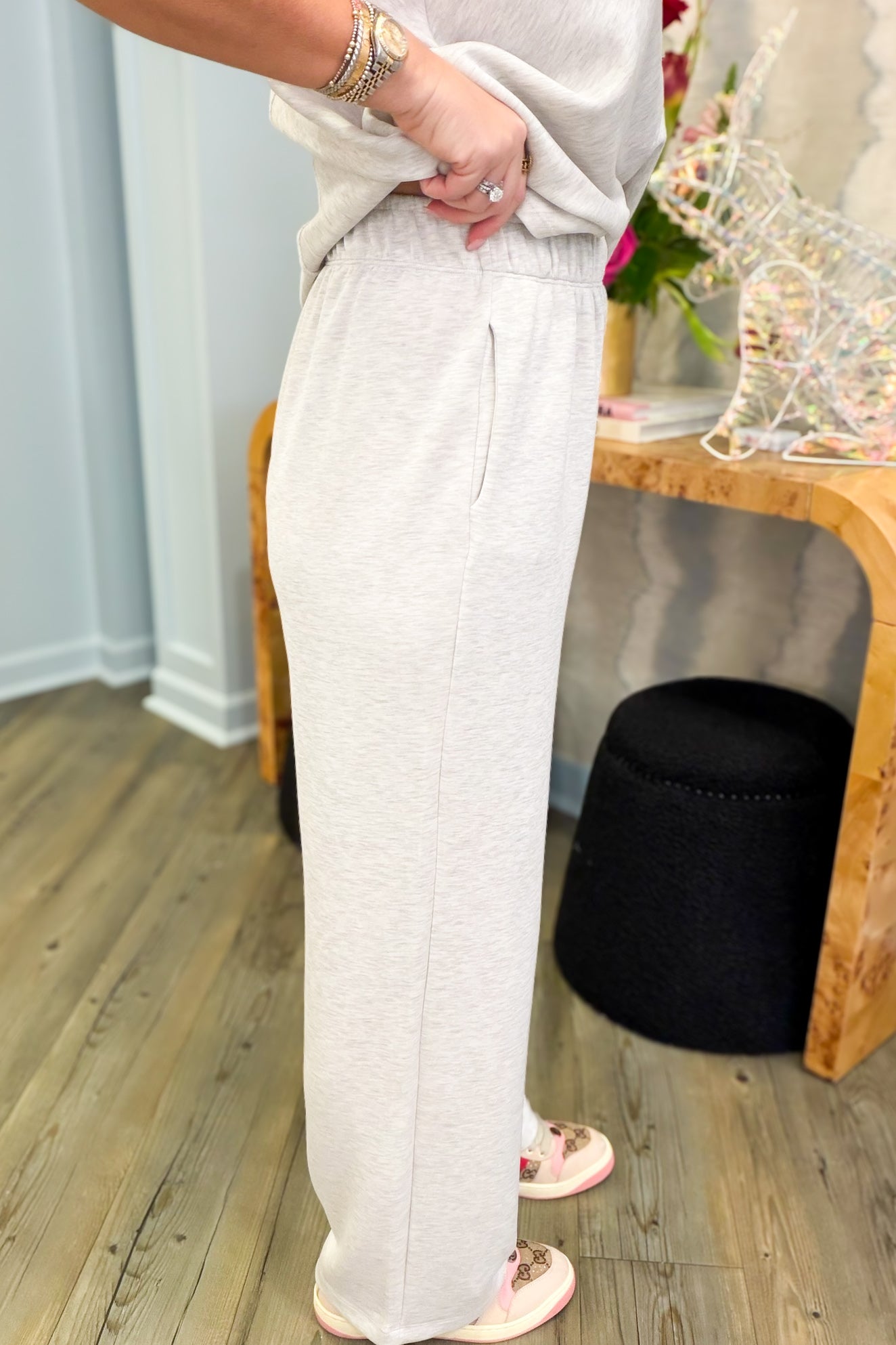 Introducing the pants that actually listen to what you need—pockets included. Crafted from the same cozy scuba fabric as our grey sleeveless mock top, these grey pants are your ticket to a perfectly matched set that feels as good as it looks. The relaxed fit and stretchy material mean you can move freely without sacrificing style. Throw them on with the matching top and call it a win.