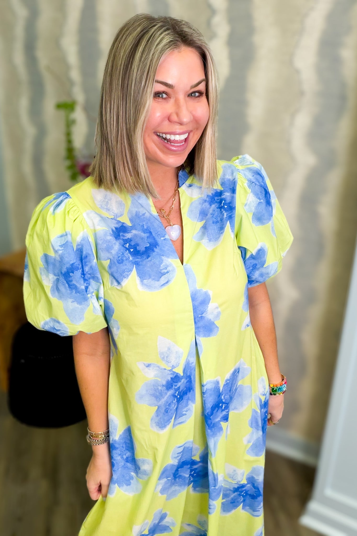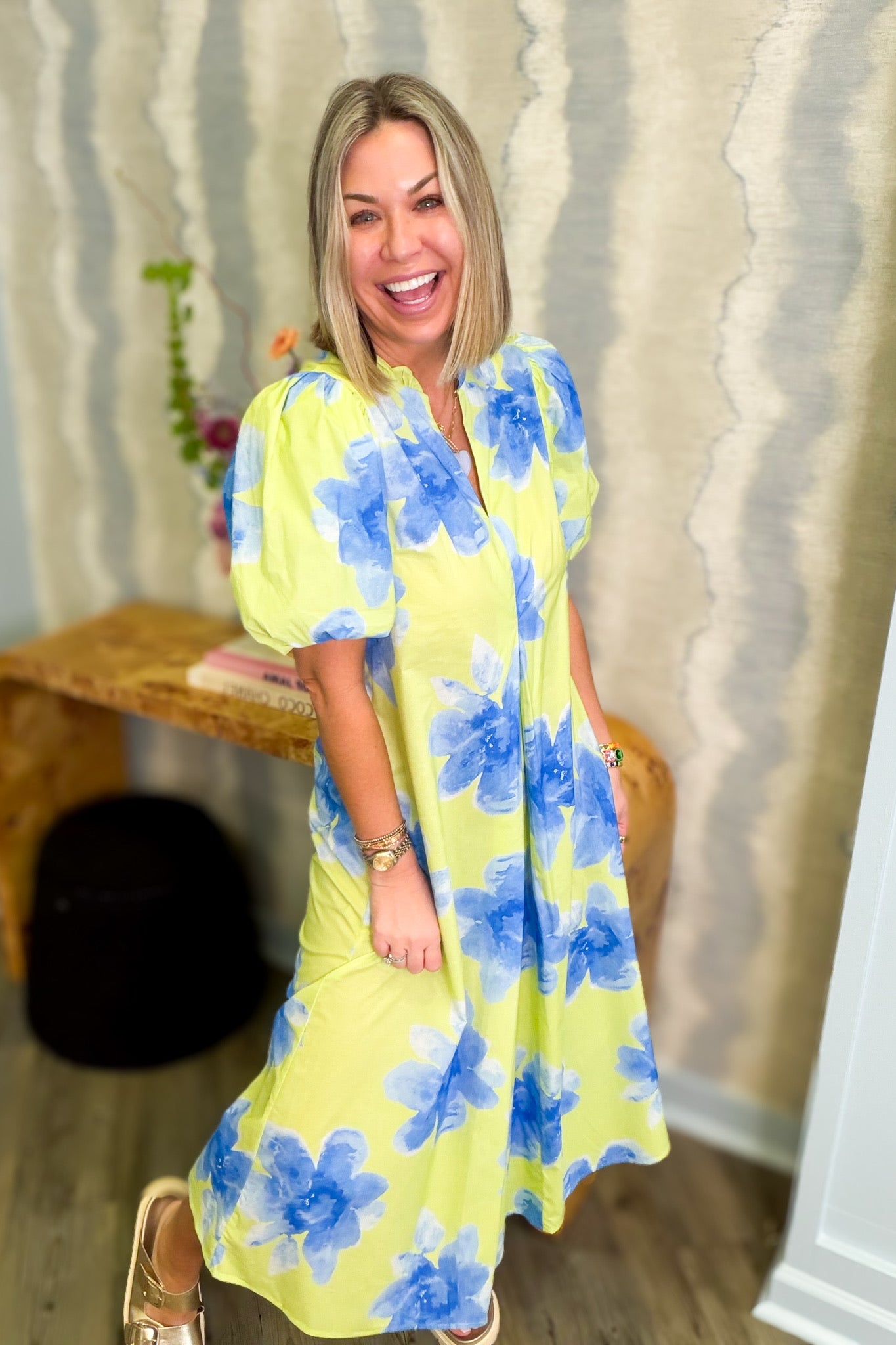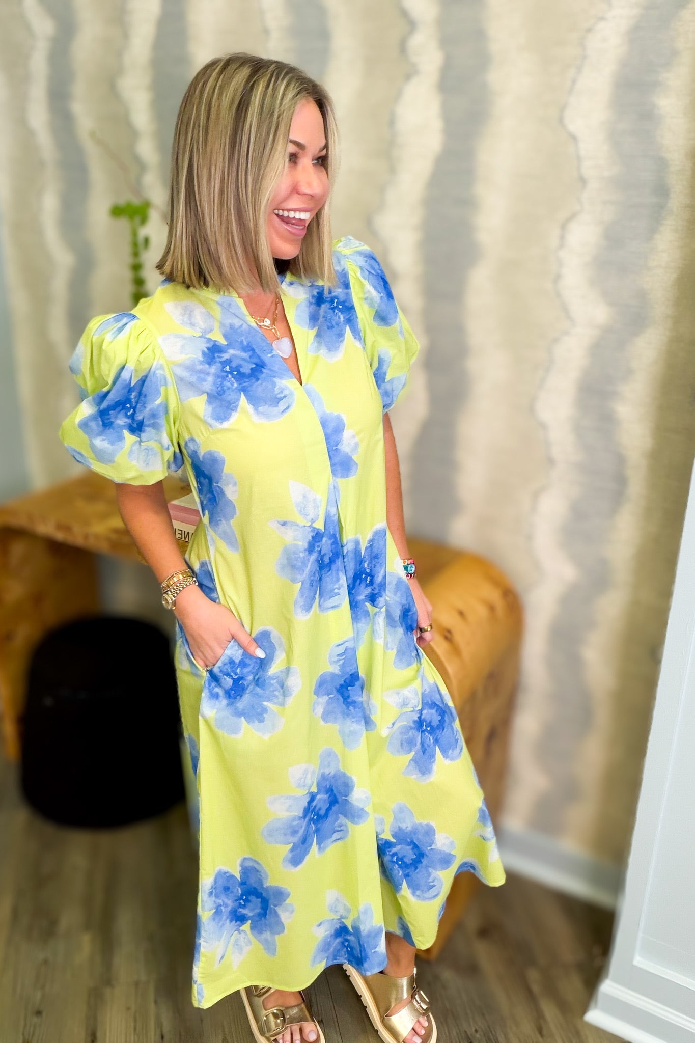 Hattie Lime Short Sleeve Midi Dress brighten your wardrobe with this vibrant lime and blue print midi dress. Designed for everyday comfort and style, this short sleeve dress features a flattering midi length that works for casual outings or dressed-up occasions. Practical pockets keep your essentials close while you move through your day. The eye-catching color combination and playful print make it an instant favorite for spring and summer wear.