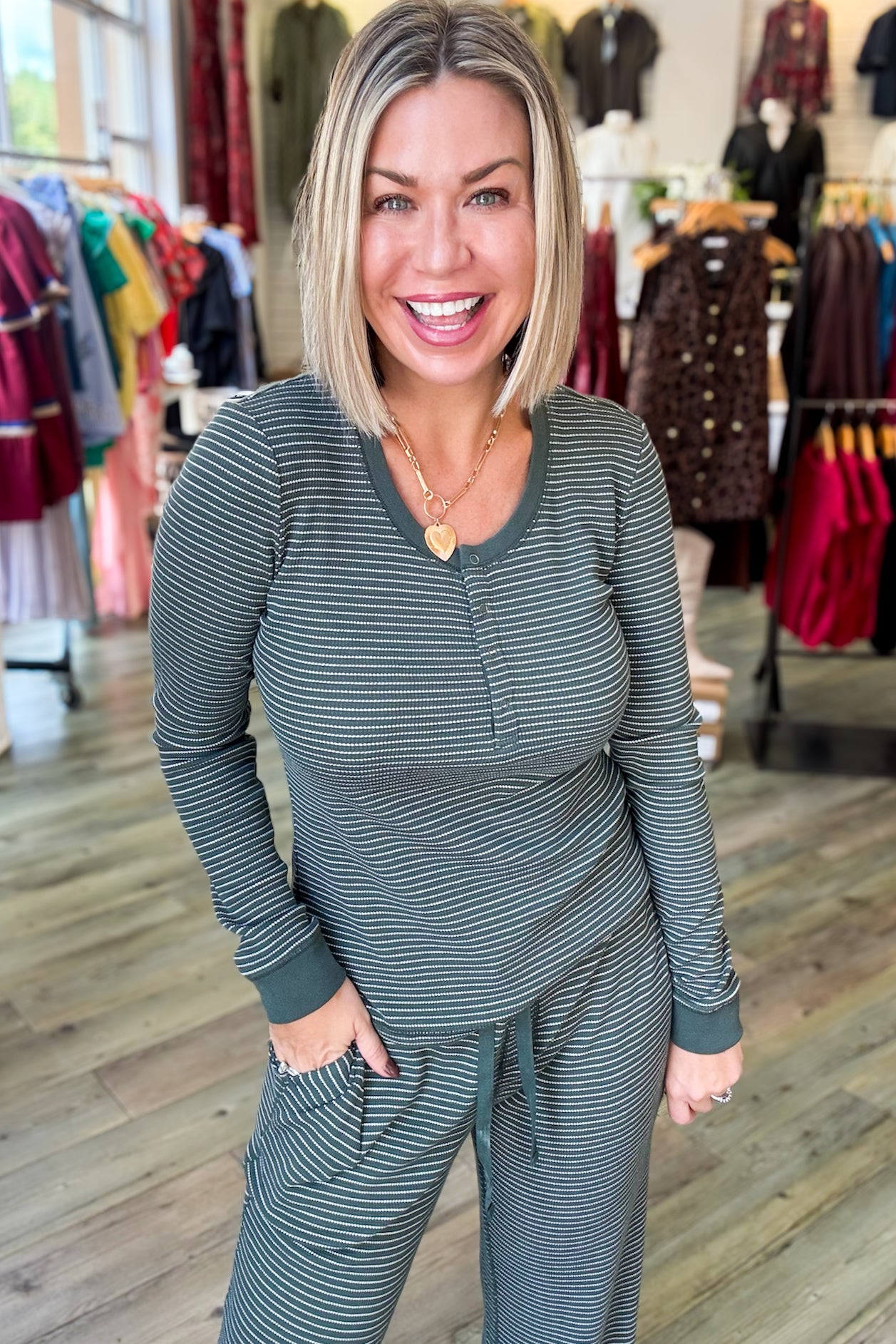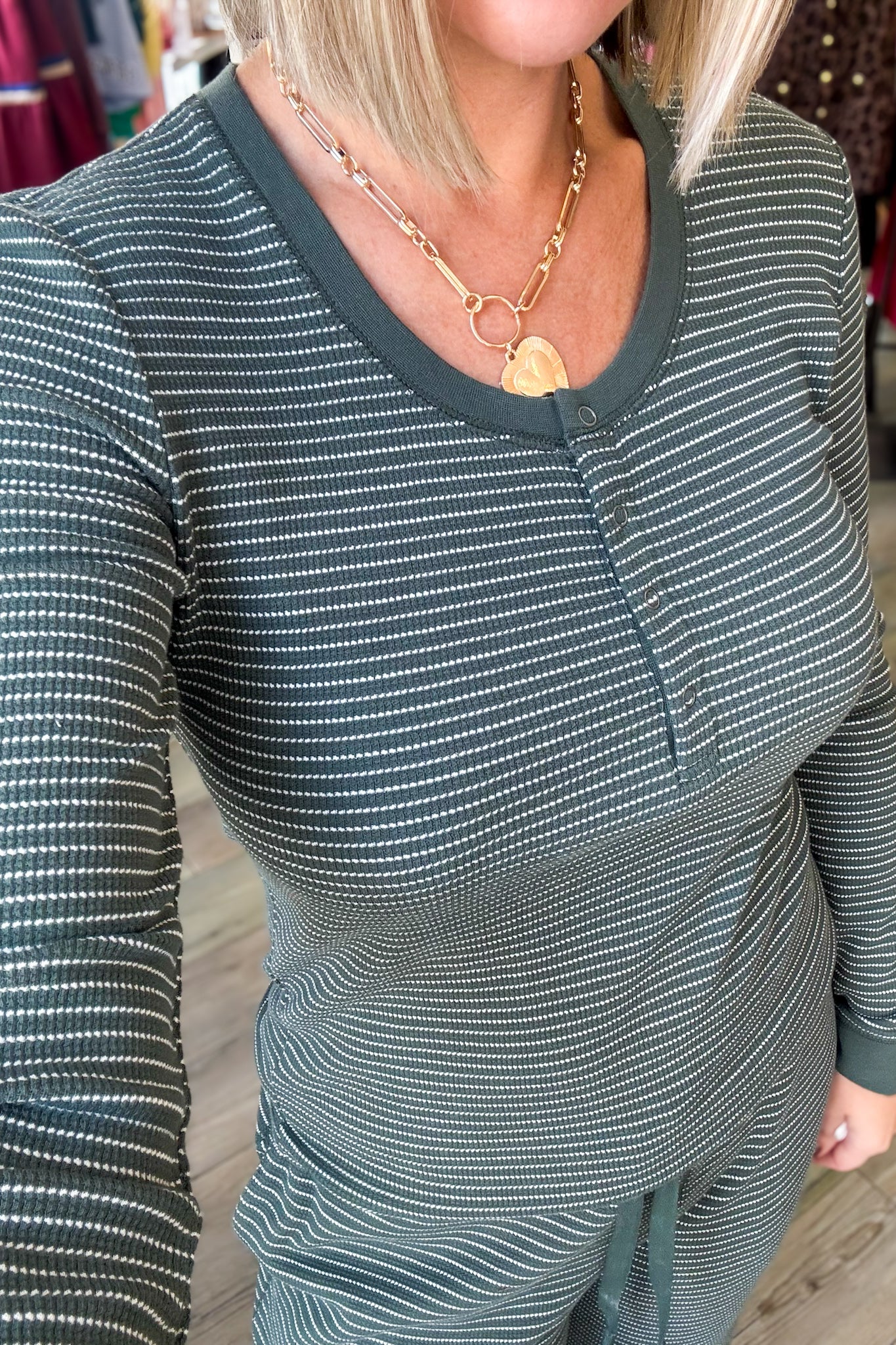 This Henley Knitted Green Thermal Top features a comfortable round neck and a quarter button-up design, perfect for layering. Crafted with a long-sleeve thermal knit in a green and white striped pattern, it provides cozy warmth while maintaining breathability. It pairs effortlessly with matching pants for a coordinated look. Designed to fit true to size, this versatile top is ideal for relaxed, everyday wear.