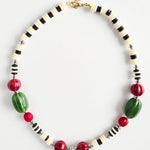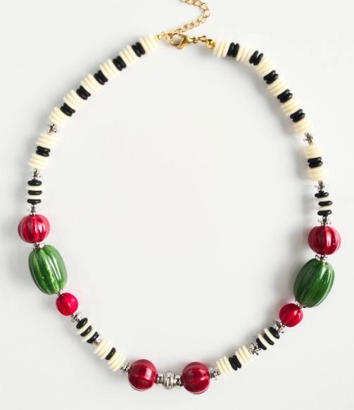 The Juicy Mix Beaded Necklace features striking black and white beaded discs accented by vibrant red and green detailed beads. This bold combination adds a lively pop of color and texture to any outfit, making it a unique accessory that stands out. Perfect for adding personality and charm to your everyday style.
