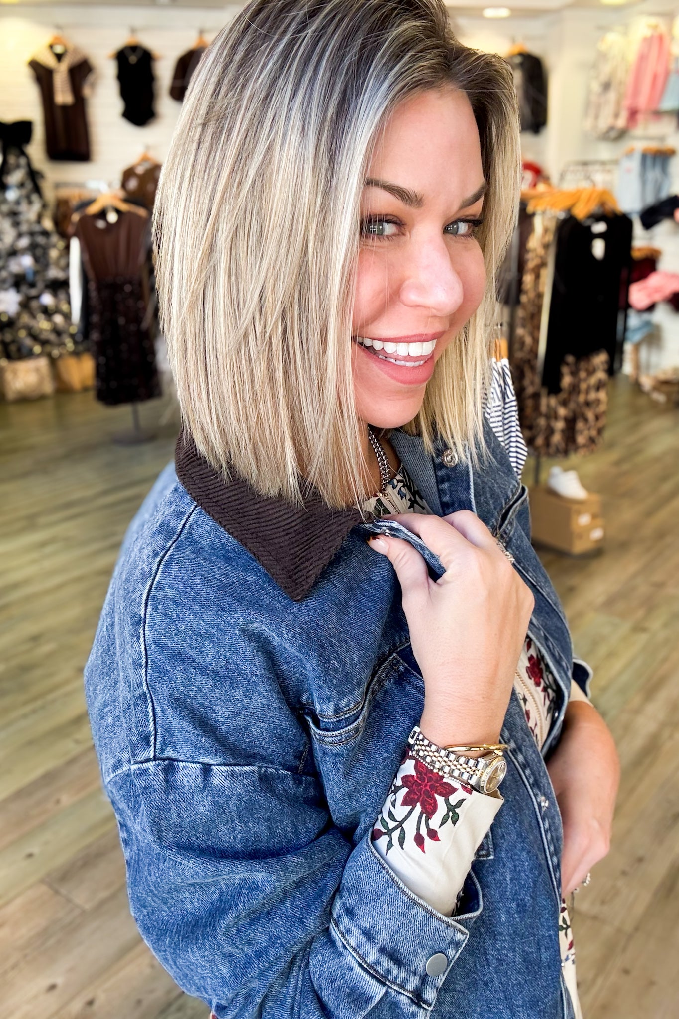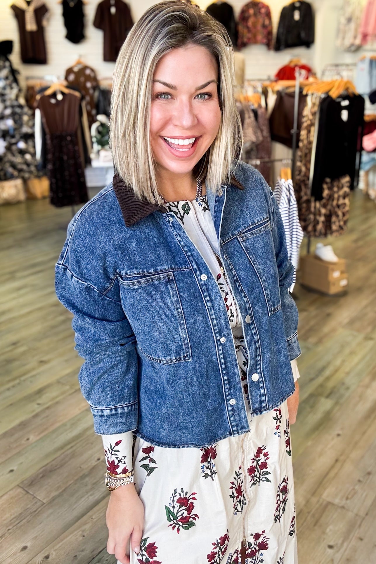 The Kendall Collared Denim Jacket combines classic denim styling with thoughtful details that elevate your everyday look. Featuring a rich brown corduroy collar that adds warmth and texture, this jacket pairs perfectly with everything from tees to sweaters. Silver buttons catch the light beautifully, while cuffed sleeve ends create a polished, intentional finish. True to size, so you can shop with confidence knowing it'll fit just right.