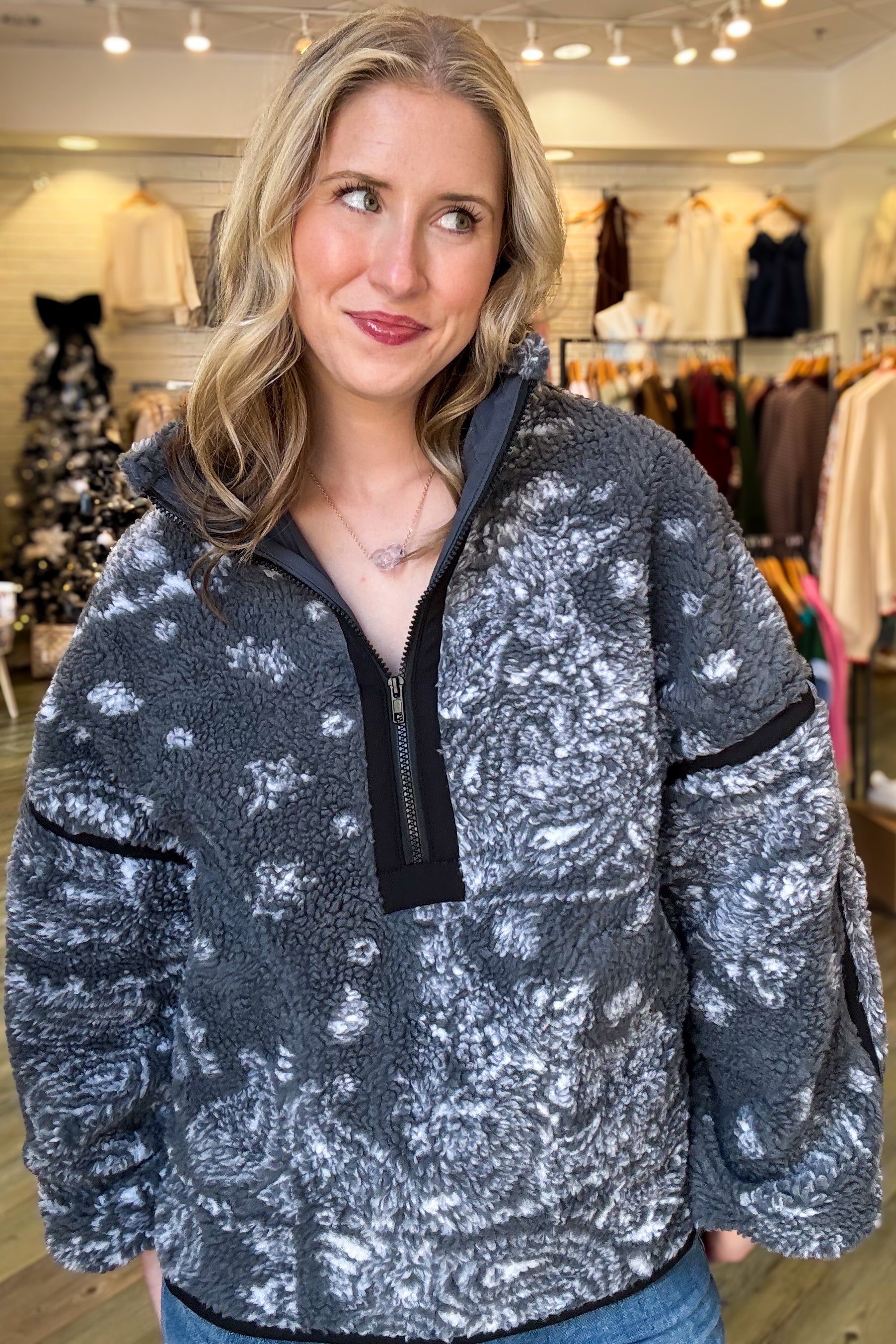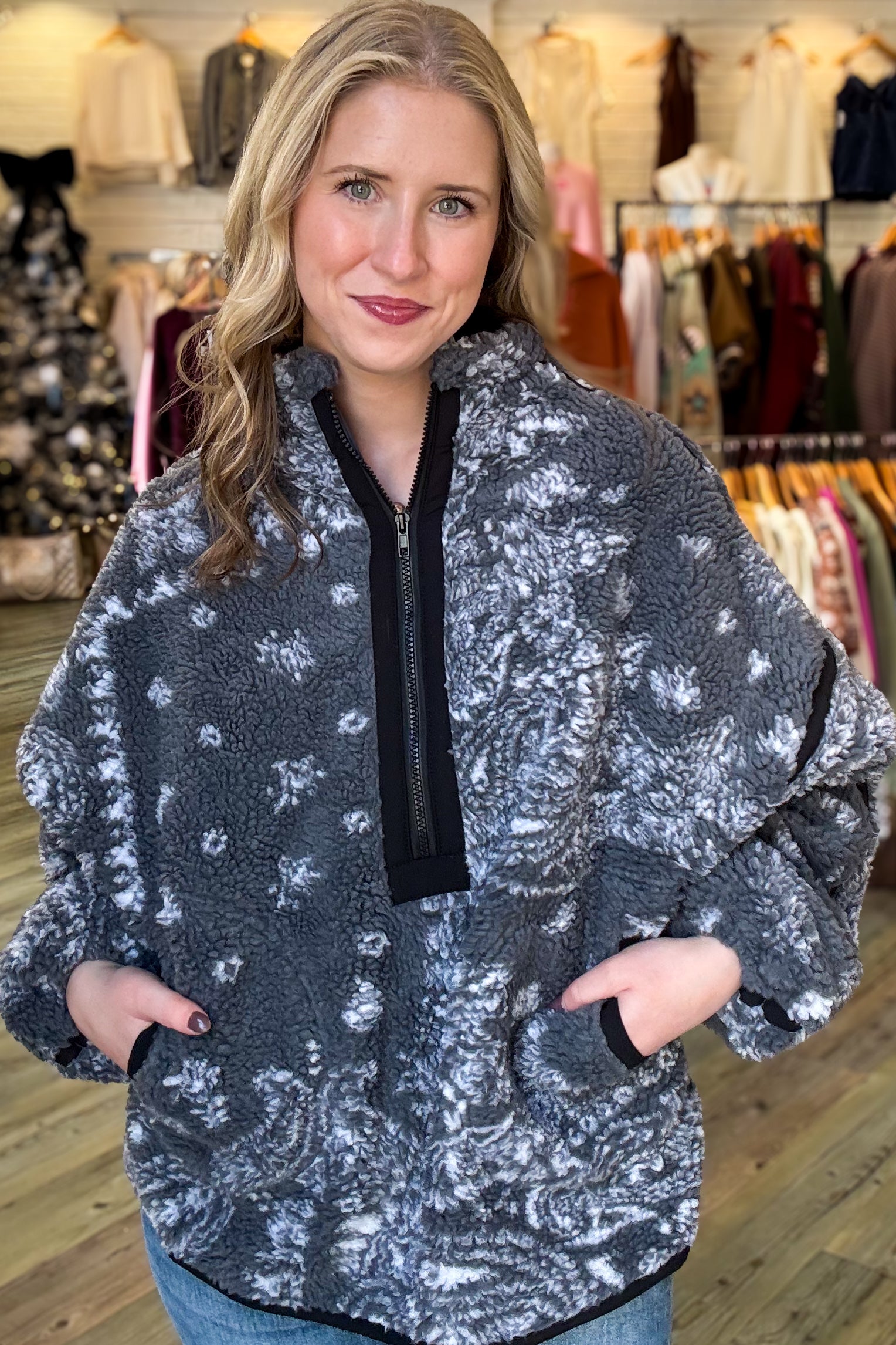 The Lana Grey Patterned Pullover offers a comfortable fit with true-to-size sizing, making it an easy choice for your wardrobe. Featuring a subtle grey and white pattern, black trimming, and a convenient quarter zip, this long sleeve pullover balances style and functionality. Front pockets add practicality for your essentials or hand warmth. Perfect for layering or wearing on its own, it delivers cozy comfort with a polished look.