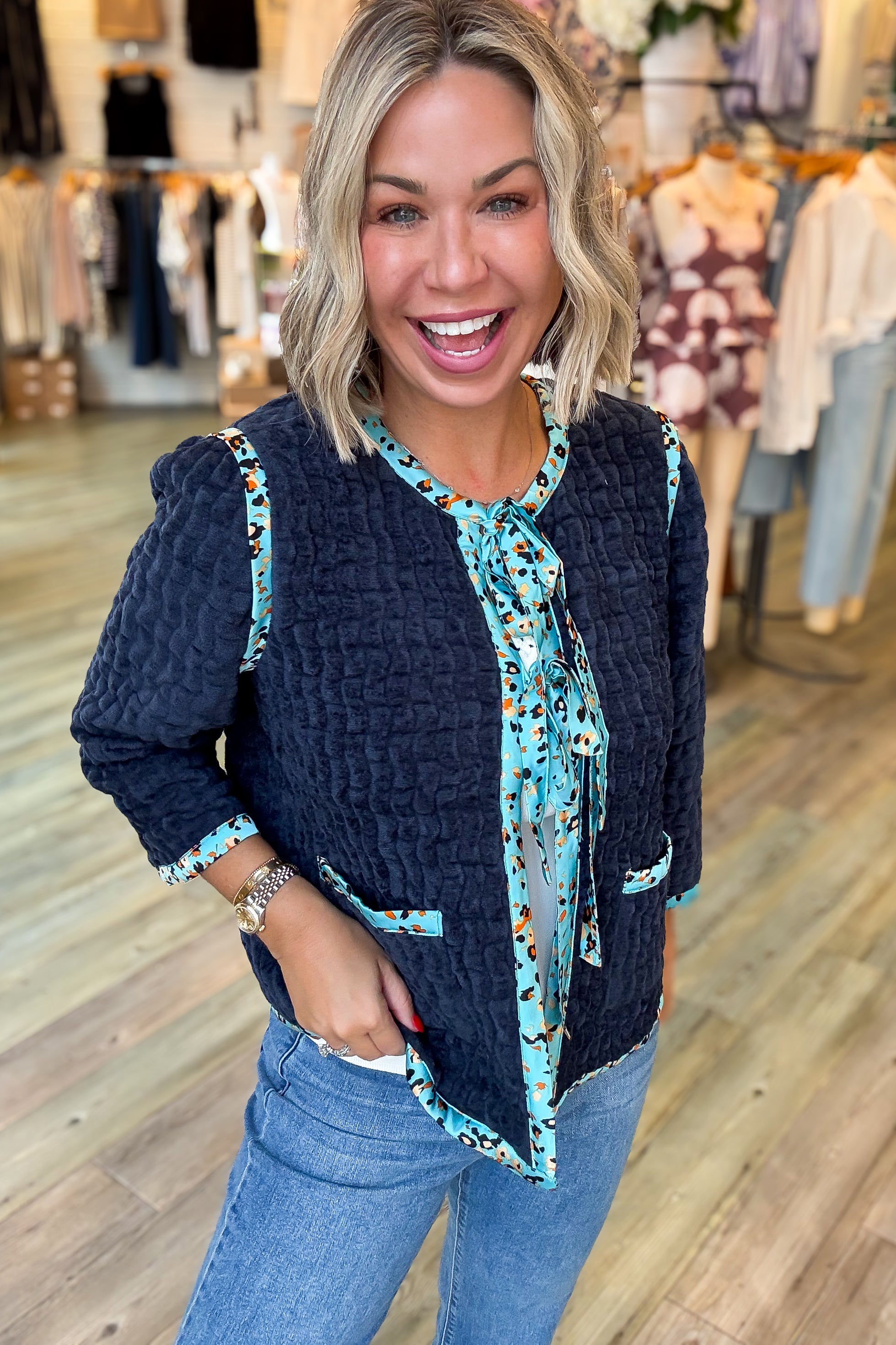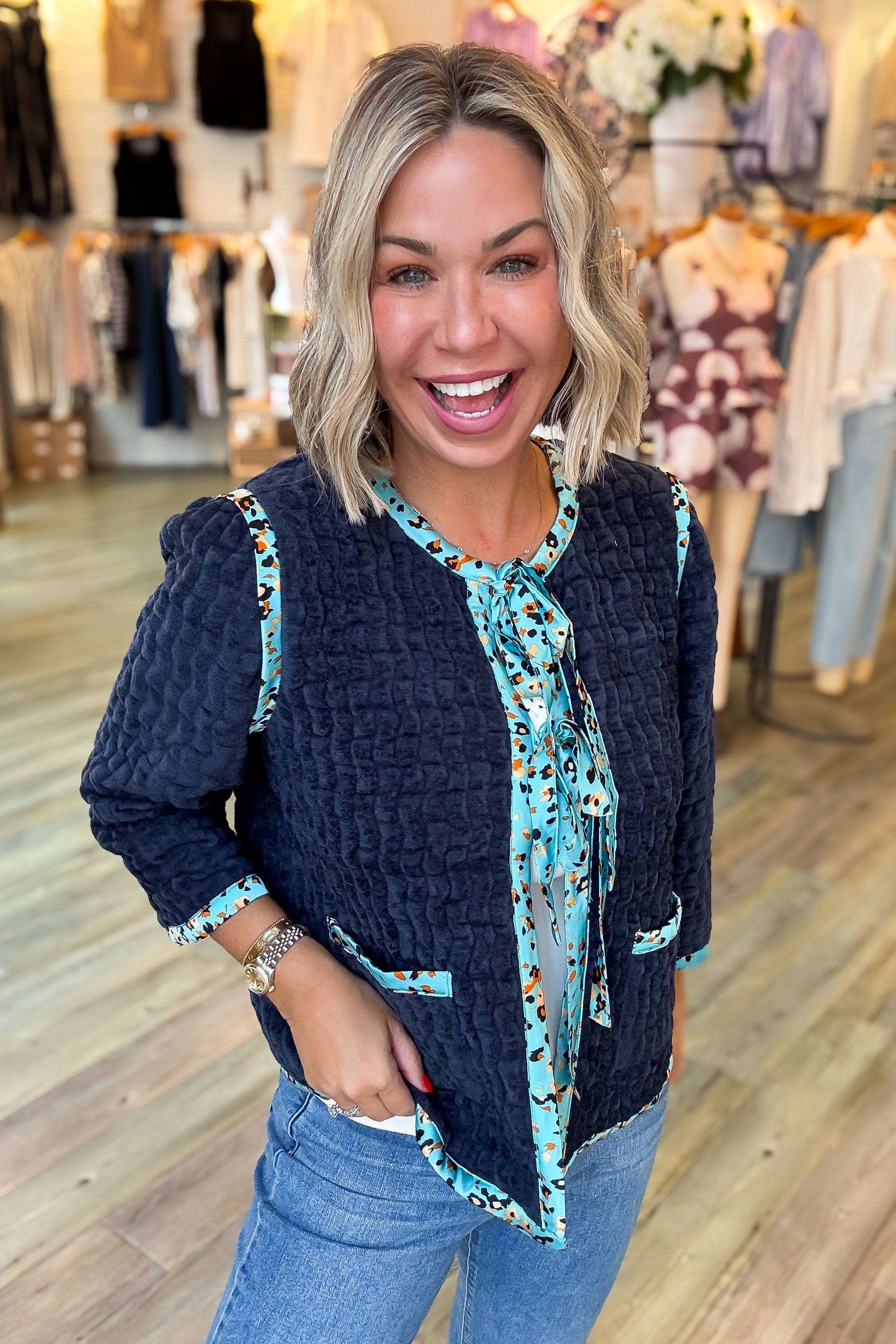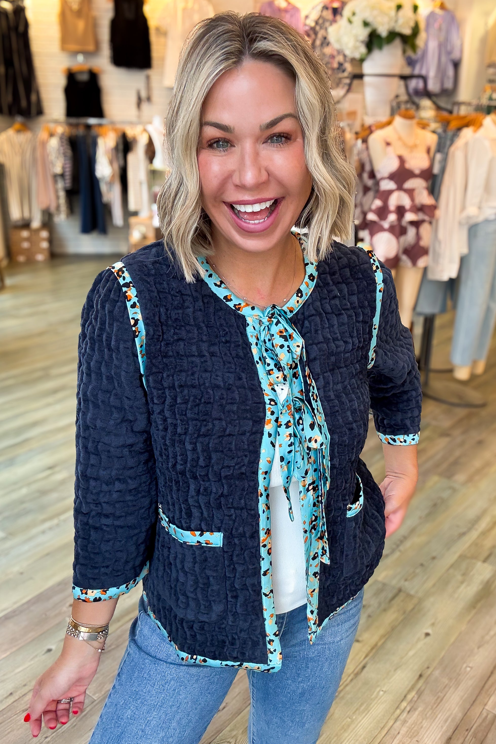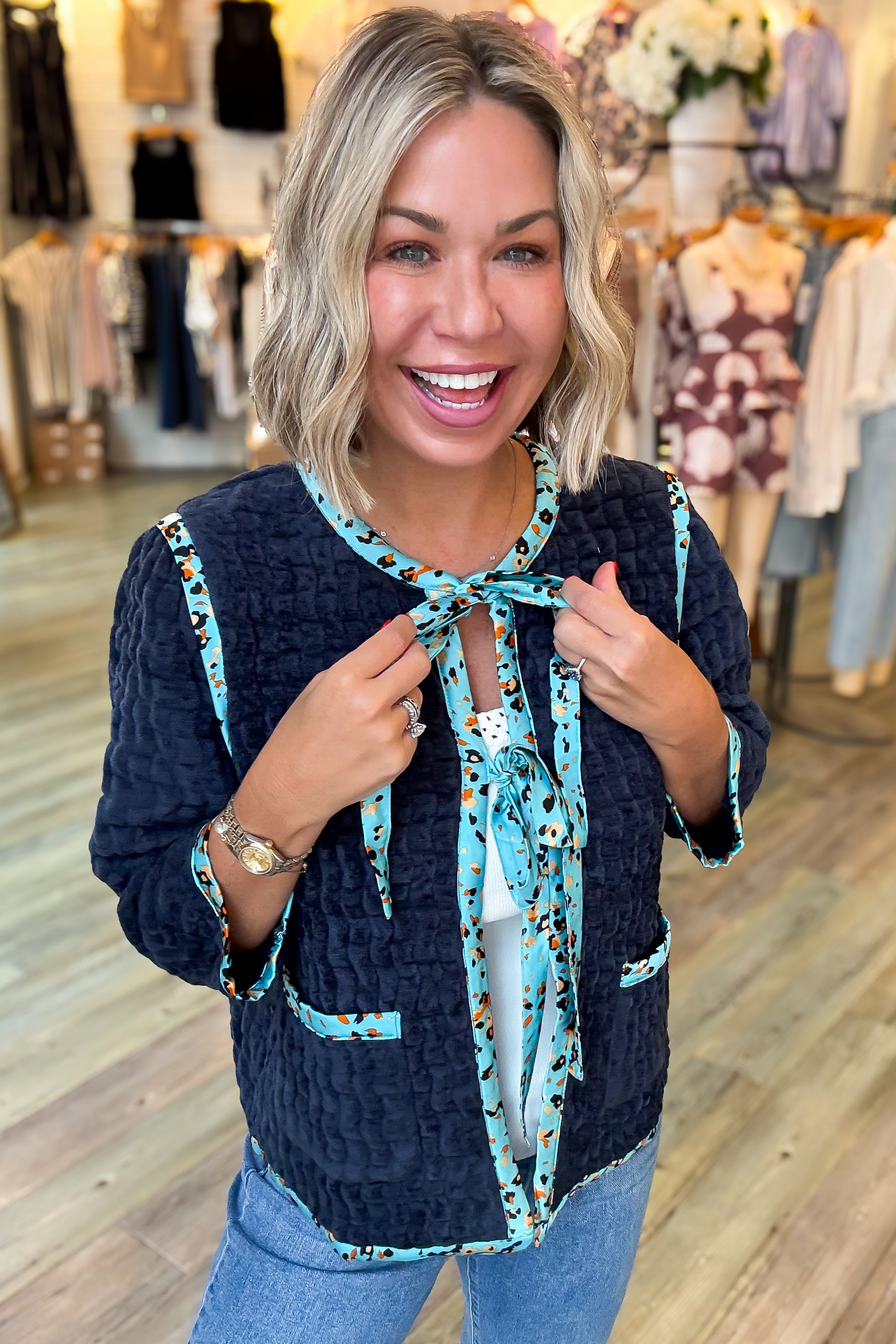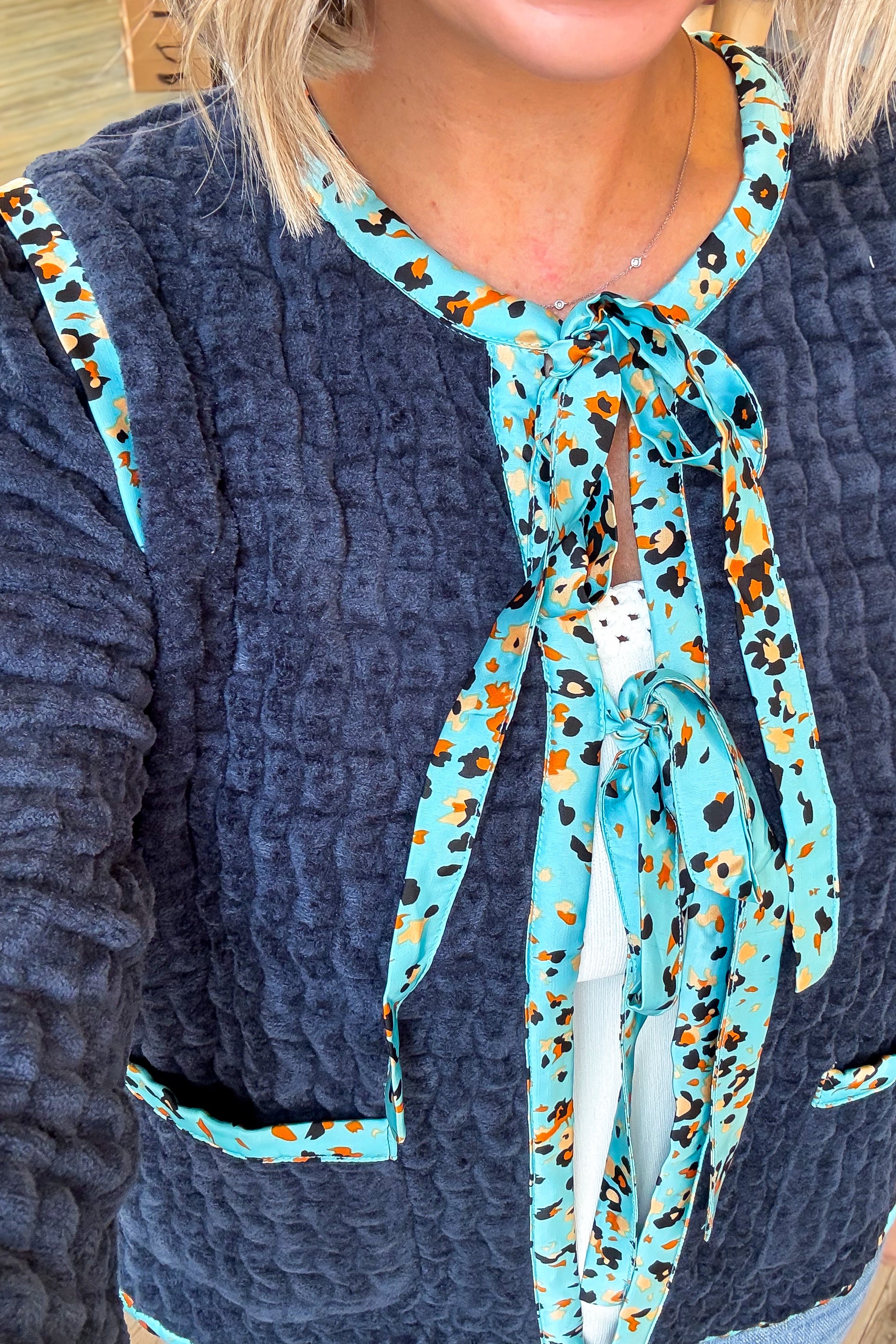 This Laura Navy Velour Jacket combines cozy terry velour fabric with stylish satin printed trim for a unique look. Featuring convenient front pockets and adjustable front ties, it offers both comfort and functionality. We recommend sizing down for the perfect fit. Ideal for adding a touch of elegance to your casual wardrobe while keeping you comfortable throughout the day.