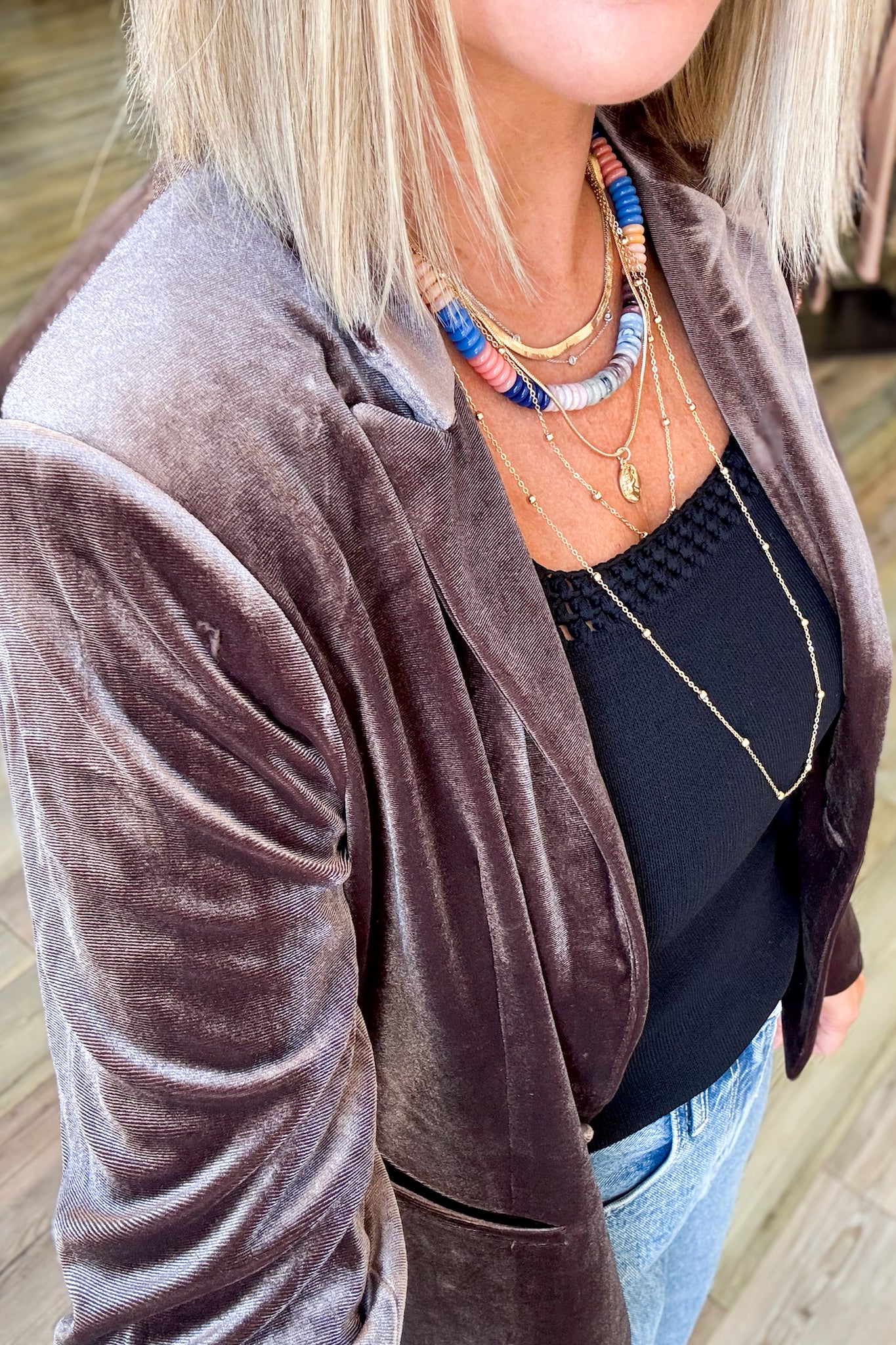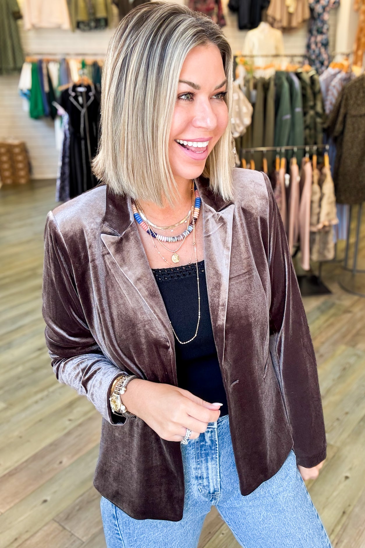 Elevate your wardrobe with the Laurel Brown Velvet Blazer, featuring a rich brown hue and soft velvet texture for a luxurious feel. This collared blazer offers a flattering fit with a single button closure at the midsection and a sleek slit in the back for ease of movement. Designed to run true to size, it combines timeless style with comfortable wear, making it a versatile addition to any outfit.