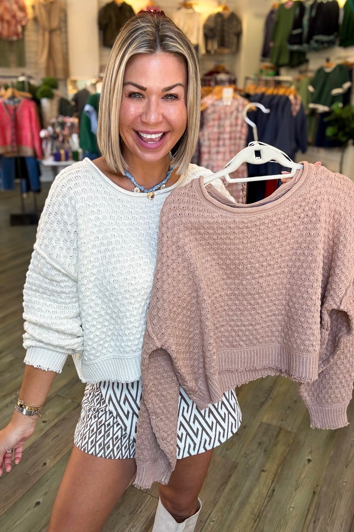 The Leslie Tan Textured Knit Sweater features a relaxed scoop neck and drop shoulder design for a comfortable, true-to-size fit. Its textured knit adds subtle depth and cozy warmth, making it a versatile piece for layering or wearing on its own. This sweater combines effortless style with everyday comfort.