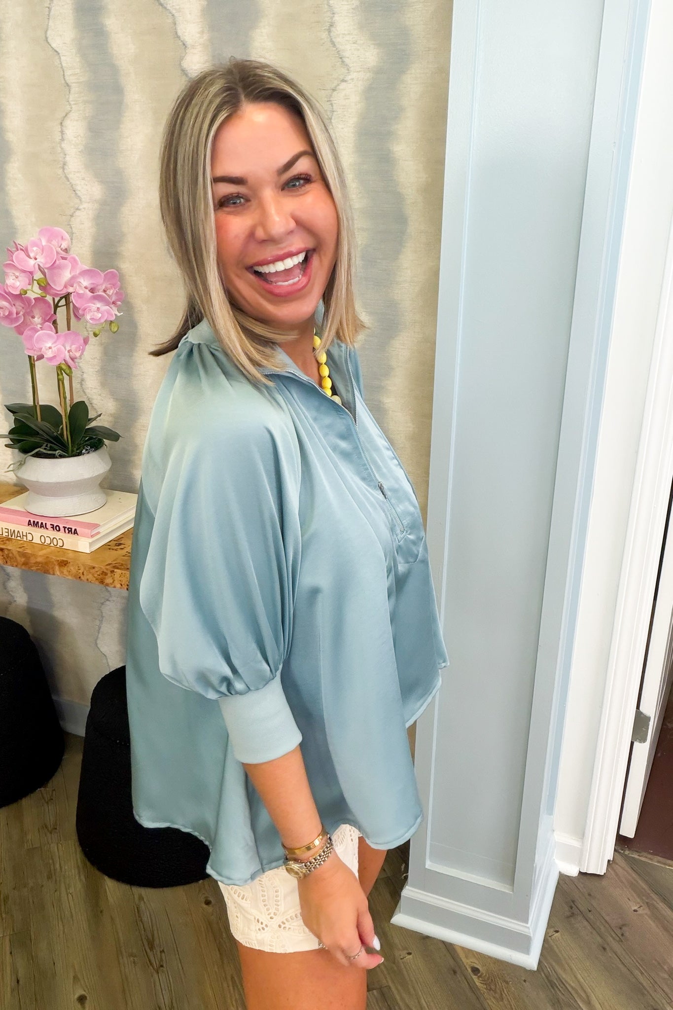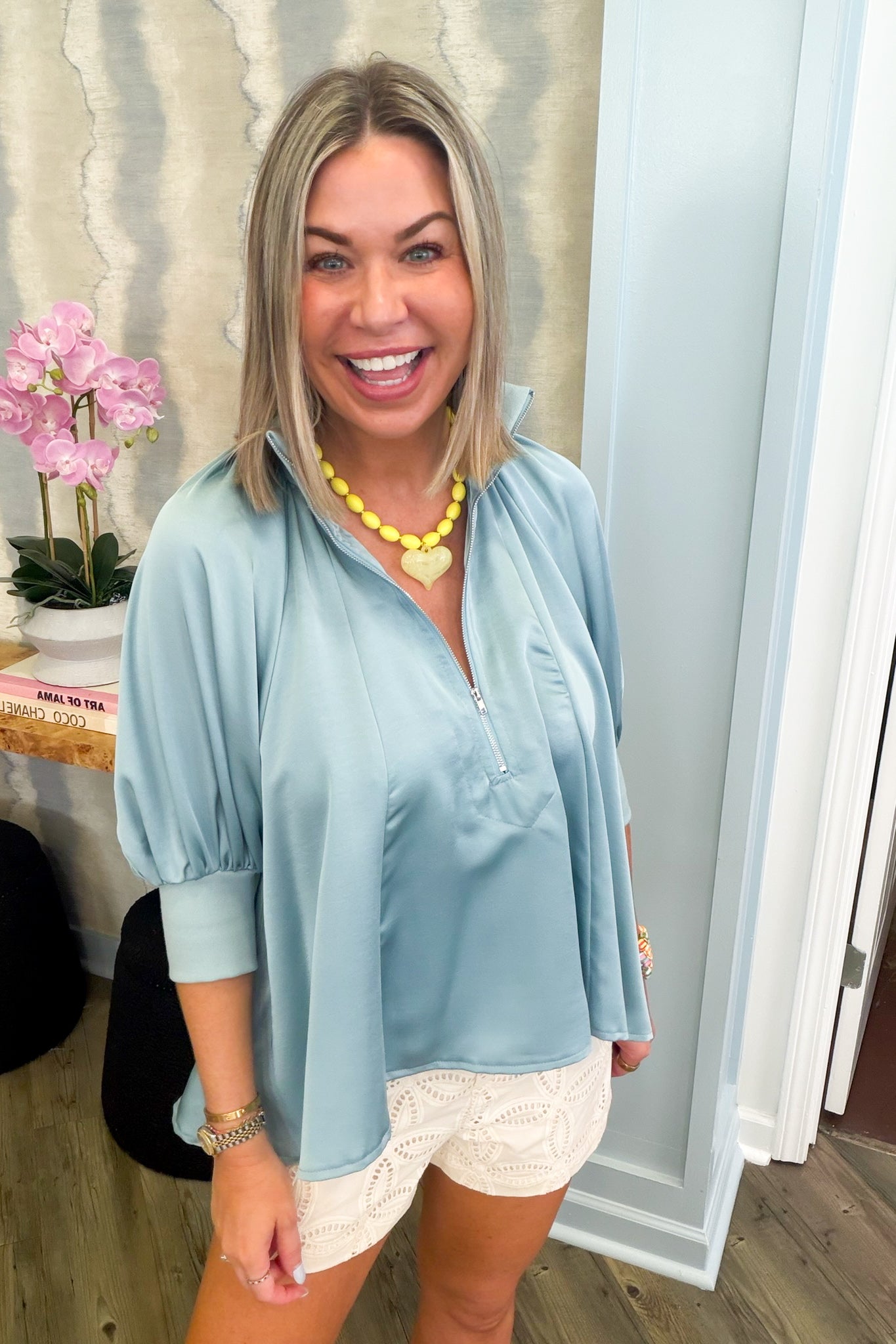 Upgrade your style with this elegant blue satin blouse, made from rich, flowing fabric. The blouse features cuffed sleeves for a refined, tailored look, and a practical front zipper offers modern adaptability and effortless styling. Ideal for any occasion, this versatile piece effortlessly moves from day to night. A classic staple that beautifully merges sophistication and modern design.