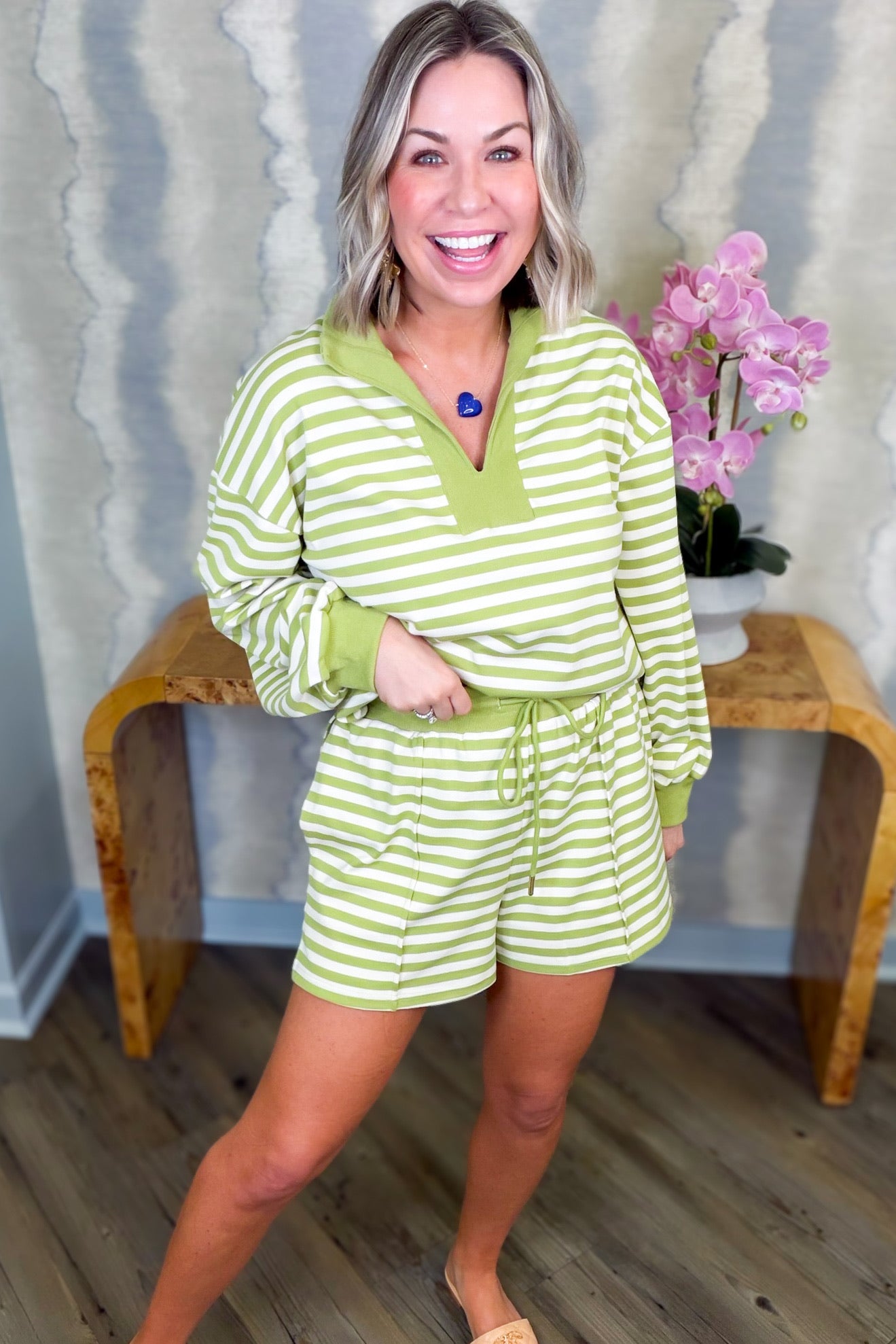 Get ready to turn heads in these Matcha Striped Shorts! Featuring a fun cream and green stripe design, they're the perfect blend of comfort and style. The elastic waist with a cute tie detail keeps you feeling great all day long, while hidden pockets are there when you need them most. Mix and match with the coordinating Matcha Striped Long Sleeve for a look that's totally on point. Your new summer essential just arrived.