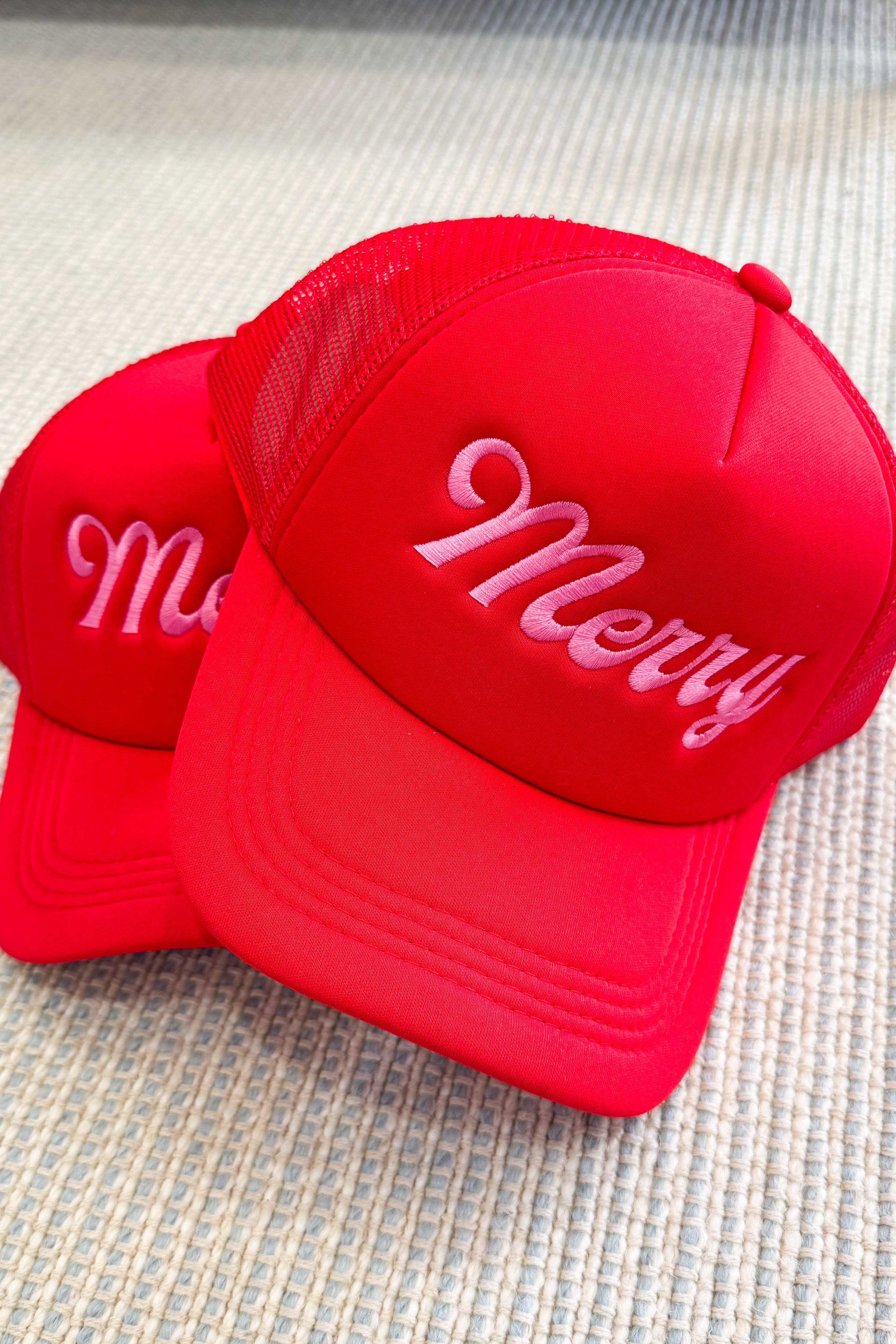 Stay cheerful and stylish with this red trucker hat featuring "Merry" embroidered in pink. Its breathable mesh back keeps you cool, while the adjustable snap closure ensures a comfortable fit. Perfect for adding a bright, positive touch to any outfit.