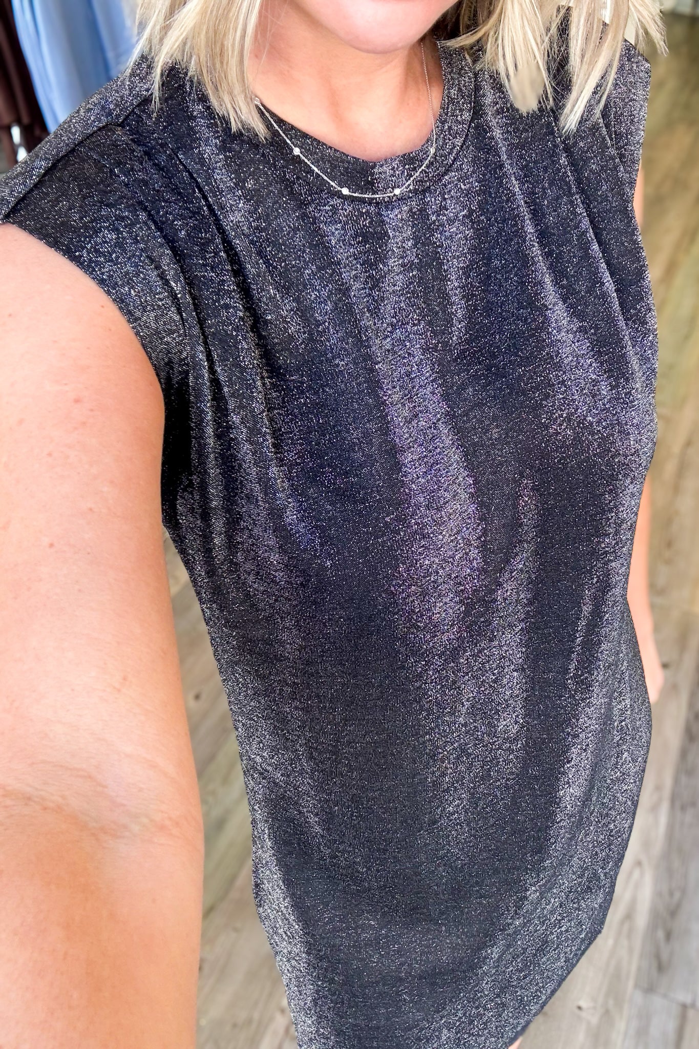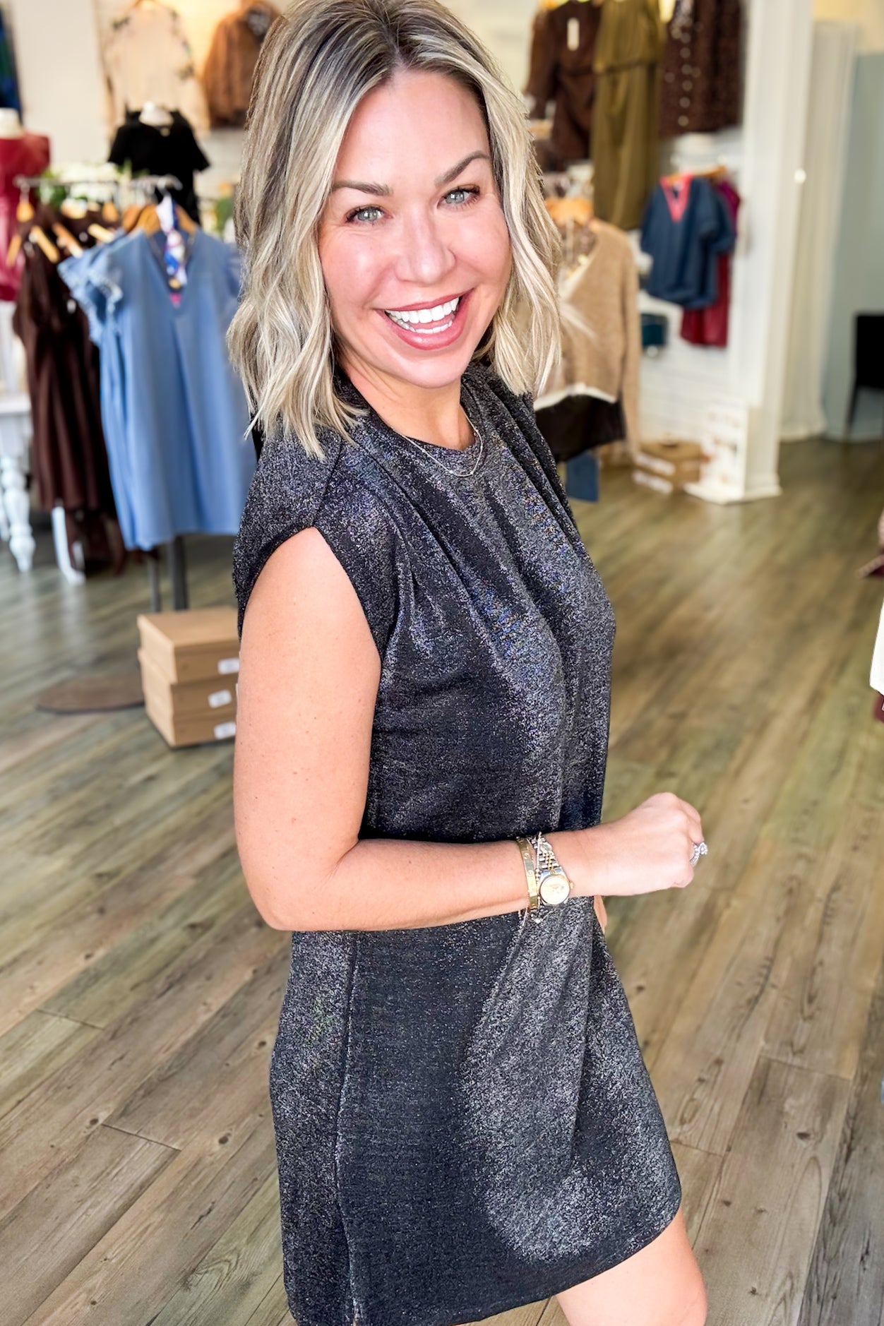 This Midnight Glitter Mini Dress features eye-catching black glitter fabric and muscle sleeves highlighted by elegant pleats at the shoulders. Designed to fit true to size, it offers a comfortable yet flattering silhouette perfect for evenings when you want to shine with confidence and style.