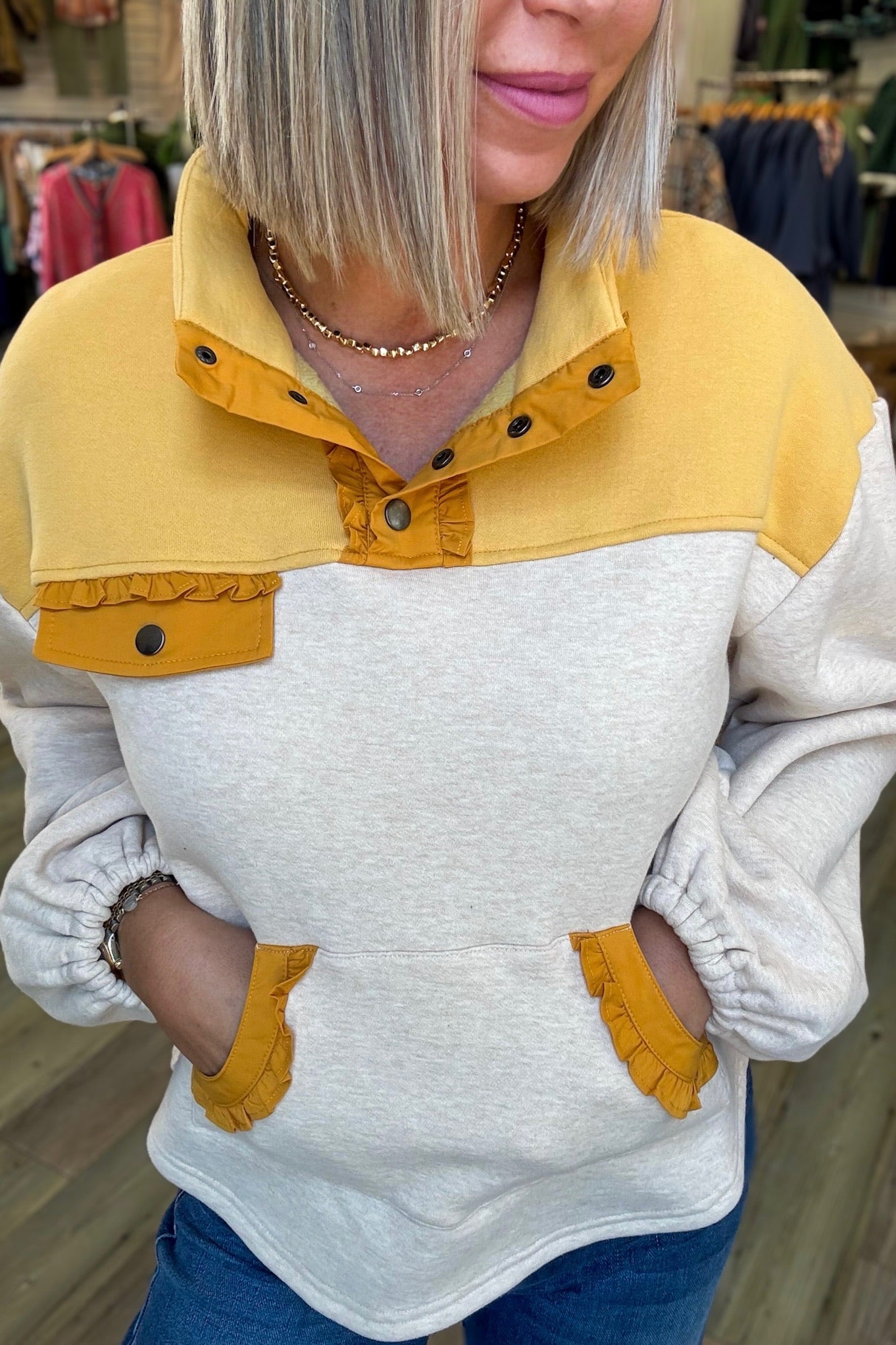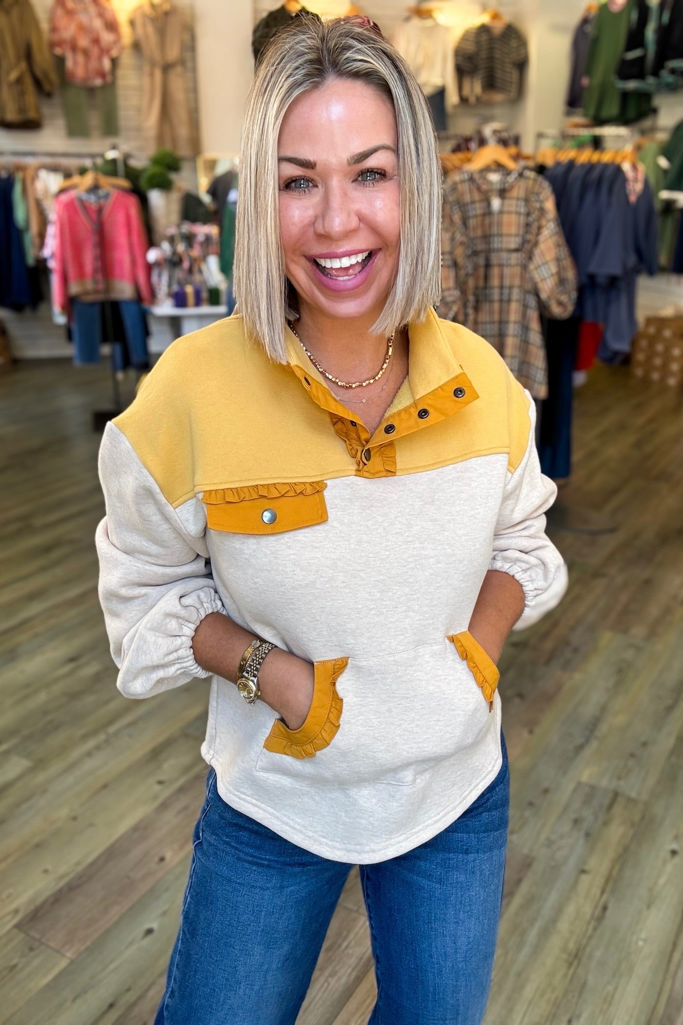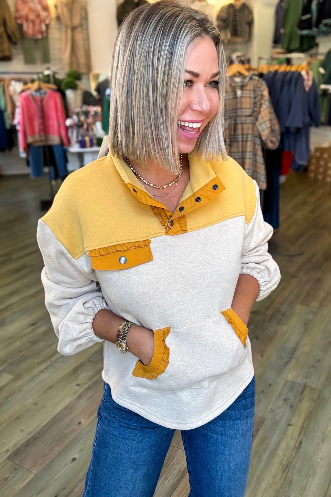 This mustard yellow sweatshirt features a heathered oatmeal colorblock design with charming ruffle details for a unique touch. The quarter snap button-up front and convenient front pocket add both style and practicality. Made from soft, cozy fabric, it offers comfortable wear and true-to-size fit, perfect for everyday layering.
