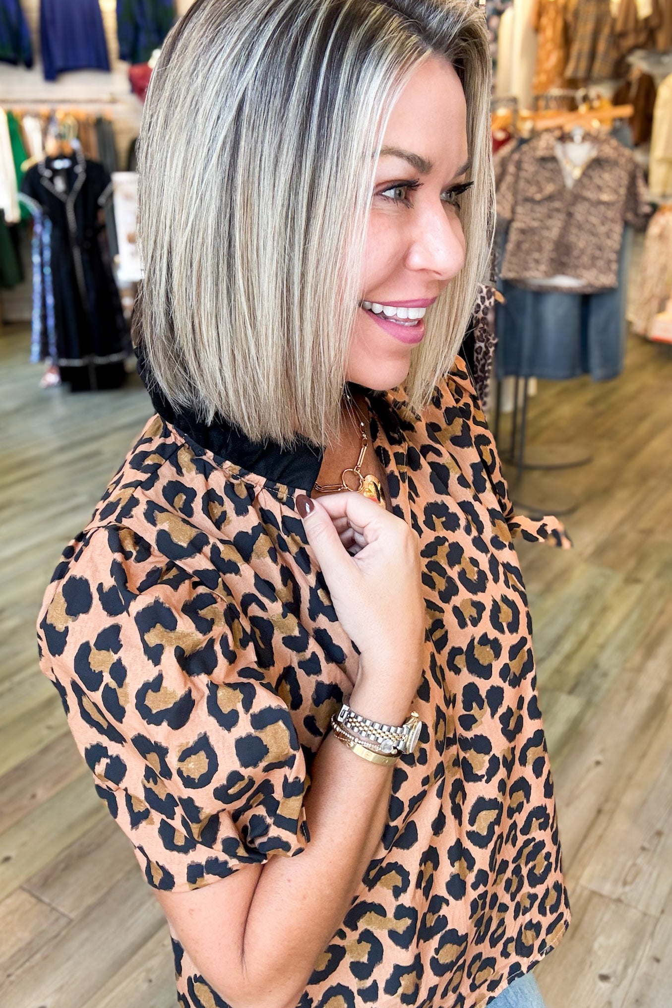 The Nala Leopard Print Top features a stylish brown leopard pattern with a contrasting black collar and flattering V-neck. Designed with short sleeves and a chic tie detail, it offers a versatile look for any occasion. The fit allows you to size down comfortably for a more tailored silhouette, ensuring both style and confidence throughout your day.