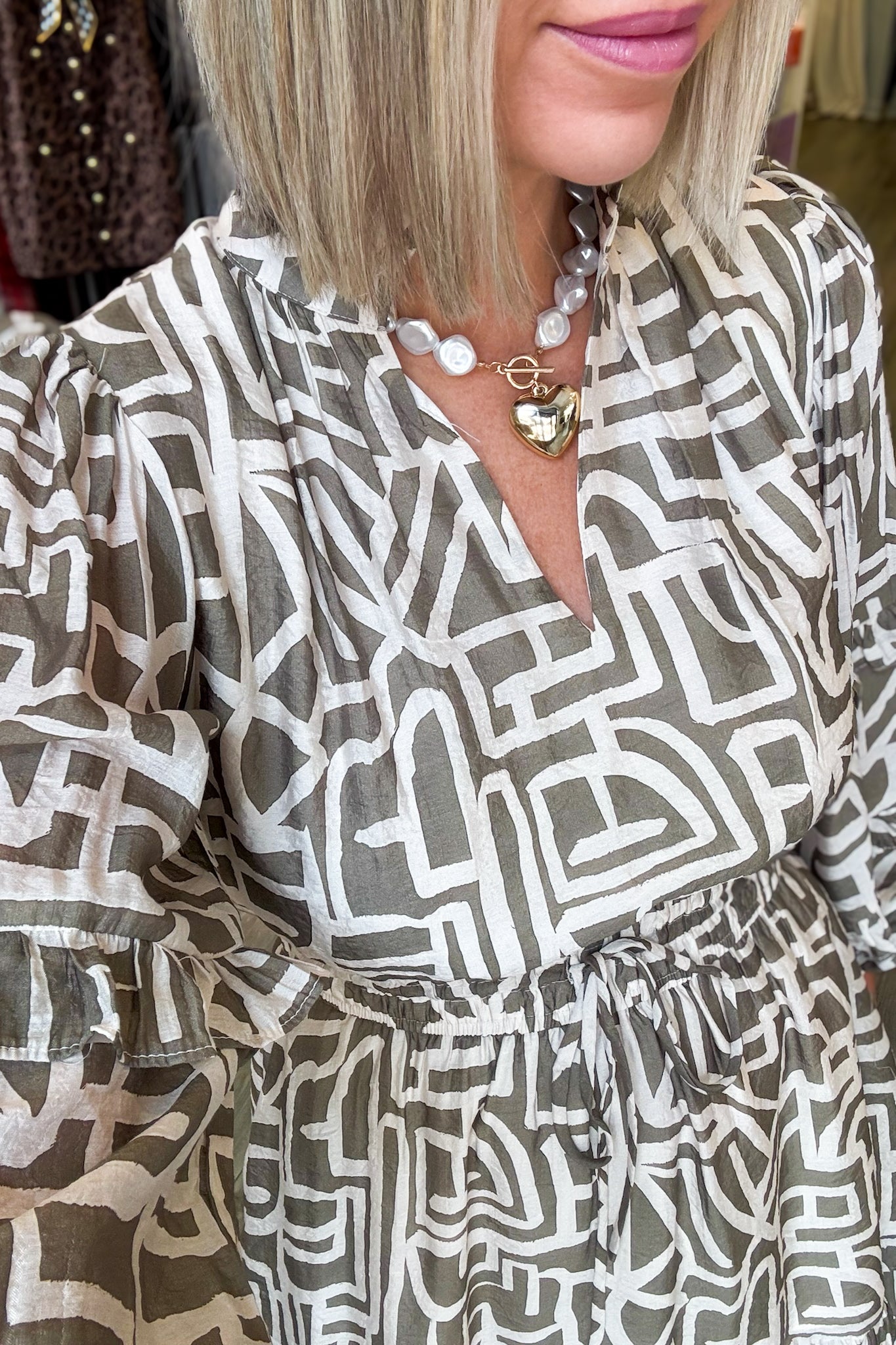 The Nova Patterned Mini Dress features a charming green and cream design with a flattering V-neckline and long sleeves. Its smocked waist with a drawstring offers a comfortable, adjustable fit that enhances your silhouette. The mini length adds a playful touch, and the dress runs slightly large, so sizing down is recommended for the best fit. Perfect for both casual outings and special occasions, this dress combines style and comfort effortlessly.