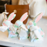 Bring springtime charm to your home with this delightful 7-inch wooden bunny, lovingly painted by local artist Rachel Maples. Dressed in soft pastels and sporting an elegant white silk bow, this hand-painted hop-along friend is ready to hop into your Easter celebrations and brighten any corner of your space.