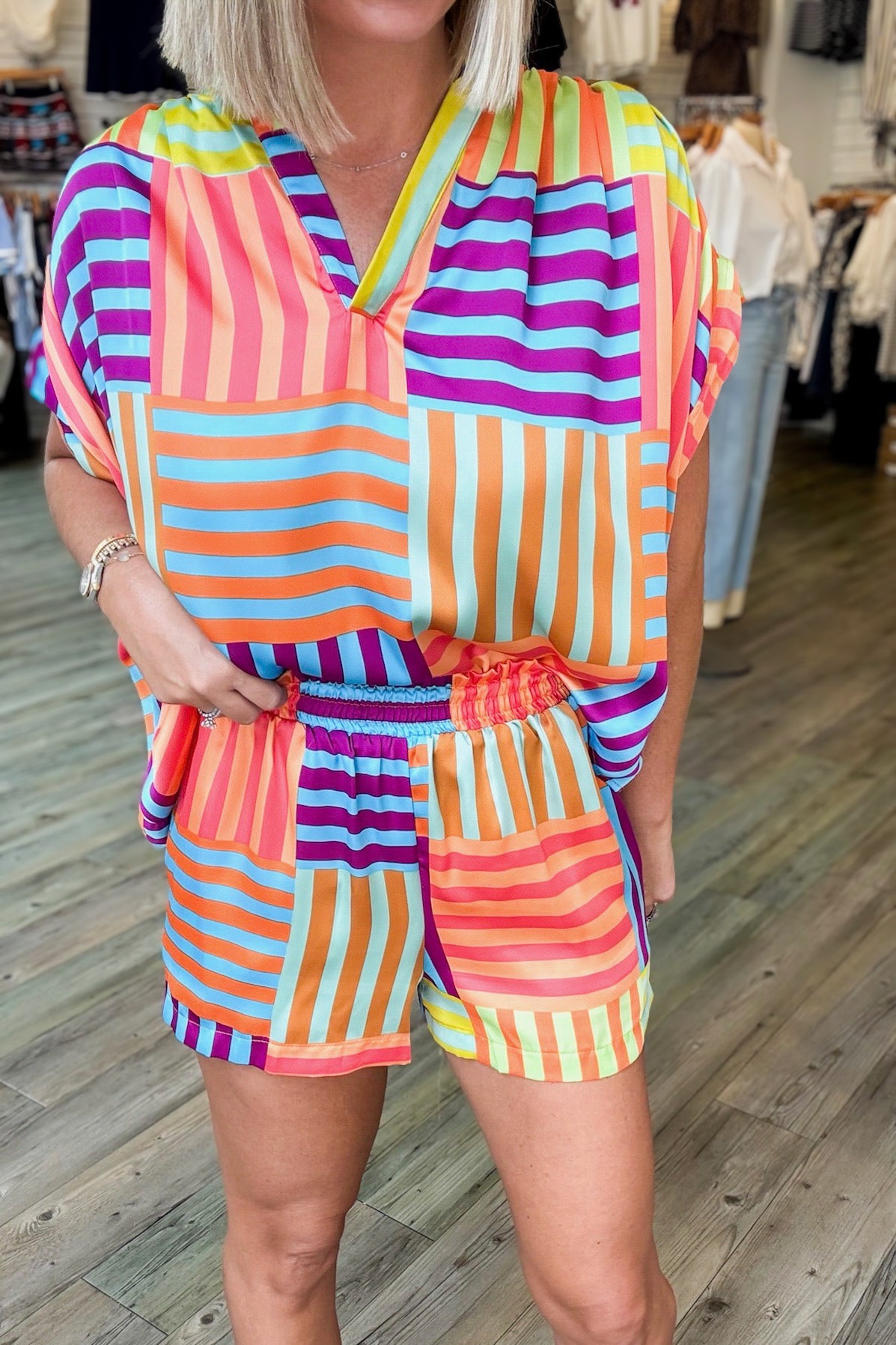 These Parquet Colorblock Shorts combine vibrant multicolor satin fabric with a comfortable elastic waistband for a perfect fit. Designed with practical pockets and true-to-size sizing, they offer both style and ease for your everyday wear.