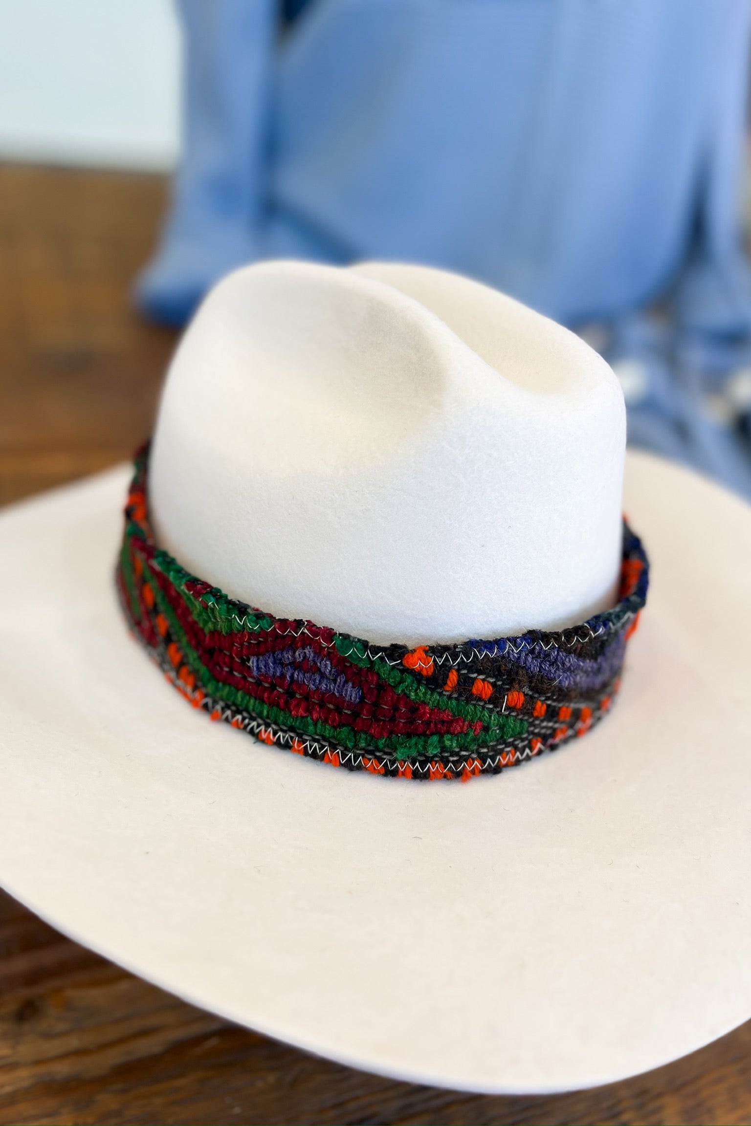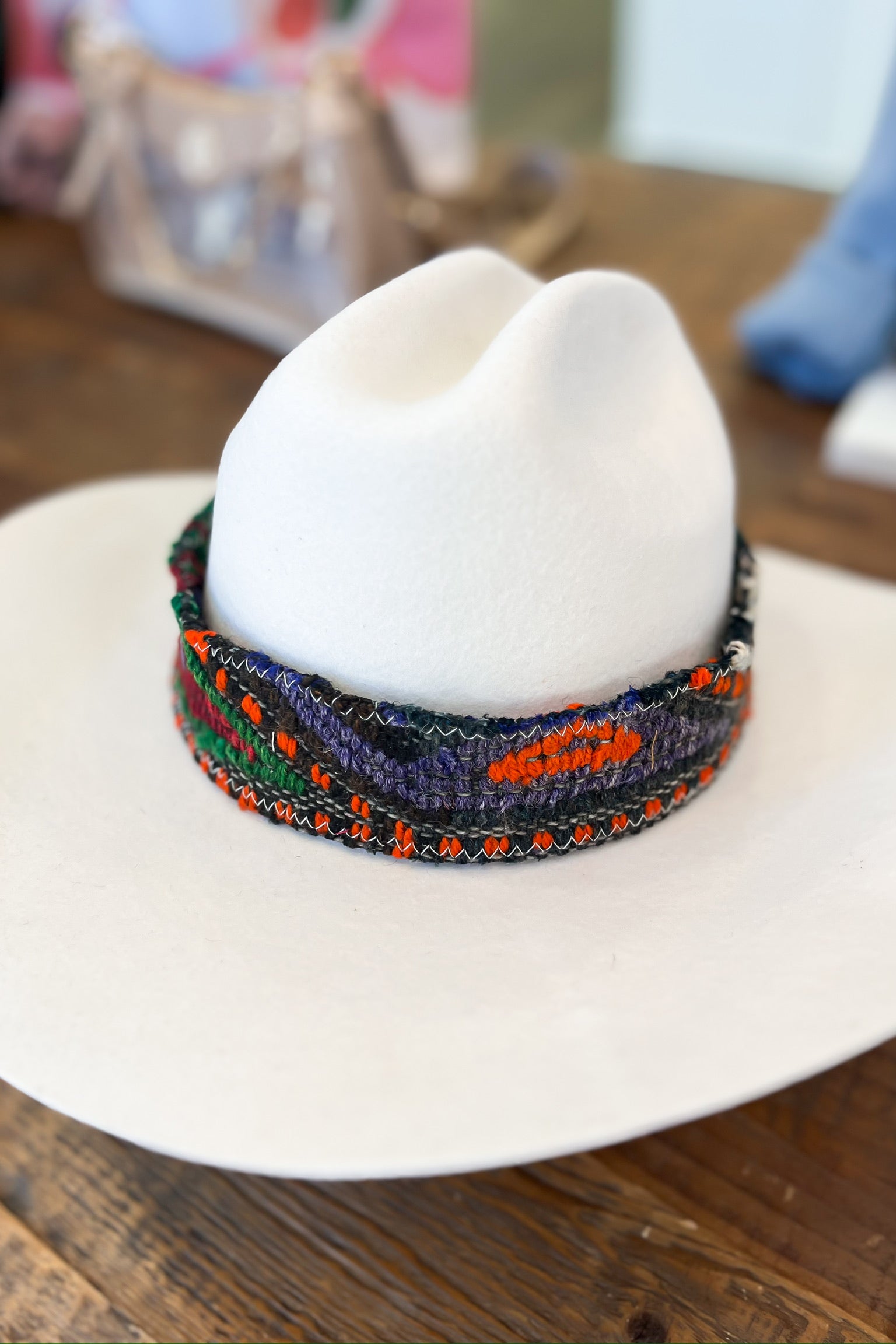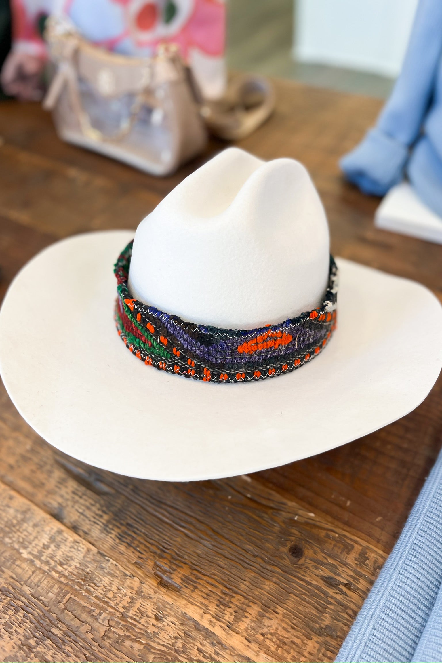 Introducing the PEGGY ORIJINAL WESTERN KILIM BAND HAT - a stylish and unique ivory felt cowboy hat with a one-of-a-kind Turkish rug hat band. Perfect for adding a touch of rustic charm to any outfit. Stand out from the crowd and make a statement with this one-of-a-kind hat.