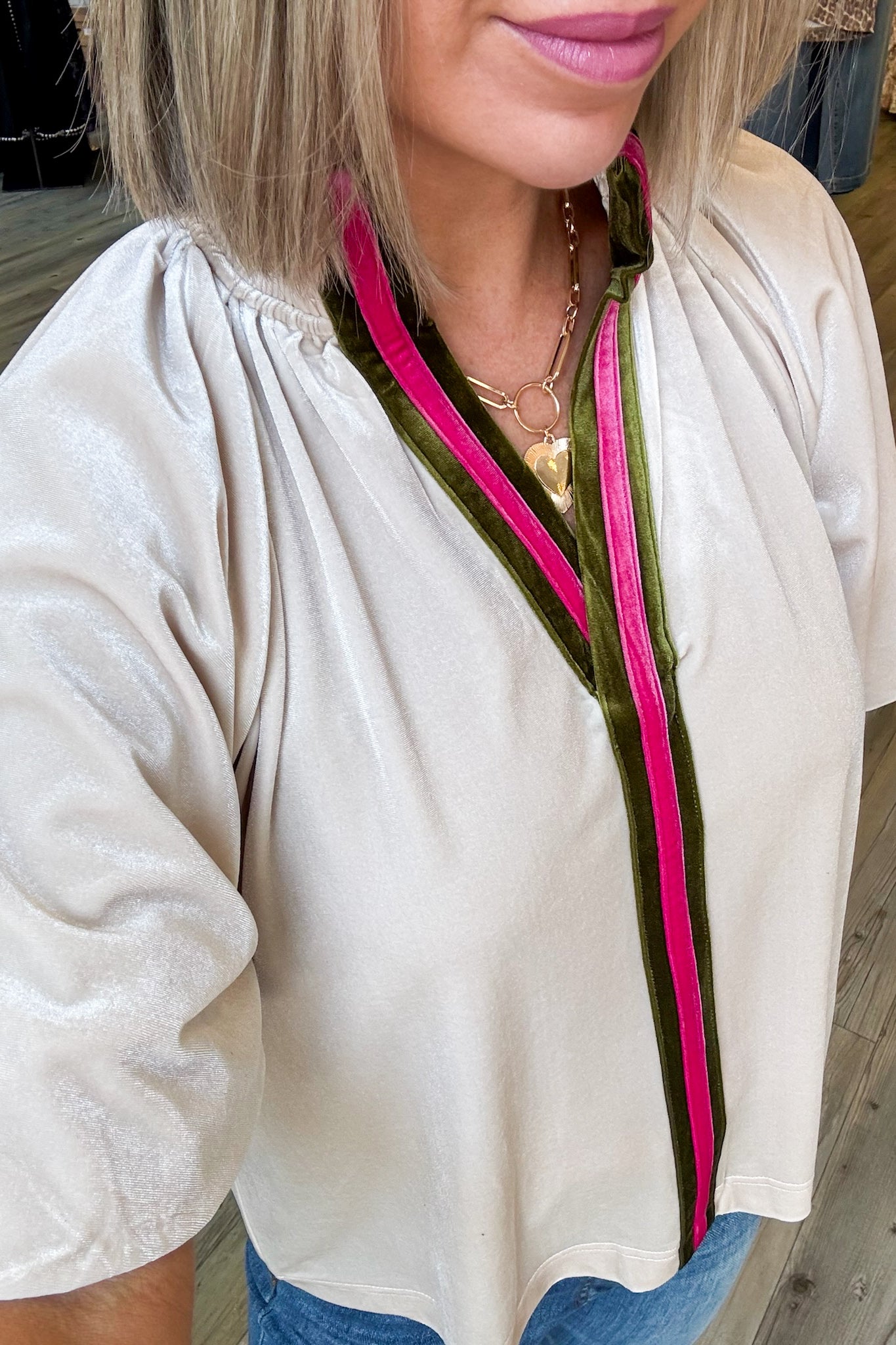 The Penelope Cream Suede Top features a soft cream suede fabric accented with green and pink suede lining along the center and V-neck, adding a subtle pop of color. Its puff sleeves create a flattering silhouette, and the design allows for sizing down for a perfect fit. Comfortable and stylish, this top is a versatile addition to your wardrobe.