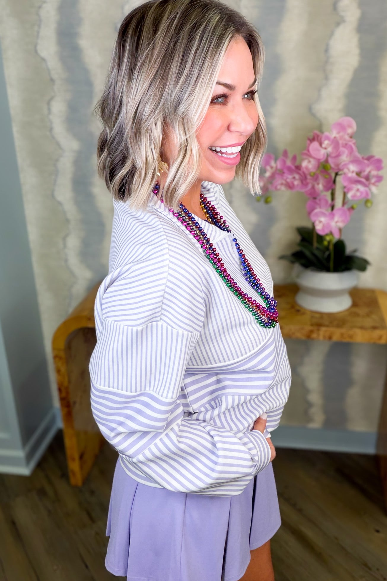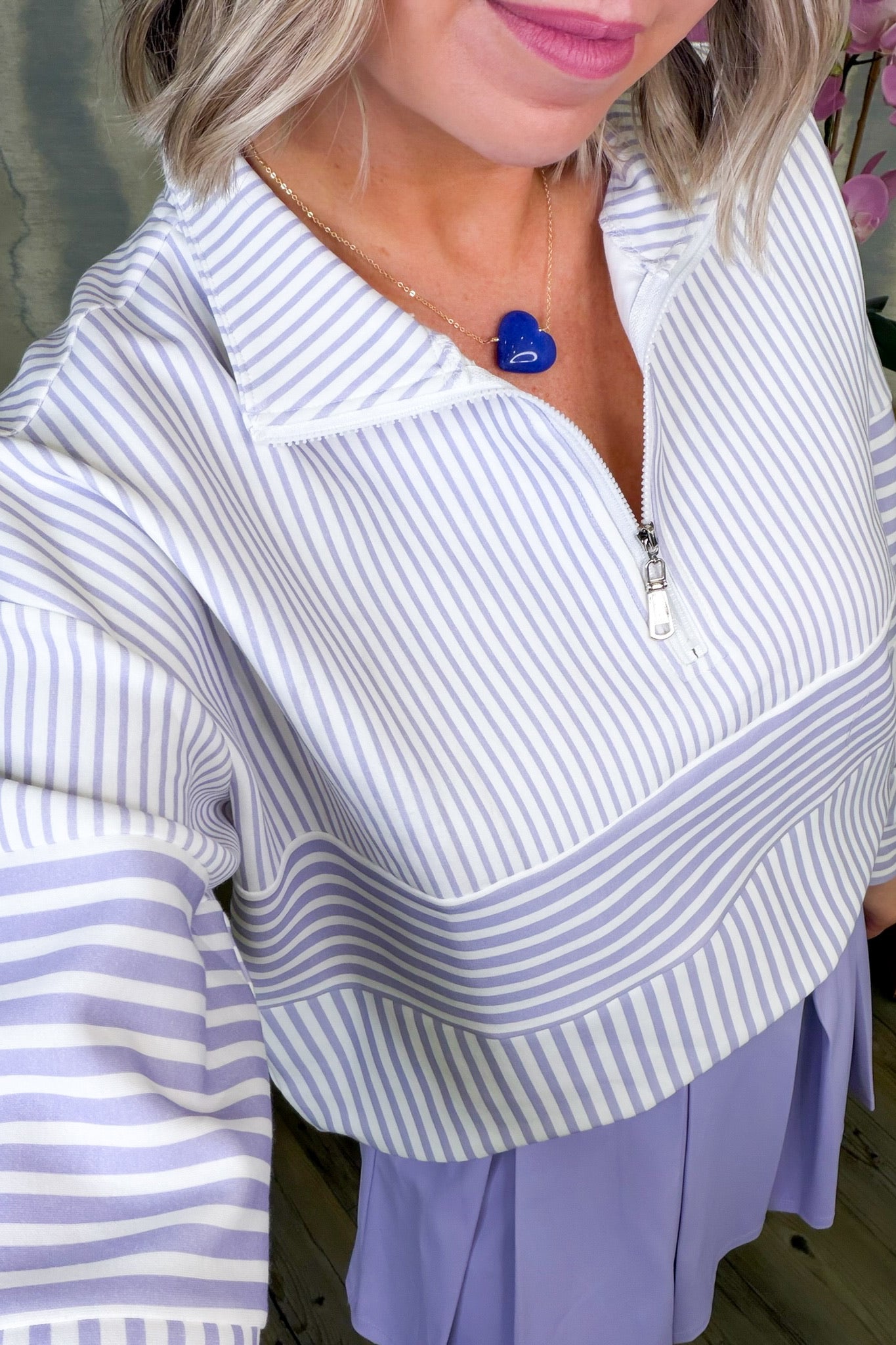 The Penny Striped Quarter Zip brings a pop of personality to your everyday rotation. Featuring bold white and purple stripes with a sleek silver zipper, this piece strikes the perfect balance between fun and functional. The relaxed fit runs true to size, making it easy to grab your usual and go. Layer it over your favorite tee or wear it solo—either way, you've got a versatile staple that's ready for whatever the day throws at you.