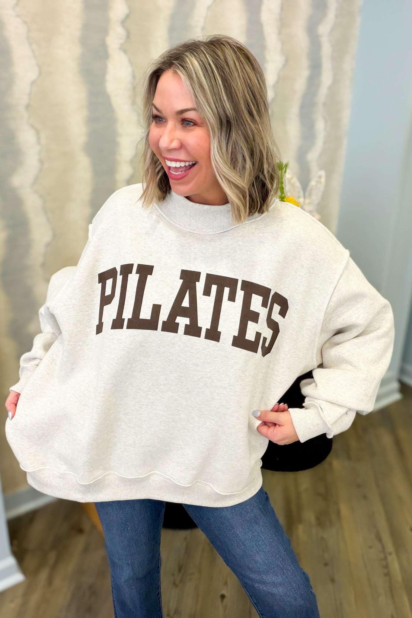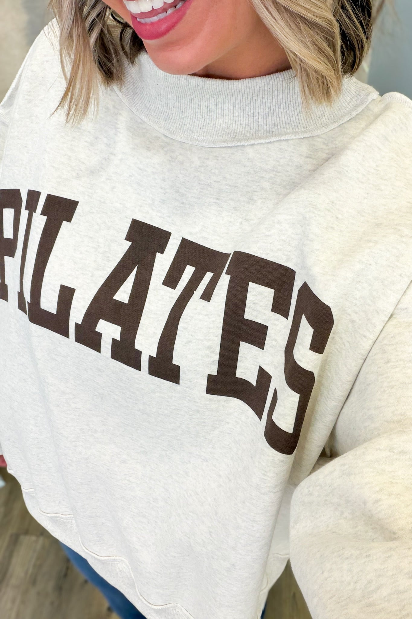 Versatile and comfortable, this reversible mockneck sweatshirt transitions seamlessly from studio to street. The oversized silhouette provides ease of movement for pilates and yoga, while the soft gray fabric offers a neutral base for any outfit. Flip it inside out for a fresh look, making this one piece work double duty in your activewear rotation.