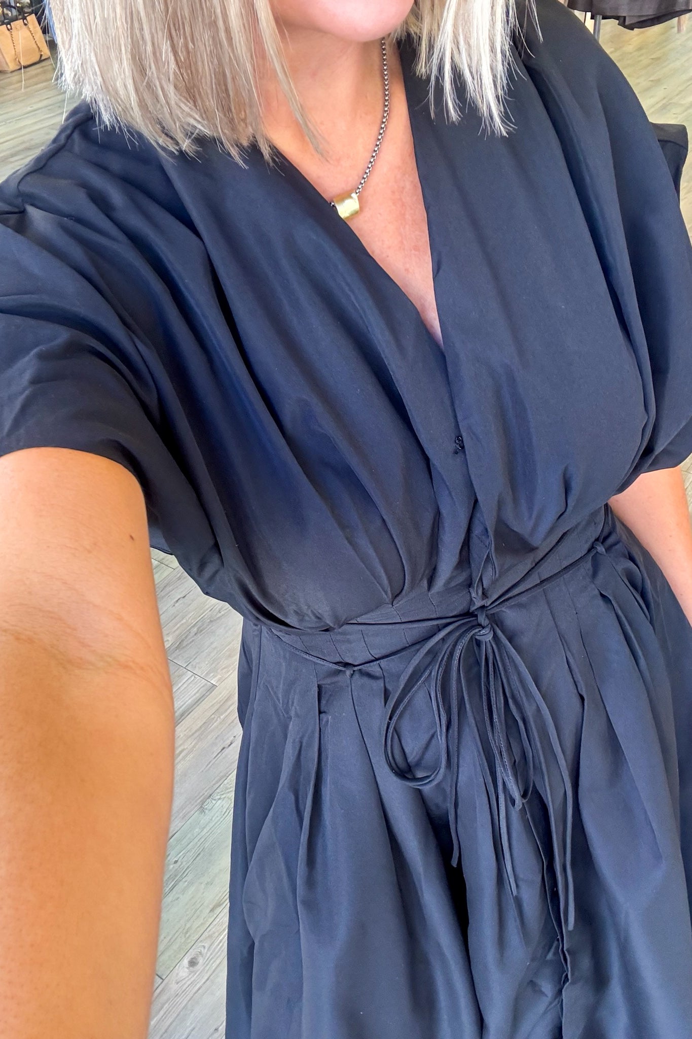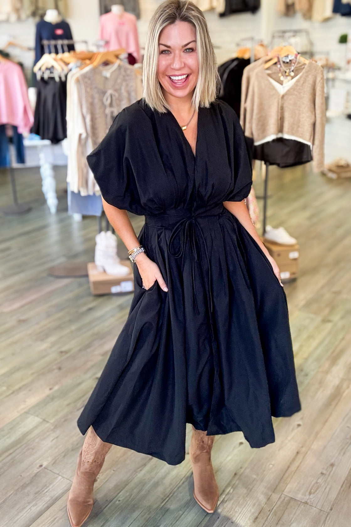 Effortlessly chic and undeniably fun, this black pleated midi dress is your new go-to for looking polished without trying too hard. The flattering v-neck draws the eye upward, while the playful tie-front detail adds a flirty touch that keeps things interesting. Pleats throughout create beautiful movement and dimension, making every step feel like a mini fashion moment. Perfect for brunch, date night, or whenever you want to feel put-together and fabulous.