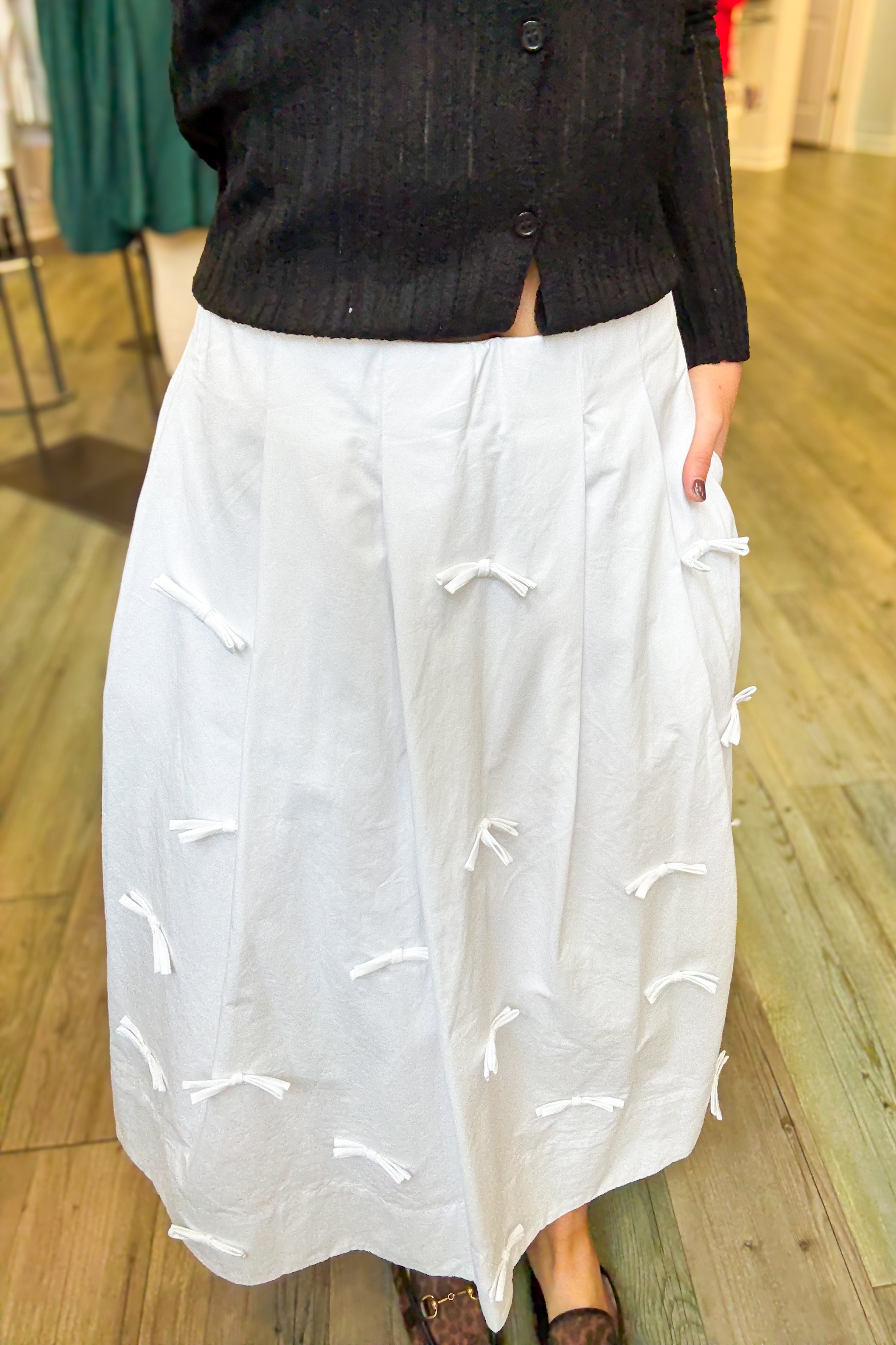 The Kelli Bow Skirt brings effortless charm to your everyday rotation. This crisp white midi silhouette features an adorable bow detail that adds a touch of whimsy, while the lined interior keeps things comfortable and modest. A sleek side zipper makes getting dressed a breeze. Perfect for brunch dates, office days, or whenever you want to feel put-together with personality.