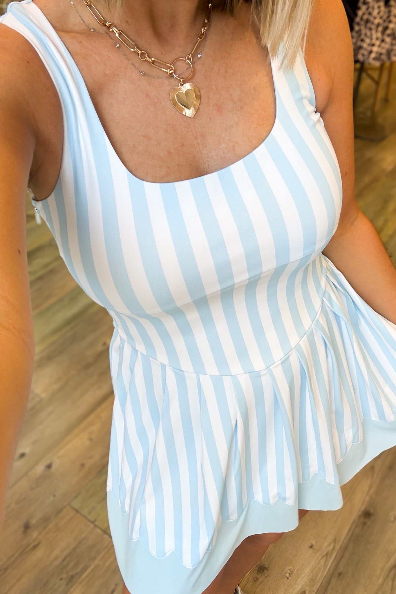 Move through your day with unstoppable confidence in the Eliza Blue Active Dress. This bold piece features a striking light blue wide stripe pattern that commands attention, while the scallop-shaped solid hem adds an unexpected edge to traditional activewear. Designed for those who refuse to blend in, it transitions seamlessly from gym sessions to casual outings. The structured silhouette keeps you supported and ready for anything, making it the perfect choice for athletes who dress like they mean business.