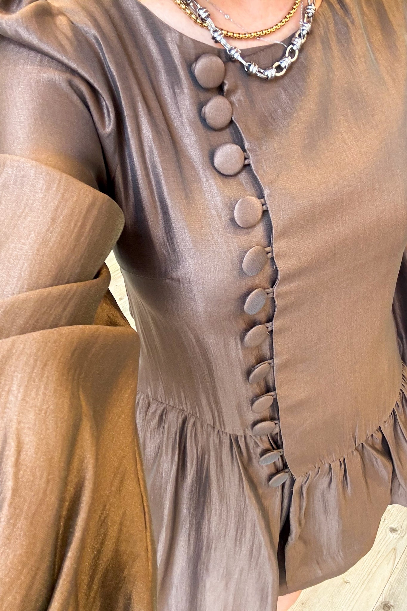 Indulge in the rich and warm tones of our Hayden Espresso Button Dress. This stunning long sleeve dress features a flattering asymmetric cut and charming button detail on the front. Perfect for making a statement at any event, this dress exudes elegance and sophistication. Elevate your wardrobe with this luxurious and versatile piece.
