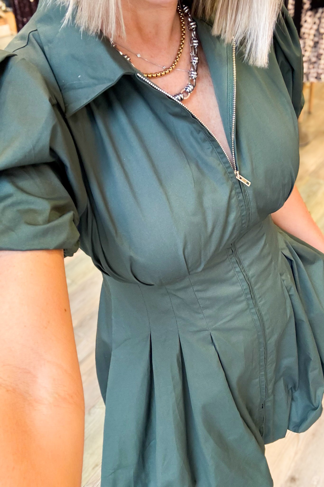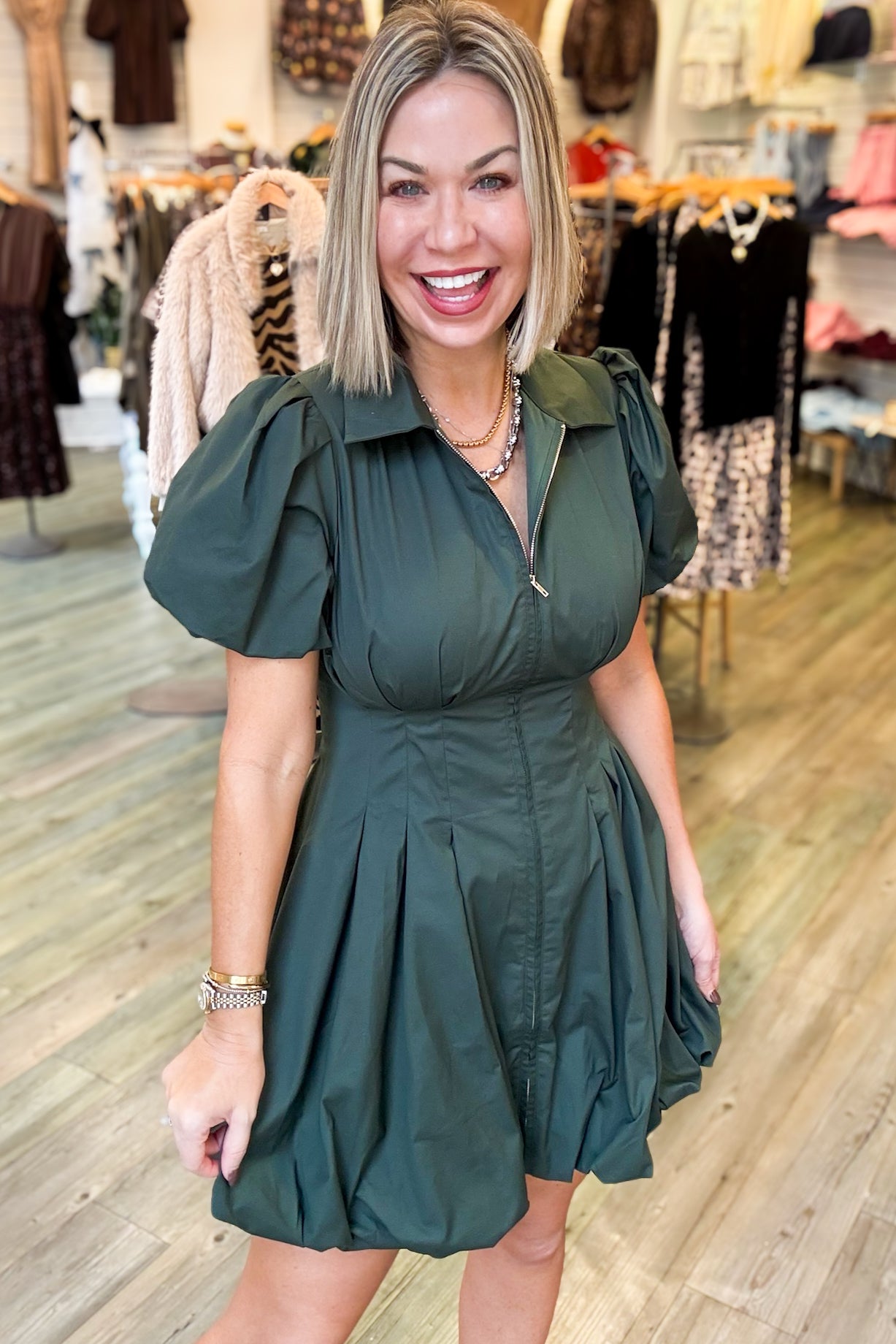 Elevate your style with the Cali Hunter Green Dress. This gorgeous olive dress features a front zipper and cinched waistline, adding a touch of unique charm to your wardrobe. Perfect for any occasion, this dress will make you feel confident and stylish. Don't miss out on this must-have piece!